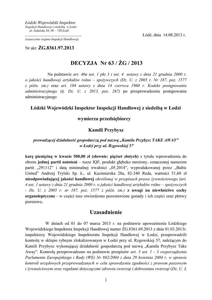 Łódzki Wojewódzki Inspektor Inspekcji Handlowej z siedzibą w Łodzi ul. Gdańska 38, 90 – 730 Łódź Łódź, dnia 14.08.2013 r. ..................................................... (oznaczenie organu Inspekcji Handlowej) Nr akt: ŻG.8361.97.2013 DECYZJA Nr 63 / ŻG / 2013 Na podstawie art. 40a ust. 1 pkt 3 i ust. 4 ustawy z dnia 21 grudnia 2000 r. o jakości handlowej artykułów rolno – spożywczych (Dz. U. z 2005 r. Nr 187, poz. 1577 z późn. zm.) oraz art. 104 ustawy z dnia 14 czerwca 1960 r. Kodeks postępowania administracyjnego (tj. Dz. U. z 2013, poz. 267) po przeprowadzeniu postępowania administracyjnego Łódzki Wojewódzki Inspektor Inspekcji Handlowej z siedzibą w Łodzi wymierza przedsiębiorcy Kamili Przybysz prowadzącej działalność gospodarczą pod nazwą „Kamila Przybysz TAKE AWAY” w Łodzi przy ul. Rzgowskiej 57 karę pieniężną w kwocie 500,00 zł (słownie: pięćset złotych) z tytułu wprowadzenia do obrotu jednej partii nototeni – tusze IQF, produkt głęboko mrożony, oznaczonej numerem partii „291112” i datą minimalnej trwałości „05.2014”, wyprodukowanej przez „Baltic United” Andrzej Trylski Sp. k., ul. Kazimierska 28a, 82-340 Reda, wartości 51,60 zł nieodpowiadającej jakości handlowej określonej w przepisach prawa żywnościowego (art. 4 ust. 1 ustawy z dnia 21 grudnia 2000 r. o jakości handlowej artykułów rolno – spożywczych - Dz. U. z 2005 r. nr 187, poz. 1577 z późn. zm.) z uwagi na niewłaściwe cechy organoleptyczne - w części tusz stwierdzono pozostawione gonady i ich części oraz płetwy piersiowe. Uzasadnienie W dniach od 01 do 07 marca 2013 r. na podstawie upoważnienia Łódzkiego Wojewódzkiego Inspektora Inspekcji Handlowej numer ŻG.8361.69.2013 z dnia 01.03.2013r. inspektorzy Wojewódzkiego Inspektoratu Inspekcji Handlowej w Łodzi, przeprowadzili kontrolę w sklepie rybnym zlokalizowanym w Łodzi przy ul. Rzgowskiej 57, należącym do Kamili Przybysz wykonującej działalność gospodarczą pod nazwą „Kamila Przybysz Take Away”. Kontrolę przeprowadzono na podstawie przepisów art. 3 ust. 1 - 3 rozporządzenia Parlamentu Europejskiego i Rady (WE) Nr 882/2004 z dnia 29 kwietnia 2004 r. w sprawie kontroli urzędowych przeprowadzanych w celu sprawdzenia zgodności z prawem paszowym i żywnościowym oraz regułami dotyczącymi zdrowia zwierząt i dobrostanu zwierząt (Dz. U. L 1 165 z 30.4.2004 ze zm.), art. 17 ust. 3 ustawy z dnia 21 grudnia 2000 r. o jakości handlowej artykułów rolno-spożywczych (Dz. U. z 2005 r. nr 187, poz. 1577, z późn. zm.), art. 3 ust. 1 pkt 1, 2 i 6 ustawy z dnia 15 grudnia 2000 r. o Inspekcji Handlowej (Dz. U. z 2009 r. Nr 151, poz. 1219 ze zm.) w obecności właścicielki Kamili Przybysz. W toku kontroli w dniu 04 marca 2013 r. pobrano do badań laboratoryjnych próbkę w ilości 1,04 kg nototeni – tusze IQF, produkt głęboko mrożony, oznaczonej numerem partii „291112” i datą minimalnej trwałości „05.2014”, wyprodukowanej przez „Baltic United” Andrzej Trylski Sp. k., ul. Kazimierska 28a, 82-340 Reda. Próbka przedmiotowego produktu została opisana w protokole pobrania próbki numer 00663 i przekazana do Laboratorium Kontrolno-Analitycznego Urzędu Ochrony Konkurencji i Konsumentów z siedzibą w Katowicach, ul. Brata Alberta 4 celem przeprowadzenia badań organoleptycznych i fizyczno-chemicznych. W wyniku przeprowadzonych analiz stwierdzono, że badana nototenia posiadała niewłaściwe cechy organoleptyczne - w części tusz pozostawione były gonady i ich części oraz płetwy piersiowe, co narusza art. 4 ust. 1 ustawy z dnia 21 grudnia 2000 r. o jakości handlowej artykułów rolno – spożywczych - Dz. U. z 2005 r. Nr 187, poz. 1577 z późn. zm. zwanej dalej „ustawą o jakości”. Powyższe nieprawidłowości zostały udokumentowane w sprawozdaniu z badań numer 87/2013 z dnia 11 marca 2013 r. wystawionym przez Laboratorium KontrolnoAnalityczne Urzędu Ochrony Konkurencji i Konsumentów z siedzibą w Katowicach, ul. Brata Alberta 4 oraz w protokole kontroli z dnia 19 marca 2013 r. (numer akt kontroli ŻG.8361.97.2013). Po zapoznaniu się z wynikami badań przedsiębiorca oświadczył (pismo z dnia 02 kwietnia 2013 r.), iż rezygnuje z badania próbki kontrolnej, która została pobrana z tej samej partii, za protokołem pobrania próbki numer 00678 w dniu 04 marca 2013 r. w trakcie tej samej kontroli, w ilości 1,05 kg. Działając na podstawie art. 34 ustawy z dnia 15 grudnia 2000 r. o Inspekcji Handlowej (Dz. U. z 2009 r. Nr 151, poz. 1219 ze zm.), pismem numer ŻG.8361.97.2013 z dnia 02 kwietnia 2013 r. Łódzki Wojewódzki Inspektor Inspekcji Handlowej poinformował producenta – „Baltic United” Andrzej Trylski Sp. k., ul. Kazimierska 28a, 82-340 Reda o stwierdzonej nieprawidłowości i jednocześnie wniósł o podjęcie działań zmierzających do wyeliminowania z obrotu wyrobów nieodpowiadających jakości handlowej. O fakcie tym powiadomiony został również Wojewódzki Inspektorat Jakości Handlowej Artykułów Rolno – Spożywczych w Gdyni. W dniu 26 czerwca 2013 r. zostało wszczęte z urzędu postępowanie administracyjne w przedmiocie wymierzenia, na podstawie art. 40 a ust. 1 pkt 3 ustawy o jakości kary pieniężnej z tytułu wprowadzenia do obrotu środka spożywczego nieodpowiadającego jakości handlowej. O powyższym fakcie oraz o przysługującym prawie do zapoznania się z aktami sprawy, wypowiedzenia się co do zebranych dowodów i materiałów strona została poinformowana, za pośrednictwem poczty, pismem numer ŻG.8361.97.2013 z dnia 26 czerwca 2013 r. Przedmiotowe pismo zostało przesłane na adres 2 do doręczeń wskazany w Centralnej Ewidencji i Informacji o Działalności Gospodarczej. W związku z nieobecnością adresata, zgodnie z art. 44 § 2 i 3 ustawy z dnia 14 czerwca 1960r. kodeks postępowania administracyjnego (tj. Dz. U. z 2013, poz. 267) zwanej dalej „kpa” Urząd Pocztowy Łódź 