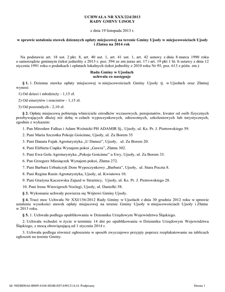 UCHWAŁA NR XXX/224/2013 RADY GMINY UJSOŁY z dnia 19 listopada 2013 r. w sprawie ustalenia stawek dziennych opłaty miejscowej na terenie Gminy Ujsoły w miejscowościach Ujsoły i Złatna na 2014 rok Na podstawie art. 18 ust. 2 pkt. 8, art. 40 ust. 1, art. 41 ust. 1, art. 42 ustawy z dnia 8 marca 1990 roku o samorządzie gminnym (tekst jednolity z 2013 r. poz. 594 ze zm.)oraz art. 17 i art. 19 pkt 1 lit. b ustawy z dnia 12 stycznia 1991 roku o podatkach i opłatach lokalnych (tekst jednolity z 2010 roku Nr 95, poz. 613 z późn. zm.) Rada Gminy w Ujsołach uchwala co następuje § 1. 1. Dzienna stawka opłaty miejscowej w miejscowościach Gminy Ujsoły tj. w Ujsołach oraz Złatnej wynosi: 1) Od dzieci i młodzieży - 1,15 zł. 2) Od emerytów i rencistów - 1,15 zł. 3) Od pozostałych - 2,10 zł. § 2. Opłatę miejscową pobierają właściciele ośrodków wczasowych, pensjonatów, kwater od osób fizycznych przebywających dłużej niż dobę w celach wypoczynkowych, zdrowotnych, szkoleniowych lub turystycznych, zgodnie z wykazem: 1. Pan Mirosław Falkus i Adam Woźnicki PH ADAMIR Sj., Ujsoły, ul. Ks. Pr. J. Piotrowskiego 59. 2. Pani Maria Szczotka Pokoje Gościnne, Ujsoły, ul. Za Borem 35 3. Pani Danuta Fujak Agroturystyka „U Danusi”, Ujsoły, ul. Za Borem 20. 4. Pani Elżbieta Ciapka Wynajem pokoi „Gawra”, Złatna 302. 5. Pani Ewa Gola Agroturystyka „Pokoje Gościnne” u Ewy, Ujsoły, ul. Za Borem 33. 6. Pan Grzegorz Miesiączek Wynajem pokoi, Złatna 272. 7. Pani Barbara Urbańczyk Dom Wypoczynkowy „Barbara”, Ujsoły, ul. Stara Poczta 8. 8. Pani Regina Rusin Agroturystyka, Ujsoły, ul. Kwiatowa 10. 9. Pani Grażyna Kaczewska Zajazd w Strażnicy, Ujsoły, ul. Ks. Pr. J. Piotrowskiego 28. 10. Pani Irena Wiercigroch Noclegi, Ujsoły, ul. Danielki 58. § 3. Wykonanie uchwały powierza się Wójtowi Gminy Ujsoły. § 4. Traci moc Uchwała Nr XXI/156/2012 Rady Gminy w Ujsołach z dnia 30 grudnia 2012 roku w sprawie ustalenia wysokości stawek opłaty miejscowej na terenie Gminy Ujsoły w miejscowościach Ujsoły i Złatna w 2013 roku. § 5. 1. Uchwała podlega opublikowaniu w Dzienniku Urzędowym Województwa Śląskiego. 2. Uchwała wchodzi w życie w terminie 14 dni po opublikowaniu w Dzienniku Urzędowym Województwa Śląskiego, z mocą obowiązującą od 1 stycznia 2014 r. 3. Uchwała podlega również ogłoszeniu w sposób zwyczajowo przyjęty poprzez rozplakatowanie na tablicach ogłoszeń na terenie Gminy. Id: 94EBD0A6-B009-4168-8E6B-E07A90121A14. Podpisany Strona 1 Przewodniczący Rady Gminy Adam Janota Id: 94EBD0A6-B009-4168-8E6B-E07A90121A14. Podpisany Strona 2