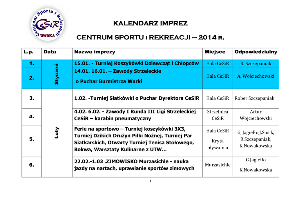 KALENDARZ IMPREZ CENTRUM SPORTU i REKREACJI – 2014 r. 1. 2. Data Styczeń L.p. Nazwa imprezy Miejsce 15.01. - Turniej Koszykówki Dziewcząt i Chłopców 14.01. 16.01. – Zawody Strzeleckie Odpowiedzialny Hala CeSiR R. Szczepaniak Hala CeSiR A. Wojciechowski o Puchar Burmistrza Warki 1.02. -Turniej Siatkówki o Puchar Dyrektora CeSiR Hala CeSiR Rober Szczepaniak 4. 4.02. 6.02. - Zawody I Runda III Ligi Strzeleckiej CeSiR – karabin pneumatyczny Strzelnica CeSiR Artur Wojciechowski Hala CeSiR 5. Ferie na sportowo – Turniej koszykówki 3X3, Turniej Dzikich Drużyn Piłki Nożnej, Turniej Par Siatkarskich, Otwarty Turniej Tenisa Stołowego, Bokwa, Warsztaty Kulinarne z UTW… G, Jagiełło,J.Susik, R.Szczepaniak, K.Nowakowska 6. Luty 3. 22.02.-1.03 .ZIMOWISKO Murzasichle - nauka jazdy na nartach, uprawianie sportów zimowych 1 Kryta pływalnia Murzasichle G.Jagiełło K.Nowakowska Turniej Tenisa Stołowego gimnazjum i szkoły średnie Hala CeSiR Grażyna Jagiełło 8. Turniej Mini Piłki Nożnej Hala CeSiR Kinga Nowakowska 16.03. - Wystawa Broni s. imprez Artur Wojciechowski 9. Marzec 7. 11. 12. 13. Kwiecień 10. 5.03. - I Edycja III Wareckiej Szkolnej Ligi Pływackiej Pływalnia „Olimpic” Izabela Noremberg Zakończenie Wareckiej Ligi Halowej Hala CeSiR Kinga Nowakowska Mały Mistrz Sportu – Warka 2014 Hala CeSiR II Runda Ligi Strzeleckiej CeSiR – karabin pneumatyczny 1.05. - III Majowy Turniej Streetball 15. Młodzieżowe Mistrzostwa Warki w Strzelectwie Sportowym Maj 14. 16. Kryta Z Lekkoatletyką Za Pan Brat 2 Strzelnica G. Jagiełło K. Nowakowska A. Wojciechowski Orlik Robert Szczepaniak Strzelnica Miejska Artur Wojciechowski Stadion K.Nowakowska, G.Jagiełło 17. 31.05. Puchar Polski Karate 18. Zawody III Runda Ligi Strzeleckiej CeSiR – karabin 5,6 mm SM2 20. 1.06.- Dzień Dziecka: Pojedynek Gigantów - Warka 2014 r. 21. 22. Czerwiec 19. 14.05. – II Edycja III Wareckiej Szkolnej Ligi Pływackiej Dzień Dziecka na Strzelnicy Uroczyste zakończenie Uniwersytetu Trzeciego Wieku- 2012/13 3 Hala CeSiR Robert Szczepaniak Strzelnica Miejska Artur Wojciechowski Kryta Pływalnia Izabela Rynek Miasta Noremberg G.Jagiełło, J.Susik, K.Nowakowska, R.Szczepaniak, Strzelnica Miejska Artur Wojciechowski Świetlica Grażyna Jagiełło Nocny Maraton Pływacki 23. Kryta Pływalnia „Olimpic” Izabela Noremberg Teren miasta Grażyna Jagiełło Kryta Pływalnia „Olimpic” Izabela Noremberg 14-15.06. III Tajemnicze Ogrody: zwiedzanie kwiatowych posesji, parada w kwiatowych strojach, wspólne stworzenie kwiatowej dekoracji – trawnik przed CeSiR 24. – UTW, KS „Złoty Wiek” Zawody Triathlonowe – 500 m 26. Mini Turniej Piłki Nożnej Orlik Kinga Nowakowska 27. Zakończenie roku w sekcjach CeSiR CeSiR Grażyna Jagiełło 28. Kolonia letnia / obóz sportowy nad morzem Grażyna Jagiełło 29. Lipiec - Sierpień 25. G.Jagiełło,J.Susik. Hala CeSiR, boiska, pływalnia Wakacje na sportowo K.Nowakowska R.Szczepaniak, I.Noremberg 4 30. Turniej Siatkówki Orlik 31. Turniej Streetball Nocą Orlik Robert Szczepaniak Jarosław Susik Robert Szczepaniak Jarosław Susik G. Jagiełło J.Susik FESTYN „ZDROWO I SPORTOWO” 32. Orlik K. Nowakowska R. Szczepaniak Jesienny Turniej Piłki Nożnej – gimnazja Hala CeSiR Kinga Nowakowska 34. Turniej Koszykówki o Puchar Dyrektora CeSiR Hala CeSiR Robert Szczepaniak s. imprez Grażyna Jagiełło Hala CeSiR Kinga Nowakowska Świetlica Grażyna Jagiełło 35. Wrzesień 33. 20.09. – II Przegląd Piosenki Seniora 2014 Spotkanie integracyjne Klubów Seniora – 37. Rozpoczęcie Wareckiej Ligi Halowej ernik 36. Paździ 40 lecie KS „Złota Jesień” w Warce 7.10.- Inauguracja UTW semestr 2014/2015 5 Izabela Noremberg Mistrzostwa Warki w Tenisie Stołowym Hala CeSiR Grażyna Jagiełło 40. 5.12. Mikołajki – dla dzieci z miasta i gminy Warka Hala CeSiR , s.imprez G. Jagiełło,J.Susik K.Nowakowska R.Szczepaniak 41. Mikołajkowe Zawody Pływackie Kryta Pływalnia I.Noremberg Hala CeSiR Kinga Nowakowska Hala CeSiR R.Szczepaniak Hala CeSiR Robert Szczepaniak 39. Grudzień 38. Listopad Kryta Pływalnia „Olimpic Zawody Freestyle im. Radka Fido 43. Mikołajkowy Turniej Halowej Piłki Nożnej – dla dzieci sekcji CeSiR Mikołajkowe Zawody Karate 44. Świąteczny Turniej Piłki Siatkowej 42. MECZE II i III LIGI KOSZYKÓWKI wg. terminarza Dyrektor Centrum Sportu i Rekreacji w Warce MECZE WARECKIEJ LIGI HALOWEJ od października do kwietnia /-/ mgr Andrzej Brzeżnicki 6