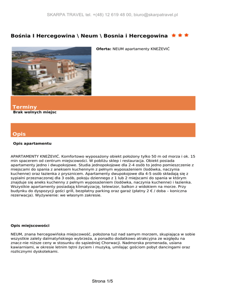 SKARPA TRAVEL tel. +(48) 12 619 48 00, [email protected] Bośnia I Hercegowina \ Neum \ Bosnia i Hercegowina Oferta: NEUM apartamenty KNEŻEVIĆ Terminy Brak wolnych miejsc Opis Opis apartamentu APARTAMENTY KNEŻEVIĆ. Komfortowo wyposażony obiekt położony tylko 50 m od morza i ok. 15 min spacerem od centrum miejscowości. W pobliżu sklep i restauracja. Obiekt posiada apartamenty jedno i dwupokojowe. Studia jednopokojowe dla 2-4 osób to jedno pomieszczenie z miejscami do spania z aneksem kuchennym z pełnym wyposażeniem (lodówka, naczynia kuchenne) oraz łazienka z prysznicem. Apartamenty dwupokojowe dla 4-5 osób składają się z sypialni przeznaczonej dla 3 osób, pokoju dziennego z 1 lub 2 miejscami do spania w którym znajduje się aneks kuchenny z pełnym wyposażeniem (lodówka, naczynia kuchenne) i łazienka. Wszystkie apartamenty posiadają klimatyzację, telewizor, balkon z widokiem na morze. Przy budynku do dyspozycji gości grill, bezpłatny parking oraz garaż (płatny 2 € / doba – koniczna rezerwacja). Wyżywienie: we własnym zakresie. Opis miejscowości NEUM, znana hercegowińska miejscowość, położona tuż nad samym morzem, skupiająca w sobie wszystkie zalety dalmatyńskiego wybrzeża, a ponadto dodatkowo atrakcyjna ze względu na znacz-nie niższe ceny w stosunku do sąsiedniej Chorwacji. Nadmorska promenada, usiana kawiarniami, w okresie letnim tętni życiem i muzyką, umilając gościom pobyt dancingami oraz rozlicznymi dyskotekami. Strona 1/5 SKARPA TRAVEL tel. +(48) 12 619 48 00, [email protected] Cena w PLN obejmuje przejazd autokarem lub dojazd własny, ubezpieczenie rozszerzone KL+NNW + choroby przewlekłe +bagaż, opłatę na turystyczny fundusz gwarancyjny, promocję Cena w EUR obejmuje 7 lub 14 noclegów , korzystanie z prądu, wody, pościeli, ręczników, końcowe sprzątanie. Dopłaty 1. Obowiązkowa taksa klimatyczna płatna na miejscu: 1 EUR dziennie /osoba powyżej 10 lat. 2. Zwierzęta nie są przyjmowane. Zniżki W cenie uwzględniona PROMOCJĘ FIRST MINUTE: przy dojeździe autokarem – 100 zł / osoba przy dojeździe własnym – 50 zł / osoba 1. Dziecko do 2 lat jako dodatkowa osoba bez świadczeń, płaci tylko 360 zł 2. 3 i 4 osoba w studio 2 osobowym, każda płaci kwote w zł + 50 EUR 3. 5 osoba w apartamencie 4 osobowym płaci kwote w zł + 65 EUR. 4. STAŁY KLIENT: obejmuje osoby korzystające trzeci kolejny rok z naszej oferty ! Uwagi organizatora 1.Kwota w złotych płatna jest w Polsce, kwota w EUR płatna w Neumie. 2.Przy dojeździe własnym, gdy potrzebna jest faktura na całość i przy zakupie ubezpieczenia od kosztów rezygnacji wtedy obowiązkowo równowartość kwoty w EUR płatna jest w Polsce. Kwota w EUR przeliczana jest na zł wg kursu NBP pieniądz sprzedaż z dnia ostatniej wpłaty. 3.W dniu wykupienia imprezy/ wpłaty zaliczki klient ma możliwość wykupienia dodatkowego ubezpieczenia od kosztów rezygnacji z imprezy zgodnie z Ogólnymi Warunkmi Ubezpieczenia KOSZTÓW IMPREZY TURYSTYCZNEJ w wysokości 3,3% jednak nie później niż 5 dni od dnia podpisania umowy. 4. Wycieczki fakultatywne organizowane są przez lokalne biura podróży. 5.Doba hotelowa rozpoczyna się o godz 14 i kończy o godz 9. 6. Miejsca i godziny odjazdów autokarów podano w rozkładzie jazdy Strona 2/5 SKARPA TRAVEL tel. +(48) 12 619 48 00, [email protected] 7. Potrzebny DOWÓD OSOBISTY lub PASZPORT ! Prosze pamiętać również o dokumencie dla dzieci. 8. Dla osób dojeżdżających do Krakowa możemy zarezerwować przednocleg w cenie od 100 zł. Uwagi przewoźnika 1.Transport na trasach antenowych w Polsce możliwy jest mikrobusem, autokarem klasy turystycznej, samochodem osobowym lub innym przewoźnikiem np. Polskim Busem, Luxbusem, PKP, PKS itp. Ewentualną zmianę godzin odjazdów podamy najpóźniej na 24 godziny przed odjazdem. Trasa połączeń na terenie kraju zależy od zgłoszeń z poszczególnych miast, co może spowodować, ze przejazd nie będzie realizowany najkrótszą z możliwych tras. 2. Na trasach poza granicami Polski transport odbywa się autokarami wyposażonymi w siedzenia uchylne, klimatyzację, toalety, video i nagłośnienie. Przy małej ilości osób, możliwość przewozu uczestników małym autobusem bez WC i mini baru, wtedy toalety na postojach płatne przez przewoźnika. 3. Podane godziny wyjazdów i przyjazdów mogą ulec zmianie z różnych przyczyn np. złe warunki drogowe, atmosferyczne, zwiększanie ruchu na drogach szczególnie w szczycie sezonu letniego i inne. 4. Prosimy o przybycie na miejsce zbiórki najpóźniej 15 minut przed planowaną godziną odjazdu. Miejsca w autokarze są przydzielane w kolejności podpisania umowy, a klienci o miejscach informowani są przez obsługę na miejscu zbiórki. W autokarze obowiązuje całkowity zakaz palenia papierosów oraz spożywania alkoholu. Osoby korzystające z samego przejazdu, powinny obowiązkowo ubezpieczyć się na czas pobytu. Przewoźnik gwarantuje tylko ubezpieczenie na czas przejazdu. Ramowy program imprezy (klasyczny 7 noclegowy) 1 dzień Wyjazd z Polski zgodnie z rozkładem jazdy, przejazd przez Słowację (dla chętnych posiłek w cenie ok. 5 EUR), Węgry i Chorwację. 2 dzień Przejazd przez Chorwację do Bośnii i Hercegowiny, przyjazd na miejsce wypoczynku w godzinach porannych. Zakwaterowanie od godz.14, nocleg. 3 – 8 dzień WYPOCZYNEK. Możliwość wykupienia wycieczek fakultatywnych. 9 dzień wykwaterowanie z hotelu do godz. 9, czas wolny, wyjazd w drogę powrotną w godz. południowych. Przejazd przez Bośnię i Chorwację. 10 dzień Przejazd przez Węgry i Słowację (dla chętnych posiłek w cenie ok. 5 EUR). Przyjazd do Polski, orientacyjny przyjazd do Krakowa ok. godziny 17. Praktyczne informacje Najbliższa placówka dyplomatyczna: Ambasada RP ul. Dola 13 7100 Sarajewotel. (0-0387 33) 201-142,215 175 tel./fax (00387 33) 233-796 Obowiązująca waluta: 1 Marka konwertybilna (KM) = 100 Fenigów 1 EUR = ok. 2 KM Strona 3/5 SKAR