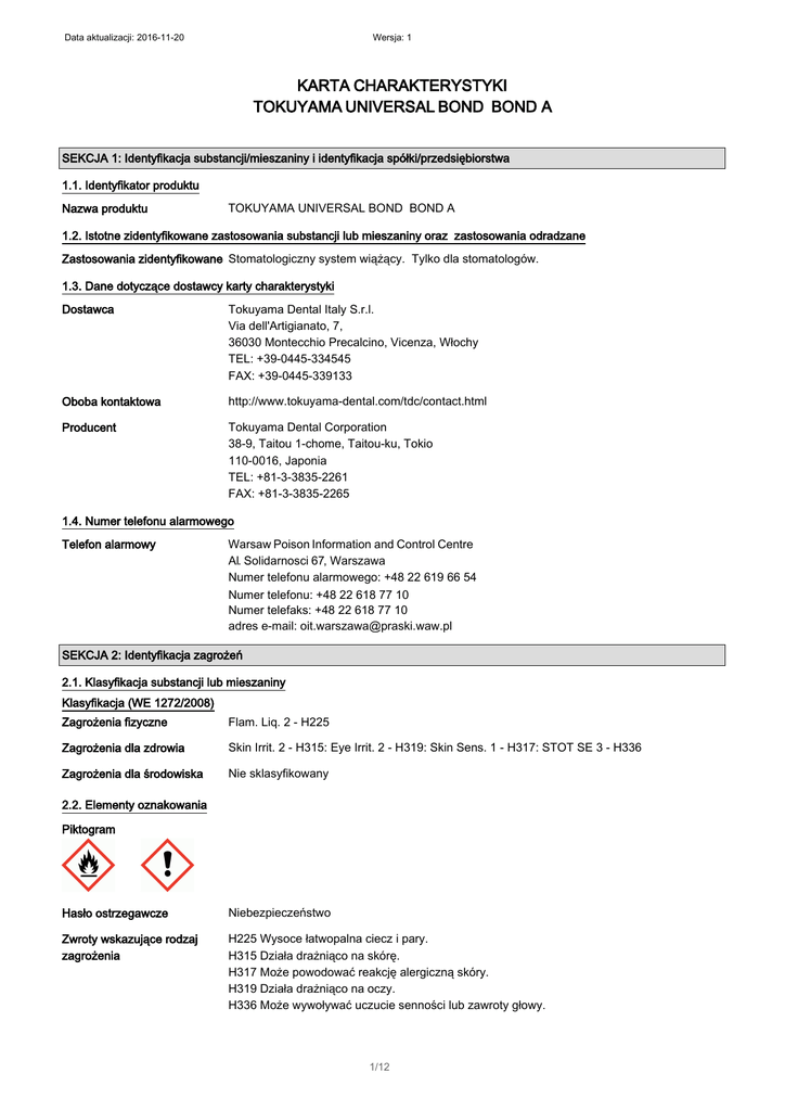 Data aktualizacji: 2016-11-20 Wersja: 1 KARTA CHARAKTERYSTYKI TOKUYAMA UNIVERSAL BOND BOND A SEKCJA 1: Identyfikacja substancji/mieszaniny i identyfikacja spółki/przedsiębiorstwa 1.1. Identyfikator produktu Nazwa produktu TOKUYAMA UNIVERSAL BOND BOND A 1.2. Istotne zidentyfikowane zastosowania substancji lub mieszaniny oraz zastosowania odradzane Zastosowania zidentyfikowane Stomatologiczny system wiążący. Tylko dla stomatologów. 1.3. Dane dotyczące dostawcy karty charakterystyki Dostawca Tokuyama Dental Italy S.r.l. Via dell'Artigianato, 7, 36030 Montecchio Precalcino, Vicenza, Włochy TEL: +39-0445-334545 FAX: +39-0445-339133 Oboba kontaktowa http://www.tokuyama-dental.com/tdc/contact.html Producent Tokuyama Dental Corporation 38-9, Taitou 1-chome, Taitou-ku, Tokio 110-0016, Japonia TEL: +81-3-3835-2261 FAX: +81-3-3835-2265 1.4. Numer telefonu alarmowego Telefon alarmowy Warsaw Poison Information and Control Centre Al. Solidarnosci 67, Warszawa Numer telefonu alarmowego: +48 22 619 66 54 Numer telefonu: +48 22 618 77 10 Numer telefaks: +48 22 618 77 10 adres e-mail: [email protected] SEKCJA 2: Identyfikacja zagrożeń 2.1. Klasyfikacja substancji lub mieszaniny Klasyfikacja (WE 1272/2008) Zagrożenia fizyczne Flam. Liq. 2 - H225 Zagrożenia dla zdrowia Skin Irrit. 2 - H315: Eye Irrit. 2 - H319: Skin Sens. 1 - H317: STOT SE 3 - H336 Zagrożenia dla środowiska Nie sklasyfikowany 2.2. Elementy oznakowania Piktogram Hasło ostrzegawcze Niebezpieczeństwo Zwroty wskazujące rodzaj zagrożenia H225 Wysoce łatwopalna ciecz i pary. H315 Działa drażniąco na skórę. H317 Może powodować reakcję alergiczną skóry. H319 Działa drażniąco na oczy. H336 Może wywoływać uczucie senności lub zawroty głowy. 1/12 Data aktualizacji: 2016-11-20 Wersja: 1 TOKUYAMA UNIVERSAL BOND BOND A Zwroty wskazujące środki ostrożności P210 Przechowywać z dala od źródeł ciepła, gorących powierzchni, źródeł iskrzenia, otwartego ognia i innych źródeł zapłonu. Nie palić. P271 Stosować wyłącznie na zewnątrz lub w dobrze wentylowanym pomieszczeniu. P280 Stosować rękawice ochronne/ odzież ochronną/ ochronę oczu/ ochronę twarzy. P302+P352 W PRZYPADKU KONTAKTU ZE SKÓRĄ: Umyć dużą ilością wody. P305+P351+P338 W PRZYPADKU DOSTANIA SIĘ DO OCZU: Ostrożnie płukać wodą przez kilka minut. Wyjąć soczewki kontaktowe, jeżeli są i można je łatwo usunąć. Nadal płukać. P501 Zawartość/ pojemnik usuwać zgodnie z lokalnymi przepisami. Informacje uzupełniające na etykiecie. EUH066 Powtarzające się narażenie może powodować wysuszanie lub pękanie skóry. Zawiera ACETON, (1-METHYLETHYLIDENE)BIS[4,1-PHENYLENEOXY(2-HYDROXY-3,1PROPANEDIYL)] BISMETHACRYLATE, 2-HYDROXYETHYL METHACRYLATE, 2,2'-ETHYLENEDIOXYDIETHYL DIMETHACRYLATE Dodatkowe zwroty określające P240 Uziemić/ połączyć pojemnik i sprzęt odbiorczy. środki ostrożności P241 Używać elektrycznego przeciwwybuchowego sprzętu. P242 Używać wyłącznie nieiskrzących narzędzi. P243 Przedsięwziąć środki ostrożności zapobiegające statycznemu rozładowaniu. P261 Unikać wdychania par/ rozpylonej cieczy. P264 Dokładnie umyć zanieczyszczoną skórę po użyciu. P272 Zanieczyszczonej odzieży ochronnej nie wynosić poza miejsce pracy. P303+P361+P353 W PRZYPADKU KONTATKU ZE SKÓRĄ (lub z włosami): Natychmiast zdjąć całą zanieczyszczoną odzież. Spłukać skórę pod strumieniem wody/prysznicem. P304+P340 W PRZYPADKU DOSTANIA SIĘ DO DRÓG ODDECHOWYCH: wyprowadzić lub wynieść poszkodowanego na świeże powietrze i zapewnić mu warunki do swobodnego oddychania. P312 W przypadku złego samopoczucia skontaktować się z OŚRODKIEM ZATRUĆ/ lekarzem. P321 Zastosować określone leczenie (patrz zalecenia medyczne na etykiecie). P332+P313 W przypadku wystąpienia podrażnienia skóry: Zasięgnąć porady/ zgłosić się pod opiekę lekarza. P333+P313 W przypadku wystąpienia podrażnienia skóry lub wysypki: Zasięgnąć porady/ zgłosić się pod opiekę lekarza. P337+P313 W przypadku utrzymywania się działania drażniącego na oczy: Zasięgnąć porady/ zgłosić się pod opiekę lekarza. P362+P364 Zanieczyszczoną odzież zdjąć i wyprać przed ponownym użyciem. P370+P378 W przypadku pożaru: Użyć piany odpornej na działanie alkoholi, dwutlenku węgla lub proszku do gaszenia. P403+P233 Przechowywać w dobrze wentylowanym miejscu. Przechowywać pojemnik szczelnie zamknięty. P403+P235 Przechowywać w dobrze wentylowanym miejscu. Przechowywać w chłodnym miejscu. P405 Przechowywać pod zamknięciem. 2.3. Inne zagrożenia Produkt nie zawiera żadnych substancji sklasyfikowanych jako PBT lub vPvB. SEKCJA 3: Skład/informacja o składnikach 3.2. Mieszaniny 2/12 Data aktualizacji: 2016-11-20 Wersja: 1 TOKUYAMA UNIVERSAL BOND BOND A ACETON 30-60% Numer CAS: 67-64-1 Numer WE: 200-662-2 Klasyfikacja Flam. Liq. 2 - H225 Eye Irrit. 2 - H319 STOT SE 3 - H336 (1-METHYLETHYLIDENE)BIS[4,1-PHENYLENEOXY(2HYDROXY-3,1-PROPANEDIYL)] BISMETHACRYLATE Numer CAS: 1565-94-2 10-30% Numer WE: 216-367-7 Klasyfikacja Skin Sens. 1 - H317 Aquatic Chronic 3 - H412 2-HYDROXYETHYL METHACRYLATE Numer CAS: 868-77-9 10-30% Numer WE: 212-782-2 Klasyfikacja Skin Irrit. 2 - H315 Eye Irrit. 2 - H319 Skin Sens. 1 - H317 2,2'-ETHYLENEDIOXYDIETHYL DIMETHACRYLATE Numer CAS: 109-16-0 5-10% Numer WE: 203-652-6 Klasyfikacja Skin Irrit. 2 - H315 Eye Irrit. 2 - H319 Skin Sens. 1 - H317 2-PROPENOIC ACID, 2-METHYL-, 2-HYDROXYETHYL ESTER, PHOSPHATE Numer CAS: 52628-03-2 1-5% Numer WE: 258-053-2 Klasyfikacja Skin Irrit. 2 - H315 Eye Irrit. 2 - H319 Opis zwrotów wskazujących rodzaj zagrożenia podano w Sekcji 16. SEKCJA 4: Środki pierwszej pomocy 4.1. Opis środków pierwszej pomocy Informacje ogólne Zasięgnąć porady medycznej jeśli dyskomfort się utrzymuje. Pokazać Kartę Charakterystyki personelowi medycznemu. 3/12 Data aktualizacji: 2016-11-20 Wersja: 1 TOKUYAMA UNIVERSAL BOND BOND A Wdychanie Przenieść poszkodowanego na świe