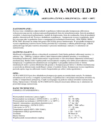 AKRYLOWA ŻYWICA ODLEWNICZA – HDT > 180oC ZASTOSOWANIE : Żywica wraz z dodatkiem odpowiednich wypełniaczy traktowana jako kompozycja odlewnicza wykorzystywana jest do wykonywania profesjonalnych form do termoformowania, form do produkcji wyrobów z elastycznych poliuretanów, modeli do kopiowania, form do rozdmuchu, form do produkcji spodów obuwniczych itd. Żywica z dodatkiem wypełniacza – kompozycja wysoce wypełniona, może być używana jako wypełnienie form w następujących technikach formowania : RIM, RRIM, SRIM, RTM, FRP, tłoczenie na zimno lub gorąco lub zwykły proces laminowania. W przypadku kompozycji wysoce napełnionej warstwa licowa formy powinna być wykonana z żelkotu poliestrowego, żelkotu epoksydowego lub jako warstwa otrzymana w procesie metalizacji ( natrysk ) w zależności od zastosowania. GŁÓWNE ZALETY : Możliwość wykonania odlewu o dowolnych wymiarach ( brak limitu grubości odlewanej warstwy ) z zakresu 1 kg – 2000 kg ( większe odlewy także dopuszczalne jednakże prosimy o wcześniejszą konsultację techniczną ). Brak konieczności wygrzewania w celu otrzymania odporności termicznej i mechanicznej. Bardzo niski współczynnik rozszerzalności cieplnej oraz dobre przewodnictwo cieplne kompozycji z wypełniaczem aluminiowym szczególnie w przypadku umieszczenia w formie miedzianych rurek ( system chłodzenia lub grzania ). Kompozycja jest łatwa w obróbce mechanicznej co pozwala na dokonywanie modyfikacji i zmian w kształcie formy. Kompozycja wysoce napełniona pozwala oprócz tego na odlewanie warstw bezpośrednio po sobie ( niska egzotermia ). OPIS : ALWA-MOULD D jest dwu składnikową kompozycja opartą na metakrylanie metylu. Po dodaniu utwardzacza do żywicy ( wstępnie wymieszanej z wypełniaczem ) otrzymana mieszanina utwardza się szybko w temperaturze pokojowej. Ciepło wywiązujące się podczas reakcji utwardza wykonywaną formę. Opracowano 2 formuły ALWA-MOULD D, których stosowanie dobiera się w zależności od przewidywanego zastosowana. DANE TECHNICZNE : FORMUŁA STANDARDOWA : Wytrzymałość termiczna ( praca ciągła ) Wytrzymałość na ściskanie ( ASTM D 695 ) ( w 20OC ) Wytrzymałość na ściskanie ( ASTM D 695 ) ( w 100OC ) Gęstość ( mieszanina z proszkiem aluminiowym ) Lepkość mieszaniny ( ASTM D 2293 ) Czas życia ( w 21OC ) Temperatura ugięcia HDT ( DIN 53460 ) Temperatura reakcji egzotermicznej Twardość Skurcz liniowy Współczynnik rozszerzalności cieplnej 145OC 80 – 90 MPa 70 – 80 MPa 1.7 kg / dm3 6000 – 7000 mPa.s 17 – 20 min. > 180OC ( 120 – 130 )OC 86 Shore D ok. +/- 0.1 % 13.4 x 10-6 1 / OK DANE TECHNICZNE : FORMUŁA WYSOCE NAPEŁNIONA` : Wytrzymałość termiczna ( praca ciągła ) Wytrzymałość na ściskanie ( ASTM D 695 ) Gęstość ( mieszanina z aluminium ) Gęstość ( mieszanina z wypełniaczem mineralnym ) Lepkość mieszaniny ( ASTM D 2293 ) Czas życia ( w 21OC ) Temperatura ugięcia HDT ( DIN 53460 ) Temperatura reakcji egzotermicznej Twardość Skurcz liniowy 145OC 70 – 80 MPa 2.4 kg / dm3 2.0 kg / dm3 > 10000 mPa.s 45 min. > 180OC ( 50 - 70 )OC - zależy od objętości zależy od warstwy powierzchniowej < 0.1 % PRZYGOTOWANIE POWIERZCHNI MODELU : Model wzorcowy może być wykonany prawie z każdego rodzaju materiału ( drewno, gips, skóra, każdy rodzaj metalu, tworzywa sztuczne, żywice, pianki PU ) za wyjątkiem polistyrenu oraz tworzyw akrylowych, które wymagają specjalnego przygotowania powierzchni. Porowate materiały powinny być pokryte zacieraczem porów 9520 ( w przypadku dużych porów konieczne może być przeszlifowanie papierem ściernym pierwszej warstwy i naniesienie następnej ). Materiał na model powinien być absolutnie suchy a jego powierzchnia pokryta produktem o symbolu 9500, który usuwa wszelkie naprężenia powierzchniowe. Po całkowitym wyschnięciu 9500 w celu zapewnienia powierzchni gładkości pokrywamy ją środkiem rozdzielającym będącym jednocześnie rodzajem lakieru o symbolu 9510 ( za pomocą pędzla lub pistoletu – natrysk ). Defektów na formach można uniknąć przez zastosowanie materiałów o podobnych współczynnikach rozszerzalności cieplnej na wzorzec oraz jego obudowę. W razie potrzeby wzmocnienia ( w postaci arkuszy perforowanej blachy aluminiowej o grubości 2 – 3 mm i wielkości perforacji ∅ 8 mm ) mogą być zatopione w kompozycji ALWA-MOULD D lub w postaci innego materiału przytwierdzonego do boków i spodu formy ( po jej całkowitym ochłodzeniu ). Ze względu na różnice rozszerzalności cieplnej przygotować otwory o większej średnicy pod śruby. WARSTWY POWIERZCHNIOWE ( dotyczy tylko kompozycji wysoce wypełnionej ) : Warstwa natryskiwanego metalu : grubość 1 – 3 mm naniesionej warstwy cynku zapewnia wysokie parametry odporności mechanicznej i chemicznej wykonywanemu narzędziu. Natryskiwana lub położona za pomocą pędzla warstwa żelkotu poliestrowego poprawia siłę połączenia warstwy cynku i ALWA-MOULD D. Warstwa żelkotu poliestrowego : grubość 1 -–3 mm powinna zostań naniesiona na przygotowaną powierzchnię modelu. Należy unikać generowania zbyt wysokiej temperatury podczas nakładania żelkotu aby nie utracić wysokiej jakości powierzchni. Po kilku godzinach kompozycja ALWA-MOULD D może być bezpiecznie wylewana na warstwy żelkotu. Warstwa żelkotu epoksydowego : 2 lub 3 warstwy powinny być naniesione na powierzchnię modelu za pomocą pędzla. Gdy żelkot znajduje się w stadium zaawansowanego żelowania, granulki aluminium powinny zostać wciśnięte w warstwę żelkotu stanowiąc późniejsze połączenie mechaniczne z wylewaną kompozycją. Nie istnieje żadne chemiczne połączenie między żywicami epoksydowymi a ALWAMOULD D. Żelkot epoksydowy powinien utwardzać się minimum 24 godziny przed wylaniem warstwy ALWA-MOULD D . Nie należy używać żadnej warstwy pośredniej opartej na tkaninie szklanej lub ciętym rovingu szklanym. Warstwa niklu nanoszonego metodą 