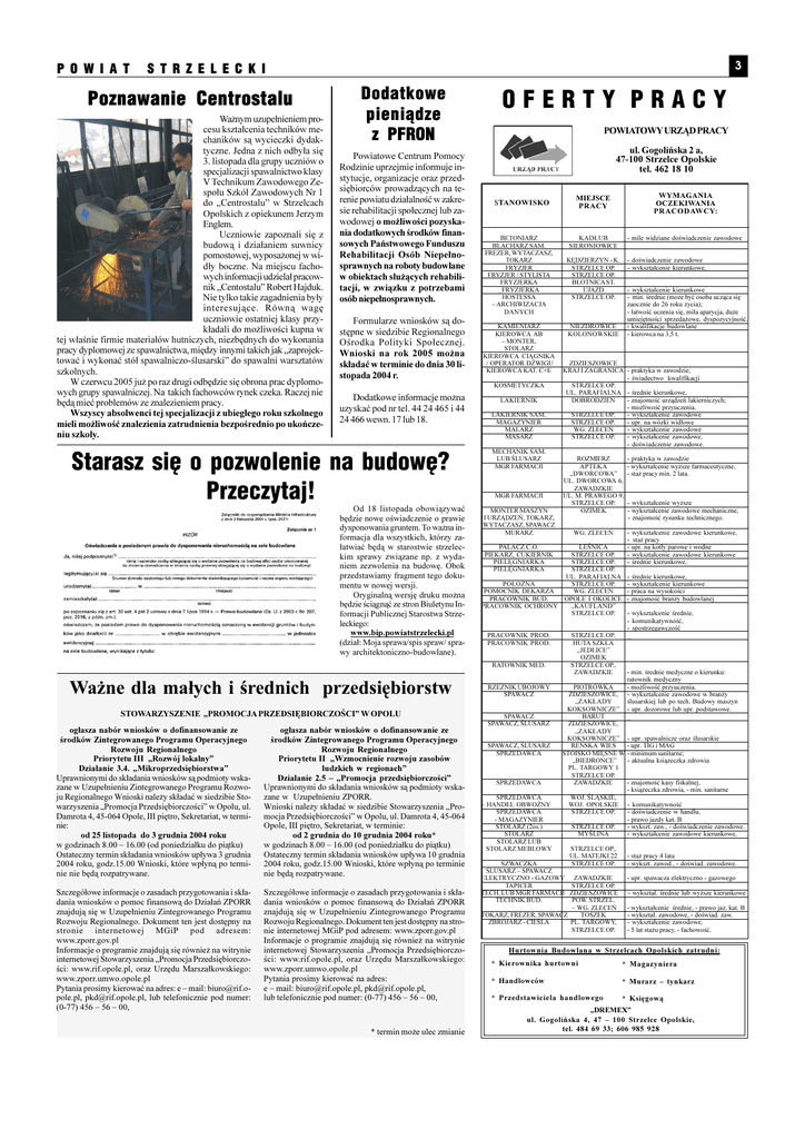 P O W I A T 3 S T R Z E L E C K I Dodatkowe pieni¹dze z PFRON Poznawanie Centrostalu Wa¿nym uzupe³nieniem pro- cesu kszta³cenia techników me- chaników s¹ wycieczki dydak- tyczne. Jedna z nich odby³a siê 3. listopada dla grupy uczniów o specjalizacji spawalnictwo klasy V Technikum Zawodowego Zespo³u Szkó³ Zawodowych Nr 1 do Centrostalu w Strzelcach Opolskich z opiekunem Jerzym Englem. OFERTY PRACY POWIATOWY URZ¥D PRACY ul. Gogoliñska 2 a, Powiatowe Centrum Pomocy 47-100 Strzelce Opolskie Rodzinie uprzejmie informuje in- tel. 462 18 10 stytucje, organizacje oraz przed- siêbiorców prowadz¹cych na terenie powiatu dzia³alnoæ w zakresie rehabilitacji spo³ecznej lub za- nia dodatkowych rodków finan- pomostowej, wyposa¿onej w wi- Rehabilitacji Osób Niepe³no- FREZER, WYTACZASZ, w obiektach s³u¿¹cych rehabili- d³y boczne. Na miejscu facho- wych informacji udziela³ pracow- nik Centostalu Robert Hajduk. Nie tylko takie zagadnienia by³y interesuj¹ce. Równ¹ wagê sowych Pañstwowego Funduszu sprawnych na roboty budowlane tacji, w zwi¹zku z potrzebami osób niepe³nosprawnych. uczniowie ostatniej klasy przy- k³adali do mo¿liwoci kupna w tej w³anie firmie materia³ów hutniczych, niezbêdnych do wykonania pracy dyplomowej ze spawalnictwa, miêdzy innymi takich jak zaprojek- towaæ i wykonaæ stó³ spawalniczo-lusarski do spawalni warsztatów szkolnych. W czerwcu 2005 ju¿ po raz drugi odbêdzie siê obrona prac dyplomo- Formularze wniosków s¹ dostêpne w siedzibie Regionalnego Orodka Polityki Spo³ecznej. Wnioski na rok 2005 mo¿na sk³adaæ w terminie do dnia 30 li- stopada 2004 r. wych grupy spawalniczej. Na takich fachowców rynek czeka. Raczej nie bêd¹ mieæ problemów ze znalezieniem pracy. Wszyscy absolwenci tej specjalizacji z ubieg³ego roku szkolnego mieli mo¿liwoæ znalezienia zatrudnienia bezporednio po ukoñcze- Dodatkowe informacje mo¿na uzyskaæ pod nr tel. 44 24 465 i 44 24 466 wewn. 17 lub 18. BETONIARZ SIERONIOWICE TOKARZ KÊDZIERZYN - K. FRYZJER / STYLISTA STRZELCE OP. FRYZJER Starasz siê o pozwolenie na budowê? Przeczytaj! Od 18 listopada obowi¹zywaæ bêdzie nowe owiadczenie o prawie dysponowania gruntem. To wa¿na in- formacja dla wszystkich, którzy za- ³atwiaæ bêd¹ w starostwie strzeleckim sprawy zwi¹zane np. z wyda- niem zezwolenia na budowê. Obok przedstawiamy fragment tego dokumentu w nowej wersji. Oryginaln¹ wersjê druku mo¿na bêdzie ci¹gn¹æ ze stron Biuletynu In- formacji Publicznej Starostwa Strze- FRYZJERKA (dzia³: Moja sprawa/spis spraw/ spra- _FRYZJERKA STOWARZYSZENIE PROMOCJA PRZEDSIÊBIORCZOCI W OPOLU rodków Zintegrowanego Programu Operacyjnego Rozwoju Regionalnego Priorytetu III Rozwój lokalny Dzia³anie 3.4. Mikroprzedsiêbiorstwa Uprawnionymi do sk³adania wniosków s¹ podmioty wska- zane w Uzupe³nieniu Zintegrowanego Programu Rozwo- ju Regionalnego Wnioski nale¿y sk³adaæ w siedzibie Stowarzyszenia Promocja Przedsiêbiorczoci w Opolu, ul. Damrota 4, 45-064 Opole, III piêtro, Sekretariat, w terminie: od 25 listopada do 3 grudnia 2004 roku og³asza nabór wniosków o dofinansowanie ze rodków Zintegrowanego Programu Operacyjnego Rozwoju Regionalnego Priorytetu II Wzmocnienie rozwoju zasobów Uprawnionymi do sk³adania wniosków s¹ podmioty wskazane w Uzupe³nieniu ZPORR. Wnioski nale¿y sk³adaæ w siedzibie Stowarzyszenia Pro- mocja Przedsiêbiorczoci w Opolu, ul. Damrota 4, 45-064 Opole, III piêtro, Sekretariat, w terminie: od 2 grudnia do 10 grudnia 2004 roku* w godzinach 8.00 16.00 (od poniedzia³ku do pi¹tku) w godzinach 8.00 16.00 (od poniedzia³ku do pi¹tku) 2004 roku, godz.15.00 Wnioski, które wp³yn¹ po termi- 2004 roku, godz.15.00 Wnioski, które wp³yn¹ po terminie Ostateczny termin sk³adania wniosków up³ywa 3 grudnia nie nie bêd¹ rozpatrywane. Szczegó³owe informacje o zasadach przygotowania i sk³a- dania wniosków o pomoc finansow¹ do Dzia³añ ZPORR znajduj¹ siê w Uzupe³nieniu Zintegrowanego Programu Ostateczny termin sk³adania wniosków up³ywa 10 grudnia nie bêd¹ rozpatrywane. Szczegó³owe informacje o zasadach przygotowania i sk³a- znajduj¹ siê w Uzupe³nieniu Zintegrowanego Programu Rozwoju Regionalnego. Dokument ten jest dostêpny na Rozwoju Regionalnego. Dokument ten jest dostêpny na stro- www.zporr.gov.pl Informacje o programie znajduj¹ siê równie¿ na witrynie stronie internetowej MGiP pod adresem: Informacje o programie znajduj¹ siê równie¿ na witrynie internetowej Stowarzyszenia Promocja Przedsiêbiorczo- ci: www.rif.opole.pl, oraz Urzêdu Marsza³kowskiego: www.zporr.umwo.opole.pl Pytania prosimy kierowaæ na adres: e mail: [email protected], [email protected], lub telefonicznie pod numer: (0-77) 456 56 00, nie internetowej MGiP pod adresem: www.zporr.gov.pl internetowej Stowarzyszenia Promocja Przedsiêbiorczoci: www.rif.opole.pl, oraz Urzêdu Marsza³kowskiego: - min. rednie (mo¿e byæ osoba ucz¹ca siê zaocznie do 26 roku ¿ycia); DANYCH - ³atwoæ uczenia siê, mi³a aparycja, du¿e KAMIENIARZ umiejêtnoci sprzeda¿owe, dyspozycyjnoæ. NIEZDROWICE KIEROWCA AB - kwalifikacje budowlane KOLONOWSKIE MONTER, - kierowca na 3,5 t. STOLARZ KIEROWCA CI¥GNIKA / OPERATOR DWIGU ZDZIESZOWICE KIEROWCA KAT. C+E KRAJ I ZAGRANICA KOSMETYCZKA STRZELCE OP. UL. PARAFIALNA LAKIERNIK LUB LUSARZ MGR FARMACJI - mo¿liwoæ przyuczenia. - wykszta³cenie zawodowe - upr. na wózki wid³owe STRZELCE OP. - wykszta³cenie zawodowe, - wykszta³cenie zawodowe - dowiadczenie zawodowe. ROZMIERZ - praktyka w zawodzie DWORCOWA - sta¿ pracy min. 2 lata. APTEKA - wykszta³cenie wy¿sze farmaceutyczne, UL. DWORCOWA 6, ZAWADZKIE MGR FARMACJI UL. M. PRAWEGO 9, MONTER MASZYN OZIMEK STRZELCE OP. I URZ¥DZEÑ, TOKARZ, WYTACZASZ, SPAWACZ MURARZ PALACZ C.O. - upr. na kot³y parowe i wodne - wykszta³cenie zawodowe kierunkowe STRZELCE OP. - rednie kierunkowe, STRZELCE OP. UL. PARAFIALNA PO£O¯NA PRACOWNIK OCHRONY - sta¿ pracy LENICA PIELÊGNIARKA PRACOWNIK BUD. - znajomoæ rysunku