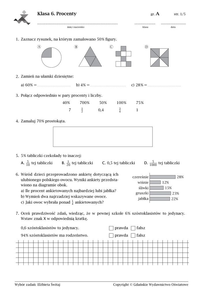 Klasa 6. Procenty gr. ................................................................................. A str. 1/5 ..................... ......................... klasa data imię i nazwisko 1. Zaznacz rysunek, na którym zamalowano 50% figury. 2. Zamień na ułamki dziesiętne: a) 60% = . . . . . . . . . . . . . . . . . . . . . . . . . . . . . b) 4% = . . . . . . . . . . . . . . . . . . . . . . . . . . . . . . . c) 28% = . . . . . . . . . . . . . . . . . . . . . . . . . . . . . 3. Połącz odpowiednio w pary procenty i liczby. 40% 700% 1 2 7 50% 100% 3 4 0,4 75% 1 4. Zamaluj 70% prostokąta. 5. 5% tabliczki czekolady to inaczej: A. 5 10 tej tabliczki B. 1 20 tej tabliczki C. 0,5 tej tabliczki D. 5 1000 tej tabliczki 6. Wśród dzieci przeprowadzono ankietę dotyczącą ich ulubionego polskiego owocu. Wyniki ankiety przedstawiono na diagramie obok. a) Ile procent ankietowanych najbardziej lubi jabłka? b) Wymień dwa najrzadziej wskazywane owoce. c) Jaki owoc wybrała ponad 1 4 ankietowanych? 7. Oceń prawdziwość zdań, wiedząc, że w pewnej szkole 6% szóstoklasistów to jedynacy. Wstaw znak X w odpowiednią kratkę. 0,6 szóstoklasistów to jedynacy. prawda fałsz 94% szóstoklasistów ma rodzeństwo. prawda fałsz Wybór zadań: Elżbieta Świtaj Copyright © Gdańskie Wydawnictwo Oświatowe gr. A str. 2/5 8. Oceń prawdziwość zdań. Wstaw znak X w odpowiednią kratkę. 10% kwoty 210 zł to 21 zł. prawda fałsz 5% masy 20 kg to 1 kg. prawda fałsz 150% objętości 40 dm3 to 600 dm3 . prawda fałsz 50% trasy o długości 20,5 km to więcej niż 10 km. prawda fałsz 9. Diagram przedstawia, jaki procent wszystkich ocen z kartkówki stanowią poszczególne oceny. Uzupełnij poniższe zdania. Oceny celujące otrzymało . . . . . . . . . . . % uczniów. Oceny niższe niż dostateczny otrzymało . . . . . . . . . . . % uczniów. 10. Bluzka kosztuje 60 zł. Ile będzie kosztowała po obniżce o 10%? Zapisz obliczenia. 11. Tomek i Wojtek mieli pomalować płot. Wojtek pomalował 25%, a Tomek prawdziwość zdań. Wstaw znak X w odpowiednią kratkę. 2 5 tego płotu. Oceń Wojtek pomalował większą część płotu niż Tomek. prawda fałsz Do pomalowania pozostała im więcej niż połowa tego płotu. prawda fałsz 12. Uzupełnij: a) 2 5 liczby dzieci to . . . . . . . . b) co dziesiąty uczeń to c) 0,66 kwoty to . . . . . . . . Wybór zadań: Elżbieta Świtaj % dzieci, . . . . . . . . % uczniów, % kwoty. Copyright © Gdańskie Wydawnictwo Oświatowe gr. A str. 3/5 13. W klasie VI b jest tyle samo chłopców co dziewcząt. Wychowawca VI b zapytał uczniów, jakie są ich ulubione sporty zimowe. Na diagramie przedstawił, jaki procent wszystkich dziewcząt i chłopców najbardziej lubi jazdę na sankach, nartach lub łyżwach. Oceń prawdziwość poniższych zdań. Wstaw znak X w odpowiednią kratkę. Dziewczęta najrzadziej wymieniały jazdę na nartach. prawda fałsz Ulubionym sportem chłopców jest jazda na sankach. prawda fałsz Z diagramu wynika, że na nartach lubi jeździć o 20 chłopców więcej niż dziewcząt. prawda fałsz prawda fałsz Mniej niż 1 5 chłopców wskazała jazdę na łyżwach. 14. Zamalowana część wszystkich figur to: A. 40% B. 4% C. 60% D. 6% 15. Zamień na procenty: a) 0,5 = . . . . . . . . . . . . . . . . . . . . . . . . . . . . . . . . . . . . . . . . . . . . . . d) 1 4 =. . . . . . . . . . . . . . . . . . . . . . . . . . . . . . . . . . . . . . . . . . . . . . . . . b) 1,9 = . . . . . . . . . . . . . . . . . . . . . . . . . . . . . . . . . . . . . . . . . . . . . . e) 2 5 =. . . . . . . . . . . . . . . . . . . . . . . . . . . . . . . . . . . . . . . . . . . . . . . . . c) 0,02 = . . . . . . . . . . . . . . . . . . . . . . . . . . . . . . . . . . . . . . . . . . . . 1 f) 1 10 =. . . . . . . . . . . . . . . . . . . . . . . . . . . . . . . . . . . . . . . . . . . . . 16. Zamień ułamki na procenty: 1 20 =. . . . . . . . . . . . . . . . . 3 5 =. . . . . . . . . . . . . . . . . 36 90 = . . . . . . . . . . . . . . . . . 0,27 = . . . . . . . . . . . . . . . . . 2,48 = . . . . . . . . . . . . . . . . . 17. W opakowaniu mieszanki cukierków znajduje się 18 trufli, 12 kukułek i 15 śliwek w czekoladzie. Dokończ zdanie. Trufle stanowią: A. mniej niż 18% wszystkich cukierków. C. dokładnie 40% wszystkich cukierków. B. dokładnie 18% wszystkich cukierków. D. więcej niż 40% wszystkich cukierków. 18. W wagoniku kolejki górskiej jest 50 miejsc. Adam policzył, że w czasie ich przejazdu w kolejce było 8 osób dorosłych i 22 dzieci. Oceń prawdziwość zdań dotyczących tego przejazdu kolejką. Wstaw znak X w odpowiednią kratkę. W czasie przejazdu 40% miejsc w kolejce było wolnych. prawda fałsz 40% osób jadących kolejką górską stanowili dorośli. prawda fałsz Wybór zadań: Elżbieta Świtaj Copyright © Gdańskie Wydawnictwo Oświatowe gr. A str. 4/5 19. Uczniowie klas szóstych wzięli udział w akcji zbierania nakrętek. Diagram przedstawia, jaki procent uzbieranych nakrętek stanowiły nakrętki zebrane przez poszczególne klasy. Oceń prawdziwość zdań. Wstaw znak X w odpowiednią kratkę. Klasy VI a i VI c zebrały razem mniej niż połowę nakrętek. prawda fałsz Co czwarta nakrętka została przyniesiona przez ucznia klasy VI b. prawda fałsz 20. Diagram przedstawia, jaki procent ogrodu zajmują grządki z poszczególnymi warzywami. a) Które warzywo zajmuje największą część ogrodu? Jaka to część? Zapisz ją w postaci ułamka zwykłego nieskracalnego. b) Czy por i seler zajmują łącznie większą część ogrodu niż pietruszka? Zapisz obliczenia. c) Jaką część ogrodu zajmują łącznie warzywa korzeniowe, czyli seler, pietruszka i marchew? Wynik zapisz w postaci ułamka zwykłego nieskracalnego. 21. Diagram przedstawia wyniki ankiety badającej ulubiony sposób spędzania czasu wolnego przez uczniów klasy 6 d. Z diagramu wynika, że: A. Ponad połowa klasy w czasie wolnym uprawia sport. B. 20% klasy najchętniej s