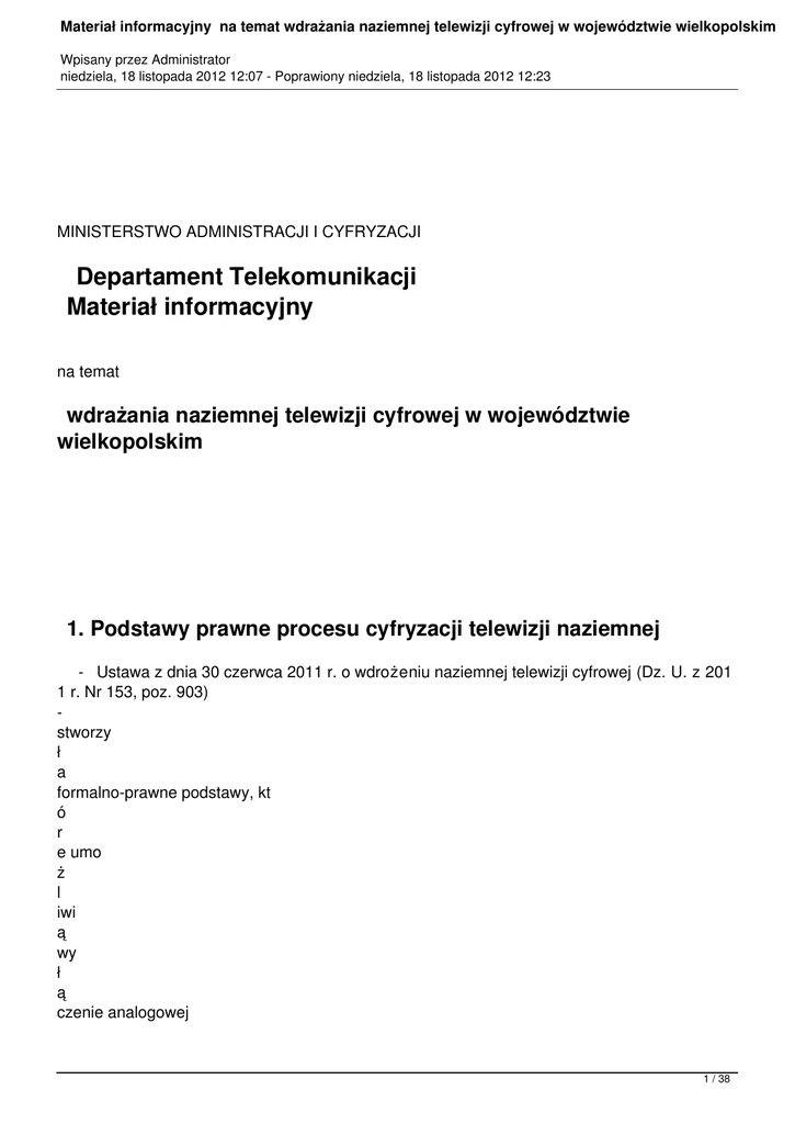 Materiał informacyjny na temat wdrażania naziemnej telewizji cyfrowej w województwie wielkopolskim Wpisany przez Administrator niedziela, 18 listopada 2012 12:07 - Poprawiony niedziela, 18 listopada 2012 12:23 MINISTERSTWO ADMINISTRACJI I CYFRYZACJI Departament Telekomunikacji Materiał informacyjny na temat wdrażania naziemnej telewizji cyfrowej w województwie wielkopolskim 1. Podstawy prawne procesu cyfryzacji telewizji naziemnej - Ustawa z dnia 30 czerwca 2011 r. o wdrożeniu naziemnej telewizji cyfrowej (Dz. U. z 201 1 r. Nr 153, poz. 903) stworzy ł a formalno-prawne podstawy, kt ó r e umo ż l iwi ą wy ł ą czenie analogowej 1 / 38 Materiał informacyjny na temat wdrażania naziemnej telewizji cyfrowej w województwie wielkopolskim Wpisany przez Administrator niedziela, 18 listopada 2012 12:07 - Poprawiony niedziela, 18 listopada 2012 12:23 telewizji naziemnej do dnia 31 lipca 2013 r. i wdro ż e nie cyfrowej telewizji naziemnej. Ustawa reguluje prawnie kwestie zwi ą z ane ze sposobem wdro ż e nia naziemnej telewizji cyfrowej, organizacj ą i funkcjonowaniem multipleks ó w , operatorami multipleks ó w oraz ob owi ą z kami nadawc ó w i ministra w ł a ś c iwego do spraw ł ą czno ś c i w zakresie przeprowadzenia kampanii dotycz ą c ej telewizji cyfrowej. - Rozporządzenie Ministra Infrastruktury z dnia 18 grudnia 2009 r. w sprawie wymagańtech nicznych i eksploatacyjnych dla urz ą d 2 / 38 Materiał informacyjny na temat wdrażania naziemnej telewizji cyfrowej w województwie wielkopolskim Wpisany przez Administrator niedziela, 18 listopada 2012 12:07 - Poprawiony niedziela, 18 listopada 2012 12:23 ze ń k onsumenckich s ł u ż ą cych do odbioru cyfrowych naziemnych transmisji telewizyjnych – Za ł ą cznik do rozporz ą d zenia okre ś l a wymagania techniczne i eksploatacyjne, kt ó r ych spe ł n ienie jest niezb ę d ne do poprawnego odbioru przez urz ą d zenia konsumenckie s ł u ż ą ce do od bioru cyfrowych naziemnych transmisji telewizyjnych sygna ł ó w dostarczanych drog ą rozsiewcz ą naziemn ą 3 / 38 Materiał informacyjny na temat wdrażania naziemnej telewizji cyfrowej w województwie wielkopolskim Wpisany przez Administrator niedziela, 18 listopada 2012 12:07 - Poprawiony niedziela, 18 listopada 2012 12:23 . Odbiorniki cyfrowej, te zawieraj ą c e wy ś w ietlacz obrazu (iDTV) jak i te niezawieraj ą c e wy ś w ietlacza obrazu (Set-Top Box), powinny by ć zgodne ze standardem MPEG-4 (H.264/AVC). 2. Inne przydatne dokumenty związane z procesem cyfryzacji telewizji naziemnej:’ - Plan wdrażania naziemnej telewizji cyfrowej w Polsce z dnia 4 czerwca 2010 r. opracowa ny w ramach prac Mi ę d zyresortowego Zespo ł u do Spraw Telewizji i Radiofonii Cyfrowej (przekazuje kierunkowe informacje dotyczące wdrażania NTC w Polsce). - Dobre praktyki w zakresie nadawania DVB-T w Polsce , zawiera uzgodniony minimalny zestaw regu łi zasad, których stosowanie w polskich emisjach naziemnej telewizji cyfrowej powinno zapewni ć wystarczaj ą c y poziom interoperacyjno ś c i, a w efekcie poprawne dzia 4 / 38 Materiał informacyjny na temat wdrażania naziemnej telewizji cyfrowej w województwie wielkopolskim Wpisany przez Administrator niedziela, 18 listopada 2012 12:07 - Poprawiony niedziela, 18 listopada 2012 12:23 ł a nie odbiornik ó w cyfrowych spe ł n iaj ą c ych wymagania rozporz ą d zenia Ministra Infrastruktury - Wytyczne dotycz ą c e modernizacji antenowych instalacji zbiorowych (AIZ) po wprowadzeniu DVB-T , opisuje niezbędny zakres prac, które należ y wykona ć w istniej ą c ych antenowych instalacjach zbiorowych tzw. AIZ w celu ich dostosowania do reemisji program ó w cyfrowej radiodyfuzji naziemnej DVB-T i T-DAB. W ł a ś c icielami takich instalacji s ą przede wszystkim wsp ó l noty i sp ó ł dzielnie mieszkaniowe , kt ó r e powinny zadba ć 5 / 38 Materiał informacyjny na temat wdrażania naziemnej telewizji cyfrowej w województwie wielkopolskim Wpisany przez Administrator niedziela, 18 listopada 2012 12:07 - Poprawiony niedziela, 18 listopada 2012 12:23 o odpowiednio wczesne dostosowanie w ł a snych AIZ do wymog ó w cyfrowej radiodyfuzji naziemnej zgodnie z przedstawionymi wytycznymi. - Wymagania techniczne i eksploatacyjne dla antenowych instalacji zbiorowych przeznaczonych do reemisji us ł u g , mająułatwićprzeprowadzenie operacji przystosowania AIZ do reemisji program ó w radiofo nicznych i telewizyjnych rozpowszechnianych bezprzewodowo (analogowych i cyfrowych) drog ą naziemn ą przez podanie minimalnego zestawu wymaga ń technicznych i eksploatacyjnych niezb ę d nych do jej prawid ł o wego funkcjonowania. Mog ą by ć r ó w nie ż pomocne dla zarz ą d c ó w budynk ó w wielorodzinnych podczas formu ł 6 / 38 Materiał informacyjny na temat wdrażania naziemnej telewizji cyfrowej w województwie wielkopolskim Wpisany przez Administrator niedziela, 18 listopada 2012 12:07 - Poprawiony niedziela, 18 listopada 2012 12:23 o wania zam ó w ienia i odbioru technicznego wykonanych rob ó t instalacyjnych. 3. Wdrażanie naziemnej telewizji cyfrowej Zgodnie z ustawą, wdrażanie naziemnej telewizji cyfrowej polega na: - równoczesnym rozpowszechnianiu, w okresie przejściowym, programówtelewizyjnych w spos ób analogowy i cyfrowy drog ą rozsiewcz ą naziemn ą ; - na zakończeniu rozpowszechniania programów telewizyjnych w sposób analogowy drog ą rozsiewcz ą naziemn ą nie p ó ź niej ni ż do dnia 31 lipca 2013 r. Wdrażanie naziemnej telewizji cyfrowej w Polsce zaczęło się w kwietniu 2010 r. Obecnie 7 / 38 Materiał informacyjny na temat wdrażania naziemnej telewizji cyfrowej w województwie wielkopolskim Wpisany przez Administrator niedziela, 18 listopada 2012 12:07 - Poprawiony niedziela, 18 listopada 2012 12:23 naziemną telewizje cyfrową w Polsce tworzą trzy multipleksy: - Multipleks I - Programy: TVP1 HD, TVP2, TVP INFO (wersja regionalna), Eska TV, TTV, Polo TV, ATM Rozrywka. - Stan wdraża