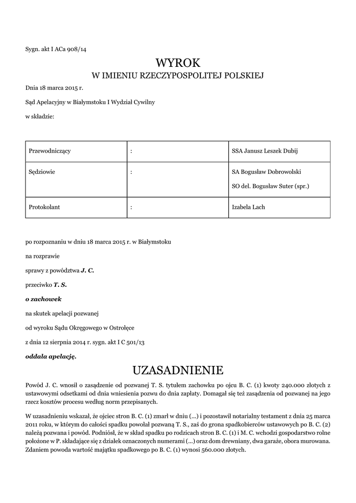 Sygn. akt I ACa 908/14 WYROK W IMIENIU RZECZYPOSPOLITEJ POLSKIEJ Dnia 18 marca 2015 r. Sąd Apelacyjny w Białymstoku I Wydział Cywilny w składzie: Przewodniczący : SSA Janusz Leszek Dubij Sędziowie : SA Bogusław Dobrowolski SO del. Bogusław Suter (spr.) Protokolant : Izabela Lach po rozpoznaniu w dniu 18 marca 2015 r. w Białymstoku na rozprawie sprawy z powództwa J. C. przeciwko T. S. o zachowek na skutek apelacji pozwanej od wyroku Sądu Okręgowego w Ostrołęce z dnia 12 sierpnia 2014 r. sygn. akt I C 501/13 oddala apelację. UZASADNIENIE Powód J. C. wnosił o zasądzenie od pozwanej T. S. tytułem zachowku po ojcu B. C. (1) kwoty 240.000 złotych z ustawowymi odsetkami od dnia wniesienia pozwu do dnia zapłaty. Domagał się też zasądzenia od pozwanej na jego rzecz kosztów procesu według norm przepisanych. W uzasadnieniu wskazał, że ojciec stron B. C. (1) zmarł w dniu (...) i pozostawił notarialny testament z dnia 25 marca 2011 roku, w którym do całości spadku powołał pozwaną T. S., zaś do grona spadkobierców ustawowych po B. C. (2) należą pozwana i powód. Podniósł, że w skład spadku po rodzicach stron B. C. (1) i M. C. wchodzi gospodarstwo rolne położone w P. składające się z działek oznaczonych numerami (...) oraz dom drewniany, dwa garaże, obora murowana. Zdaniem powoda wartość majątku spadkowego po B. C. (1) wynosi 560.000 złotych. Pozwana T. S. wniosła o odrzucenie pozwu z uwagi na powagę rzeczy ugodzonej, ewentualnie oddalenie powództwa w całości oraz zasądzenie od powoda na jej rzecz kosztów procesu według norm przepisanych. Podniosła, że przed Sądem Rejonowym w Przasnyszu w sprawie I Ns 608/12 o dział spadku i zniesienie współwłasności strony zawarły ugodę, której przedmiotem było zniesienie współwłasności wszystkich nieruchomości objętych wnioskiem, a więc również tych, których dotyczy niniejsza sprawa. Wskazała, że z treści tej ugody wynika, iż objęła ona roszczenie powoda z tytułu zachowku. W dalszej kolejności podniosła, że powód nie udowodnił wysokości dochodzonego zachowku. Wyrokiem z dnia 12 sierpnia 2014 roku Sąd Okręgowy w Ostrołęce zasądził od pozwanej na rzecz powoda tytułem zachowku kwotę 95.480,30 złotych z ustawowymi odsetkami od dnia wydania wyroku do dnia zapłaty (pkt 1), oddalił powództwo w pozostałej części (pkt 2), zasądził od powoda na rzecz pozwanej kwotę 1.200 złotych tytułem częściowego zwrotu kosztów zastępstwa prawnego (pkt 3), nakazał pobrać od pozwanej na rzecz Skarbu Państwa Sądu Okręgowego w Ostrołęce tytułem opłaty od uwzględnionej części powództwa kwotę 4.775 złotych (pkt 4), nakazał ściągnąć z zasądzonego na rzecz powoda roszczenia na rzecz Skarbu Państwa - Sądu Okręgowego w Ostrołęce tytułem części opłaty od oddalonego powództwa kwotę 3.500 złotych (pkt 5). Sąd Okręgowy za podstawę rozstrzygnięcia przyjął następujące ustalenia faktyczne: Powód J. C. i pozwana T. S. są rodzeństwem. Ojciec stron B. C. (1) zmarł w dniu (...). Pozostawił on testament notarialny z dnia 25 marca 2011 roku, sporządzony przed notariuszem L. T. w P. za numerem repertorium (...), w którym powołał do spadku córkę T. S.. W chwili śmierci B. C. (1) był wdowcem, a strony są jego jedynymi spadkobiercami ustawowymi. Postanowieniem z dnia 6 czerwca 2012 roku w sprawie I Ns 128/12 Sąd Rejonowy w Przasnyszu stwierdził, że spadek po B. C. (1) na podstawie testamentu notarialnego nabyła córka T. S. w całości. Żona B. C. (1), a matka stron M. C. zmarła w dniu(...). Postanowieniem z dnia 6 czerwca 2012 roku w sprawie I Ns 128/12 Sąd Rejonowy w Przasnyszu stwierdził, że spadek po M. C. na podstawie ustawy nabyli: mąż B. C. (1) oraz dzieci J. C. i T. S. po 1/3 części każdy z nich. W skład spadku po B. C. (1) wchodzi udział w 2/3 części (własny udział - 1/2 oraz 1/3 z 1/2 udziału zmarłej żony) w gospodarstwie rolnym położonym w P. obejmującym: 1) działki siedliskowej oznaczonej numerem ewidencyjnym (...)/l o powierzchni 1024 m2, którą spadkodawca z żoną nabyli na podstawie postanowienia Sądu Rejonowego w Przasnyszu z dnia 2 marca 1998 roku w sprawie I Ns 143/96 w drodze zasiedzenia na prawach wspólności ustawowej, zabudowanej drewnianym domem mieszkalnym pobudowanym na początku XX wieku, dwoma drewnianymi chlewami i trzema niewielkimi budynkami gospodarczymi, przy czym wartość budynków nie przedstawia żadnej wartości z uwagi na konieczność przeprowadzenia rozbiórki, 2) działki niezabudowane oznaczone numerem ewidencyjnym (...) o powierzchni 8050 m2, numerem ewidencyjnym (...) o powierzchni 37330 m2 i numerem ewidencyjnym (...) o powierzchni 59022 m2, które w 4/5 części spadkodawca z żoną nabyli na podstawie postanowienia Sądu Rejonowego w Przasnyszu z dnia 21 września 2010 roku w sprawie I Ns 278/10 w drodze zasiedzenia na prawach wspólności ustawowej, a w 1/5 części B. C. (1) nabył z tytułu dziedziczenia stwierdzonego postanowieniem Sądu Rejonowego w Przasnyszu z dnia 16 stycznia 1997 roku w sprawie I Ns 489/96, 3) ruchomości w postaci sprzętu rolniczego: ciągnika U., pługa, kultywatora, przyczepy i brony. Ugodą zawartą przed Sądem Rejonowym w Przasnyszu w dniu 5 grudnia 2012 roku w sprawie I Ns 608/12 o dział spadku po M. C. i zniesienie współwłasności strony niniejszego postępowania ustaliły, że w skład spadku po M. C. wchodzą: udział w ½ części w prawie własności zabudowanej nieruchomości położonej w P. oznaczonej numerem ewidencyjnym (...), udział w 2/5 części w prawie własności nieruchomości położonej w P. składającej się z działek oznaczonych numerami ewidencyjnymi (...) oraz ruchomości w postaci sprzętu rolniczego - wszystko łącznej wartości 400.000 złotych. Zainteresowani dokonali działu spadku i zniesienia współwłasności wskazanych nieruchomości i ruchomości w ten sposób, że przyznali je na wyłączn