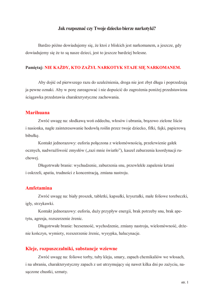 Jak rozpoznać czy Twoje dziecko bierze narkotyki? Bardzo późno dowiadujemy się, że ktoś z bliskich jest narkomanem, a jeszcze, gdy dowiadujemy się że to są nasze dzieci, jest to jeszcze bardziej bolesne. Pamiętaj: NIE KAŻDY, KTO ZAŻYŁ NARKOTYK STAJE SIĘ NARKOMANEM. Aby dojść od pierwszego razu do uzależnienia, droga nie jest zbyt długa i poprzedzają ja pewne oznaki. Aby w porę zareagować i nie dopuścić do zagrożenia poniżej przedstawiona ściągawka przedstawia charakterystyczne zachowania. Marihuana Zwróć uwagę na: słodkawą woń oddechu, włosów i ubrania, brązowo zielone liście i nasionka, nagłe zainteresowanie hodowlą roślin przez twoje dziecko, fifki, fajki, papierową bibułkę. Kontakt jednorazowy: euforia połączona z wielomównością, przekrwienie gałek ocznych, nadwrażliwość zmysłów („razi mnie światło”), kaszel zaburzenia koordynacji ruchowej. Długotrwałe branie: wychudzenie, zaburzenia snu, przewlekłe zapalenie krtani i oskrzeli, apatia, trudności z koncentracją, zmiana nastroju. Amfetamina Zwróć uwagę na: biały proszek, tabletki, kapsułki, kryształki, małe foliowe torebeczki, igły, strzykawki. Kontakt jednorazowy: euforia, duży przypływ energii, brak potrzeby snu, brak apetytu, agresja, rozszerzenie źrenic. Długotrwałe branie: bezsenność, wychodzenie, zmiany nastroju, wielomówność, drżenie kończyn, wymioty, rozszerzenie źrenic, wysypka, halucynacje. Kleje, rozpuszczalniki, substancje wziewne Zwróć uwagę na: foliowe torby, tuby kleju, smary, zapach chemikaliów we włosach, i na ubraniu, charakterystyczny zapach z ust utrzymujący się nawet kilka dni po zażyciu, nasączone chustki, szmaty. str. 1 Kontakt jednorazowy: niezborność ruchów, agresja, rozszerzenie źrenic, kichanie, kaszel, krwawienie z nosa, mdłości, wymioty, biegunki. Długotrwałe branie: wyniszczenie organizmu, przekrwienie spojówek, zaburzeni pamięci, niepokój, przygnębienie, zaburzeni snu, oczopląs, osłabienie mięśni. Sygnały mogące świadczyć, że Twoje dziecko może mieć kontakt ze środowiskiem narkotycznym nagłe zmiany nastroju (duża aktywność, zmęczenie), izolowanie i zamykanie się w sobie; nagła zmiana grona dotychczasowych przyjaciół na innych zwłaszcza starszych od siebie; spadek zainteresowania szkołą, sportem i ulubionymi zajęciami; izolowanie się od innych domowników, spędzanie większości czasu samotnie w swoim pokoju; kłamstwa i wykręty, wynoszenie z domu wartościowych przedmiotów, podkradanie pie- niędzy; niewytłumaczalne spóźnienia, tzw. ciche powroty do domu lub też przebywanie nocne poza domem bez uprzedzenia; tajemnicze, krótkie rozmowy telefoniczne; używanie tajemniczych określeń podczas rozmów. Co możesz zrobić? Zazwyczaj uciekanie dziecka w świat uzależnień wiąże się głównie z „niezrozumieniem” jego odczuć i potrzeb wieku młodzieńczego, oraz nie akceptowaniem środowiska i najbliższego otoczenia. Aby uniknąć takiego stanu w domu i kręgu rodzinnym, należy zwracać szczególna uwagę na to, co mówi i jakie ma problemy. Dobrze jest znaleźć czas na wysłuchanie problemów, unikać złośliwych i krytycznych porównań z innymi rówieśnikami. Młody człowiek doznaje w ten sposób urazu, czuje się odtrącony i niepotrzebny. Każdą anomalię w zachowaniu trzeba sprawdzić i poznać jej przyczynę, aby w porę podjąć odpowiednie działania. Tańsze jest zapobieganie aniżeli leczenie. Im wcześniej dojdzie do ujawnienia skłonności do środków narkotycznych, łatwiej jest nad tym zapanować. Jeżeli dojdzie jednak do faktu, że dziecko miało bezpośredni kontakt z narkotykiem, co w dzisiejszych czasach nie jest trudne, nie należy popadać w panikę. Należy zastanowić się nad przyczyną sięgnięcia po narkotyki. Może został podany wbrew woli? A może zaszło coś, co spowodowało chęć zwrócenia w ten sposób na siebie uwagi? Być może str. 2 nagromadziły się kłopoty w środowisku szkolnym czy koleżeńskim? A być może powstała nieodparta chęć zakosztowania „zakazanego owocu”? Należy się zastanowić, w jaki sposób Ty jako Rodzic, czy Opiekun możesz zaradzić, aby pomóc dziecku w wydostaniu się z matni. Najważniejszym jest wychwycenie symptomów narkotycznych skłonności. Nie wahaj się zasięgnąć porady u specjalisty, bo zwlekanie grozi tragedią, która oprócz dziecka dosięgnie również Ciebie. Na koniec pamiętaj o najważniejszym: rozmawiaj z dzieckiem w taki sposób, w jaki sam chciałbyś rozmawiać z kimś, kogo kochasz i od kogo potrzebujesz pomocy. Dziecko jest takim samym człowiekiem jak Ty, może czasami brak mu doświadczenia, ale czuje i widzi świat na swój sposób, a jego „wielkie” problemy są dla niego naprawdę WIELKIE. str. 3
