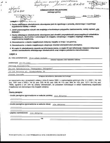 0 2c- Lae-, atta te 127164)der.) . 140e-V.XI, Q'2It4-Q d14 PR z aidif RA r int Rod /efri Ci; OtWIADCZENIE MAJATKOWE radnego gminy 4 01 0/1 I2P2/(1 PRZEW•NIG CY RAD I Suchowola , dnia N IC IF SK Thdeusz Wirkowsk 07-04-4044 F. (miejscowoad) u.Aág&idos/jtTdeusz Wirkowski 1.Osoba skladajeca otwiadczenie obowiwana jest do zgodnego z prawdq, starannego I zupe/nego wypernienia katclej z rubryk. 2.Jeieli poszczegolne rubryki nie znajduje w konkretnym przypadku zastosowania, naleiy wpisa6 „nie dotyczv". 3.Osoba sk/adajeca otwiadczenie obowiezana jest okretlie przynale2noto poszczeg6lnych sktadnikew majetkowych, dochodow i zobowiqzari do maktku odrebnego i majetku objetego maliefiske wspolnoacie majetkowq. 4.Otwiadczenie o stanie majetkowym dotyczy majetku w kraju i za granicq. 5.Otwiadczenie o stanie majetkowym obejmuje rowniet wierzytelnoaci pienietne. 6.W czetci A otwiadczenia zawarte se informacje jawne, w czetci B zat informacje niejawne dotyczece adresu zamieszkania skladajecego otwiadczenie oraz miejsca polWenia nieruchomotci. czqtd A Ja, ni2ej podpisany(a), Stanislaw Lodygo (imiona i nazwisko oraz nazwisko rodowe) urodzony(a) 0 9- 0 5 -1965 Dabrowa BiaIostocka Gminna SpoIdzielnia "Samopomoc ChIopska" 16-140 Korycin ul. Grodzienska 36 Prezes Zarzadu (rmejsce zatrudmema, stanowsko lub funkcja) pa zapoznaniu sig z przepisami ustawy z dnia 8 marca 19901. o samorzgdzie gminnym (Dz. U. z 2001 r. Ni 142, poz. 1591 oraz z 2002 r. Nr 23, poz. 220, Ni 62, Paz. 558, Ni 113, poz. 984, Ni 153, poz. 1271 i Ni 214, poz. 1806), zgodnie z art. 24h tej ustawy otwiadczam, 2e posiadam wchodzqce w Wad matteriskiej wspelnotci majqtkowej lub stanowikce moj majqtek odrgbny: Zasoby pienigine: - arodki pienic2ne zgromadzone w walucie polskiej: nie - Srodki pieniqine zgromadzone w walucie obcej: nie -papierywartoSciowe: nie dotyczy dotyczy na www.signformpl Sp. zoo., e-mail: BOK©signform.pl, tel./fax. (0-22) 626 92 95, (0-22) 626 92 97 AC Y dotyczy • 120 m 2, o wartoki: 120.000 zi 1. Dom o powierzchni: osobista tytut prawny: wiasno66 nie dotyczy m 2 , o wartoki: 2 Mieszkanie o powierzchni: tytut prawny: 3 Gospodarstwo rolne: rodzaj gospodarstwa: nie dotyczy , powierzchnia: o wartoki: rodzaj zabudowy: tytut prawny: Z tego tytutu osiqgnajem(elam) w roku ubieglym przychod i dochod w wysokoki: 4. Inne nieruchomoki: powierzchnia: 1031 o wartoki: 20.000 mkw zm tytuf prawny: wlasnoS6 osobista 1.Posiadam udzialy w spolkach handlowych z udziatem gminnych osOb prawnych lub przedsiebiorcow, w ktOrych uczestniczqtakie osoby — nale2y poda6 liczbe i emitenta udziatOw: nie dotyczy udzialy te stanowiq pakiet wiekszy ni2 10% udzialow w spOlce: Z toga tytufu osiqgnqtem(glam) w roku ubieglym doch6d w wysokoki: 2. Posiadam udzialy w innych spatkach handlowych — nale2y poda6 liczbe i emitenta udzialow: udziaiy czIonkowskie w Gminnej Spoldzielni 'SCh" Korycin warto66 2.705,89 zi Z toga tytutu osiagnalem(etam) w roku ubieglym dochod w wysokoki: o 1. Posiadam akcje w spOlkach handlowych z udzialem gminnych osOb prawnych lub przedsiebiorcow, w ktOrych uczestniczqtakie osoby — nale2y poda6 liczbe i emitenta akcji: nie dotyczy www.signform.pl Sp. zoo., e-mail: BOK6signform.pl, tel./fax. (0-22) 626 92 95, (0-22) 626 92 97 VII. W spotkach handlowych (nazwa, siedziba spetki): Gminna Spoldzielnia "Samopomoc Chlopska" 16-140 Korycin ul. Grodzienska 36 -jwItenicztonkienizarzajdu(ocIldedy): Luty 2000 roku - jestem cztonkiem rady nadzorczej (ad kiedy): -jestem czionkiem komisji rewizyjnej (od ktedy): Z tego tytutu osiagnatem(glam) w roku ubieglym dochod w wysokoeci: 42.159, 60 VIII. lnne dochody osiagane z tytutu zatrudnienia lub innej dziatalnoeci zarobkowej lub zajga, z podaniem kwot uzyskiwanych z kaidego tytutu: Prezes Zarzadu Gminnej Spoldzielni "SCh" w Korycinie - 42.159,60 Dieta radnego Rady Miejskiej w Suchowoli-4.500,00 Dieta Przewodniczacego Zgromadzenia Zwiazku Gmin "Kumiaika-Biebrza"-400,00 DC Sktadniki mienia ruchomego o wartoeci powy±ej 10 000 ztotych (w przypadku pojazdOw mechanicznych naleiy poda6 marl% model i rok produkcji): nie dotyczy X. Zobowiazania pienig±ne o wartoaci powyiej 10 000 ztotych, w tym zaciagnicte kredyty i po±yczki oraz warunki, na jakich zostaty udzielone (wobec kogo, w zwigzku z jakim zdarzeniem, w jakiej wysokoad): nie dotyczy www.signform,p1 Sp. zoo., e-mail: BOK©signform.pl, tel./fax. (0-22) 626 92 95, (0-22) 626 92 97 • akcje te stanowiq pakiet wiekszy ni± 10% akcji w spOtce: Z tego tytutu osiqgnqtem(etam) w roku ubieglym dochod w wysokoaci: 2. Posiadam akcje w innych spolkach handlowych — naleiy poda6 liczbe i emitenta akcji: nie dotyczy Z tego tytutu osiqgnqtem(clam) w roku ubieglym dochOd w wysokoaci: V. Nabytem(am) (nabyt m6j mattonek, z wytqczeniem mienia przynale2nego do jego majqtku odrebnego) od Skarbu Paristwa, innej paristwowej osoby prawnej, jednostek samorndu terytorialnego, ich zwiqzkow lub od komunalnej osoby prawnej nastepujace mienie, ktore podlegato zbyciu w drodze przetargu — nale2y poda6 opis mienia i date nabycia, ad kogo: nie dotyczy VI. 1.Prowadze dziatalnote gospodarczq (nalety poda6 forme prawnq i przedmiot dziatalnoeci): nie dotyczy - wspolnie z innymi osobami: Z tego tytutu osiqgnam(etam) w roku ubiegtym przych6d i doch6d w wysokoaci: 2. Zarzqdzam dziatalnotciq gospodarczq lub jestem przedstawicielem petnomocnikiem takiej dziatalnoaci (naleiy poda6 forme prawnq i przedmiot dziatalnoaci): rile dotyczy - wspolnie z innymi osobami: Z tego tytutu osiqgnatem(etam) w roku ubiegtym przychOd i dochod w wysokoSci: www.signforrn.pl Sp, z 00., e-mail: BOK(gsignform.pl , tel./fax. (0-22) 826 92 95, (0-22) 626 92 97 Powyzsze ogwiadczenie skladam gwiadomy(a), i na podstawie art. 233 § 1 Kodeksu kamego za padanie Meprawdy tub zatajenie prawdy grozi kara pozbawienia wolnaci. Suchowola 07-09-2011 (miejscowoat, data) 0 weetsignforrn.pl Sp. zoo., e-mail: [email protected], tel./fax. (0-22) 626 92 95. (0-22) 626 92 97