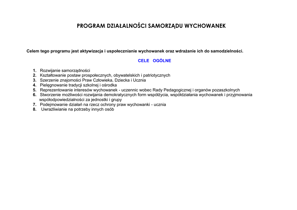 PROGRAM DZIAŁALNOŚCI SAMORZĄDU WYCHOWANEK