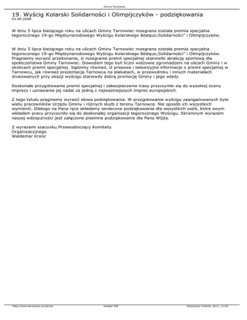 Gmina Tarnowiec 19. Wyścig Kolarski Solidarności i Olimpijczyków - podziękowania 03.09.2008. W dniu 5 lipca bieżącego roku na ulicach Gminy Tarnowiec rozegrana została premia specjalna tegorocznego 19-go Międzynarodowego Wyścigu Kolarskiego „Solidarności" i Olimpijczyków. W dniu 5 lipca bieżącego roku na ulicach Gminy Tarnowiec rozegrana została premia specjalna tegorocznego 19-go Międzynarodowego Wyścigu Kolarskiego „Solidarności" i Olimpijczyków. Pragniemy wyrazić przekonanie, iż rozegranie premii specjalnej stanowiło atrakcję sportową dla społeczeństwa Gminy Tarnowiec. Dowodem tego byli liczni widzowie zgromadzeni na ulicach Gminy i w okolicach premii specjalnej. Sądzimy również, iż prasowe i telewizyjne informacje o premii specjalnej w Tarnowcu, jak również prezentacja Tarnowca na plakatach, w przewodniku i innych materiałach drukowanych przy okazji wyścigu stanowiły dobrą promocję Gminy i jego władz. Doskonałe przygotowanie premii specjalnej i zabezpieczenie trasy przyczyniło się do wysokiej oceny imprezy i uznawanie jej nadal za jedną z najważniejszych imprez europejskich. Z tego tytułu pragniemy wyrazić słowa podziękowania. W przygotowanie wyścigu zaangażowanych było wielu pracowników Urzędu Gminy i różnych służb z terenu Tarnowca. Nie sposób ich wszystkich wymienić. Dlatego na Pana ręce składamy serdeczne podziękowania dla wszystkich osób, które swym wkładem pracy przyczyniły się do doskonałej organizacji tegorocznego Wyścigu. Skromnym wyrazem naszej wdzięczności jest załączone pisemne podziękowanie dla Pana Wójta. Z wyrazami szacunku.Przewodniczący Komitetu Organizacyjnego Waldemar Krenc http://www.tarnowiec.eu/strona Kreator PDF Utworzono 4 March, 2017, 11:02