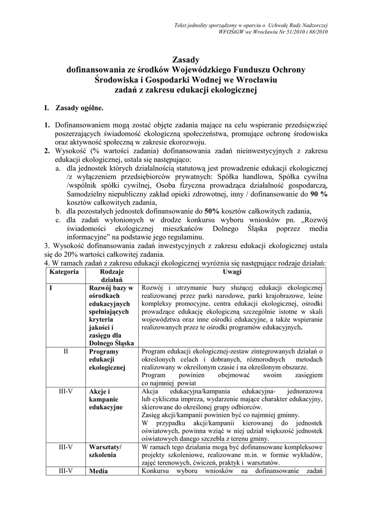 Tekst jednolity sporządzony w oparciu o Uchwałę Rady Nadzorczej WFOŚiGW we Wrocławiu Nr 51/2010 i 88/2010 Zasady dofinansowania ze środków Wojewódzkiego Funduszu Ochrony Środowiska i Gospodarki Wodnej we Wrocławiu zadań z zakresu edukacji ekologicznej I. Zasady ogólne. 1. Dofinansowaniem mogą zostać objęte zadania mające na celu wspieranie przedsięwzięć poszerzających świadomość ekologiczną społeczeństwa, promujące ochronę środowiska oraz aktywność społeczną w zakresie ekorozwoju. 2. Wysokość (% wartości zadania) dofinansowania zadań nieinwestycyjnych z zakresu edukacji ekologicznej, ustala się następująco: a. dla jednostek których działalnością statutową jest prowadzenie edukacji ekologicznej /z wyłączeniem przedsiębiorców prywatnych: Spółka handlowa, Spółka cywilna /wspólnik spółki cywilnej, Osoba fizyczna prowadząca działalność gospodarczą, Samodzielny niepubliczny zakład opieki zdrowotnej, inny / dofinansowanie do 90 % kosztów całkowitych zadania, b. dla pozostałych jednostek dofinansowanie do 50% kosztów całkowitych zadania, c. dla zadań wyłonionych w drodze konkursu wyboru wniosków pn. „Rozwój świadomości ekologicznej mieszkańców Dolnego Śląska poprzez media informacyjne” na podstawie jego regulaminu. 3. Wysokość dofinansowania zadań inwestycyjnych z zakresu edukacji ekologicznej ustala się do 20% wartości całkowitej zadania. 4. W ramach zadań z zakresu edukacji ekologicznej wyróżnia się następujące rodzaje działań: Kategoria I II Rodzaje działań Rozwój bazy w ośrodkach edukacyjnych spełniających kryteria jakości i zasięgu dla Dolnego Śląska Programy edukacji ekologicznej III-V Akcje i kampanie edukacyjne III-V Warsztaty/ szkolenia III-V Media Uwagi Rozwój i utrzymanie bazy służącej edukacji ekologicznej realizowanej przez parki narodowe, parki krajobrazowe, leśne kompleksy promocyjne, centra edukacji ekologicznej, ośrodki prowadzące edukację ekologiczną szczególnie istotne w skali województwa oraz inne ośrodki edukacyjne, a także wspieranie realizowanych przez te ośrodki programów edukacyjnych. Program edukacji ekologicznej-zestaw zintegrowanych działań o określonych celach i dobranych, różnorodnych metodach realizowany w określonym czasie i na określonym obszarze. Program powinien obejmować swoim zasięgiem co najmniej powiat Akcja edukacyjna/kampania edukacyjnajednorazowa lub cykliczna impreza, wydarzenie mające charakter edukacyjny, skierowane do określonej grupy odbiorców. Zasięg akcji/kampanii powinien być co najmniej gminny. W przypadku akcji/kampanii kierowanej do jednostek oświatowych, powinna wziąć w niej udział większość jednostek oświatowych danego szczebla z terenu gminy. W ramach tego działania mogą być dofinansowane kompleksowe projekty szkoleniowe, realizowane m.in. w formie wykładów, zajęć terenowych, ćwiczeń, praktyk i warsztatów. Konkursu wyboru wniosków na dofinansowanie zadań informacyjne VI VII Infrastruktura edukacji ekologicznej, w tym ścieżki przyrodnicze Wystawy/ konkursy pn. „Rozwój świadomości ekologicznej mieszkańców Dolnego Śląska poprzez media informacyjne” oraz zasady dofinansowania ich realizacji ze środków WFOŚiGW we Wrocławiu, zgodnie z odrębnym regulaminem, stanowiącym załącznik do niniejszych zasad. Infrastruktura powinna być ogólnodostępna. Dofinansowaniem mogą zostać objęte wystawy i konkursy o zasięgu co najmniej gminnym. VIII-X Konferencje/ seminaria Dofinansowaniem nie zostaną objęte konferencje/seminaria odbywające się poza granicami kraju. VIII-X Wydawnictwa VIII-X Prenumerata czasopism Dofinansowaniem mogą zostać objęte nieodpłatnie dystrybuowane wydawnictwa zwarte (np. książki, monografie, albumy, atlasy) oraz programy i gry komputerowe. Prenumerata może dotyczyć czasopism o charakterze ekologicznym przeznaczonych dla jednostek oświatowych (szkół podstawowych, gimnazjów, szkół ponadgimnazjalnych) na terenie województwa dolnośląskiego. Prenumerator zobowiązuje się do dystrybucji czasopisma zgodnie z przedstawioną przez Fundusz listą odbiorców. Dopuszcza się możliwość poszerzenia listy przedstawionej przez Fundusz o jednostki zaproponowane przez prenumeratora, stanowiące jednak nie więcej niż 30 % wszystkich podmiotów. Fundusz zastrzega sobie prawo ograniczenia prenumeraty do określonego typu szkół. 5. Wnioski na dofinansowanie przedmiotowych działań rozpatrywane będą cyklicznie. W związku z tym ustala się następujące terminy składania wniosków (decyduje data wpływu do Biura Funduszu): Sesja 1 - do dnia 15 marca każdego roku Sesja 2 - do dnia 30 czerwca każdego roku Sesja 3 – do dnia 30 września każdego roku Sesja 4 - do dnia 30 listopada każdego roku- dotycząca wniosków kwalifikowanych na rok następny Wnioski dotyczące zadań z zakresu dofinansowania prenumeraty czasopism do szkół należy składać do dnia 30 czerwca każdego roku na kolejny rok szkolny. Wnioski dotyczące zadań z zakresu dofinansowania wydawnictw należy składać do dnia 15 marca każdego roku ( w roku 2010 do dnia 30.09.2010r.). Wnioski, które wpłyną do Funduszu po wymienionych wyżej terminach lub będą niekompletne mogą być przedstawione do oceny w kolejnej sesji, za wyjątkiem wniosków z zakresu dofinansowania prenumeraty oraz z zakresu dofinansowania wydawnictw. II. Zasady uznawania kosztów i kalkulacji wartości zadań z zakresu edukacji ekologicznej. 2 1. Koszty kwalifikowane dotacji 1.1. Proponowane wydatki mogą zostać uznane za koszty realizacji zadania i finansowane w ramach przyznanej dotacji tylko wtedy, gdy: - są konieczne ze względu na realizację zadania, - są uwzględnione w harmonogramie rzeczowo-finansowym zadania, - spełniają wymogi efektywnego zarządzania finansami, w szczególności uzyskiwania wysokiej jakości za daną cenę, - zostały poniesione w okresie realizacji zadania, - zostały poni