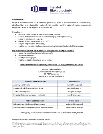Oferta pracy: Instytut Elektrotechniki w Warszawie poszukuje osób z doświadczeniem zawodowym, absolwentów oraz studentów wyższych lat studiów uczelni wyższych zainteresowanych podjęciem pracy w naszej jednostce badawczej. Oferujemy:  stabilne zatrudnienie w oparciu o umowę o pracę,  bardzo dobre wyposażenie w nowoczesną aparaturę badawczą,  pracę w przyjaznym zespole,  dostęp do baz naukowych, m.in. IEEE,  bogato wyposażoną bibliotekę,  możliwość rozwoju naukowego w ramach własnego Studium Doktoranckiego. Dla studentów wyższych lat studiów IEL kieruje swoją ofertę w zakresie:  wsparcia w realizacji prac dyplomowych,  staży zawodowych,  praktyk wakacyjnych,  możliwości zatrudnienia na część etatu. Osoby zainteresowane prosimy o składanie CV drogą emailową na adres: Instytut Elektrotechniki ul. Mieczysława Pożaryskiego 28 04-703 Warszawa email: w poniższych tabelach Dziedzina elektrotechniki Adres email: Aparaty elektryczne [email protected] Przekształtniki Energoelektroniczne [email protected] Trakcja Elektryczna [email protected] Pojazdy Elektryczne, napęd i zasilanie [email protected] Nazwa Laboratorium Adres email Laboratorium Badawcze i Wzorcujące [email protected] Laboratorium Badawcze Aparatury Rozdzielczej [email protected] Zastrzegamy sobie prawo do skontaktowania się z wybranymi kandydatami. W stopce CV prosimy o wpisanie następującej klauzuli. Wyrażam zgodę na przetwarzanie moich danych osobowych dla potrzeb niezbędnych do realizacji procesu rekrutacji (zgodnie z Ustawą z dnia 29.08.1997 roku o Ochronie Danych Osobowych; (tekst jednolity: Dz.U. z 2015r., poz. 2135).