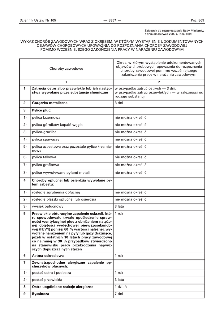 Dziennik Ustaw Nr 105 — 8357 — Poz. 869 Za∏àcznik do rozporzàdzenia Rady Ministrów z dnia 30 czerwca 2009 r. (poz. 869) WYKAZ CHORÓB ZAWODOWYCH WRAZ Z OKRESEM, W KTÓRYM WYSTÑPIENIE UDOKUMENTOWANYCH OBJAWÓW CHOROBOWYCH UPOWA˚NIA DO ROZPOZNANIA CHOROBY ZAWODOWEJ POMIMO WCZEÂNIEJSZEGO ZAKO¡CZENIA PRACY W NARA˚ENIU ZAWODOWYM Choroby zawodowe Okres, w którym wystàpienie udokumentowanych objawów chorobowych upowa˝nia do rozpoznania choroby zawodowej pomimo wczeÊniejszego zakoƒczenia pracy w nara˝eniu zawodowym 1 2 1. Zatrucia ostre albo przewlek∏e lub ich nast´p- w przypadku zatruç ostrych — 3 dni, stwa wywo∏ane przez substancje chemiczne w przypadku zatruç przewlek∏ych — w zale˝noÊci od rodzaju substancji 2. Goràczka metaliczna 3. Pylice p∏uc: 1) pylica krzemowa nie mo˝na okreÊliç 2) pylica górników kopalƒ w´gla nie mo˝na okreÊliç 3) pylico-gruêlica nie mo˝na okreÊliç 4) pylica spawaczy nie mo˝na okreÊliç 5) pylica azbestowa oraz pozosta∏e pylice krzemia- nie mo˝na okreÊliç nowe 6) pylica talkowa nie mo˝na okreÊliç 7) pylica grafitowa nie mo˝na okreÊliç 8) pylice wywo∏ywane py∏ami metali nie mo˝na okreÊliç 4. Choroby op∏ucnej lub osierdzia wywo∏ane py∏em azbestu: 1) rozleg∏e zgrubienia op∏ucnej nie mo˝na okreÊliç 2) rozleg∏e blaszki op∏ucnej lub osierdzia nie mo˝na okreÊliç 3) wysi´k op∏ucnowy 3 lata 5. Przewlek∏e obturacyjne zapalenie oskrzeli, któ- 1 rok re spowodowa∏o trwa∏e upoÊledzenie sprawnoÊci wentylacyjnej p∏uc z obni˝eniem nat´˝onej obj´toÊci wydechowej pierwszosekundowej (FEV1) poni˝ej 60 % wartoÊci nale˝nej, wywo∏ane nara˝eniem na py∏y lub gazy dra˝niàce, je˝eli w ostatnich 10 latach pracy zawodowej co najmniej w 30 % przypadków stwierdzono na stanowisku pracy przekroczenia najwy˝szych dopuszczalnych st´˝eƒ 6. Astma oskrzelowa 7. Zewnàtrzpochodne alergiczne zapalenie p´cherzyków p∏ucnych: 1) postaç ostra i podostra 1 rok 2) postaç przewlek∏a 3 lata 8. Ostre uogólnione reakcje alergiczne 1 dzieƒ 9. Byssinoza 7 dni 3 dni 1 rok Dziennik Ustaw Nr 105 — 8358 — 1 Poz. 869 2 10. Beryloza nie mo˝na okreÊliç 11. Choroby p∏uc wywo∏ane py∏em metali twardych nie mo˝na okreÊliç 12. Alergiczny nie˝yt nosa 13. Zapalenie obrz´kowe krtani o pod∏o˝u alergicz- 1 rok nym 14. Przedziurawienie przegrody nosa wywo∏ane 2 lata substancjami o dzia∏aniu ˝ràcym lub dra˝niàcym 15. Przewlek∏e choroby narzàdu g∏osu spowodowane nadmiernym wysi∏kiem g∏osowym, trwajàcym co najmniej 15 lat: 1) guzki g∏osowe twarde 2) wtórne zmiany przerostowe fa∏dów g∏osowych 2 lata 3) niedow∏ad mi´Êni wewn´trznych krtani z wrze- 2 lata cionowatà niedomykalnoÊcià fonacyjnà g∏oÊni i trwa∏à dysfonià 16. Choroby wywo∏ane dzia∏aniem promieniowania jonizujàcego: 1) ostra choroba popromienna uogólniona po na- 2 miesiàce promieniowaniu ca∏ego cia∏a lub przewa˝ajàcej jego cz´Êci 2) ostra choroba popromienna o charakterze 1 miesiàc zmian zapalnych lub zapalno-martwiczych skóry i tkanki podskórnej 3) przewlek∏e popromienne zapalenie skóry nie mo˝na okreÊliç 4) przewlek∏e uszkodzenie szpiku kostnego nie mo˝na okreÊliç 5) zaçma popromienna 10 lat 17. Nowotwory z∏oÊliwe powsta∏e w nast´pstwie dzia∏ania czynników wyst´pujàcych w Êrodowisku pracy, uznanych za rakotwórcze u ludzi: 1) rak p∏uca, rak oskrzela indywidualnie w zale˝noÊci od okresu latencji nowotworu 2) mi´dzyb∏oniak op∏ucnej albo otrzewnej indywidualnie w zale˝noÊci od okresu latencji nowotworu 3) nowotwór uk∏adu krwiotwórczego indywidualnie w zale˝noÊci od okresu latencji nowotworu 4) nowotwór skóry indywidualnie w zale˝noÊci od okresu latencji nowotworu 5) nowotwór p´cherza moczowego indywidualnie w zale˝noÊci od okresu latencji nowotworu 6) nowotwór wàtroby indywidualnie w zale˝noÊci od okresu latencji nowotworu 7) rak krtani indywidualnie w zale˝noÊci od okresu latencji nowotworu 8) nowotwór nosa i zatok przynosowych indywidualnie w zale˝noÊci od okresu latencji nowotworu 9) nowotwory wywo∏ane dzia∏aniem promienio- indywidualnie, po oszacowaniu ryzyka wania jonizujàcego z prawdopodobieƒstwem indukcji przekraczajàcym 10 % 1 rok 2 lata Dziennik Ustaw Nr 105 — 8359 — 1 Poz. 869 2 18. Choroby skóry: 1) alergiczne kontaktowe zapalenie skóry 2 lata 2) kontaktowe zapalenie skóry z podra˝nienia 1 miesiàc 3) tràdzik olejowy, smarowy lub chlorowy o rozleg- 1 miesiàc ∏ym charakterze 4) dro˝d˝akowe zapalenie skóry ràk u osób pracu- 1 miesiàc jàcych w warunkach sprzyjajàcych rozwojowi dro˝d˝aków chorobotwórczych 5) grzybice skóry u osób stykajàcych si´ z materia- 1 miesiàc ∏em biologicznym pochodzàcym od zwierzàt 6) pokrzywka kontaktowa 2 miesiàce 7) fotodermatozy zawodowe 2 lata 19. Przewlek∏e choroby uk∏adu ruchu wywo∏ane sposobem wykonywania pracy: 1) przewlek∏e zapalenie Êci´gna i jego pochewki 1 rok 2) przewlek∏e zapalenie kaletki maziowej 1 rok 3) przewlek∏e uszkodzenie ∏àkotki u osób wykonu- 1 rok jàcych prac´ w pozycji kl´czàcej lub kucznej 4) przewlek∏e zapalenie oko∏ostawowe barku 5) przewlek∏e zapalenie nadk∏ykcia koÊci ramiennej 1 rok 6) zm´czeniowe z∏amanie koÊci 20. Przewlek∏e choroby obwodowego uk∏adu nerwowego wywo∏ane sposobem wykonywania pracy: 1) zespó∏ cieÊni w obr´bie nadgarstka 1 rok 2) zespó∏ rowka nerwu ∏okciowego 1 rok 3) zespó∏ kana∏u de Guyona 1 rok 4) uszkodzenie nerwu strza∏kowego wspólnego 1 rok u osób wykonujàcych prac´ w pozycji kucznej 21. Obustronny trwa∏y odbiorczy ubytek s∏uchu ty- 2 lata pu Êlimakowego lub czuciowo-nerwowego spowodowany ha∏asem, wyra˝ony podwy˝szeniem progu s∏uchu o wielkoÊci co najmniej 45 dB w uchu lepiej s∏yszàcym, obliczony jako Êrednia arytmetyczna dla cz´stotliwoÊci audiometrycznych 1,2 i 3 kHz 22. Zespó∏ wibracyjny: 1) postaç naczyn