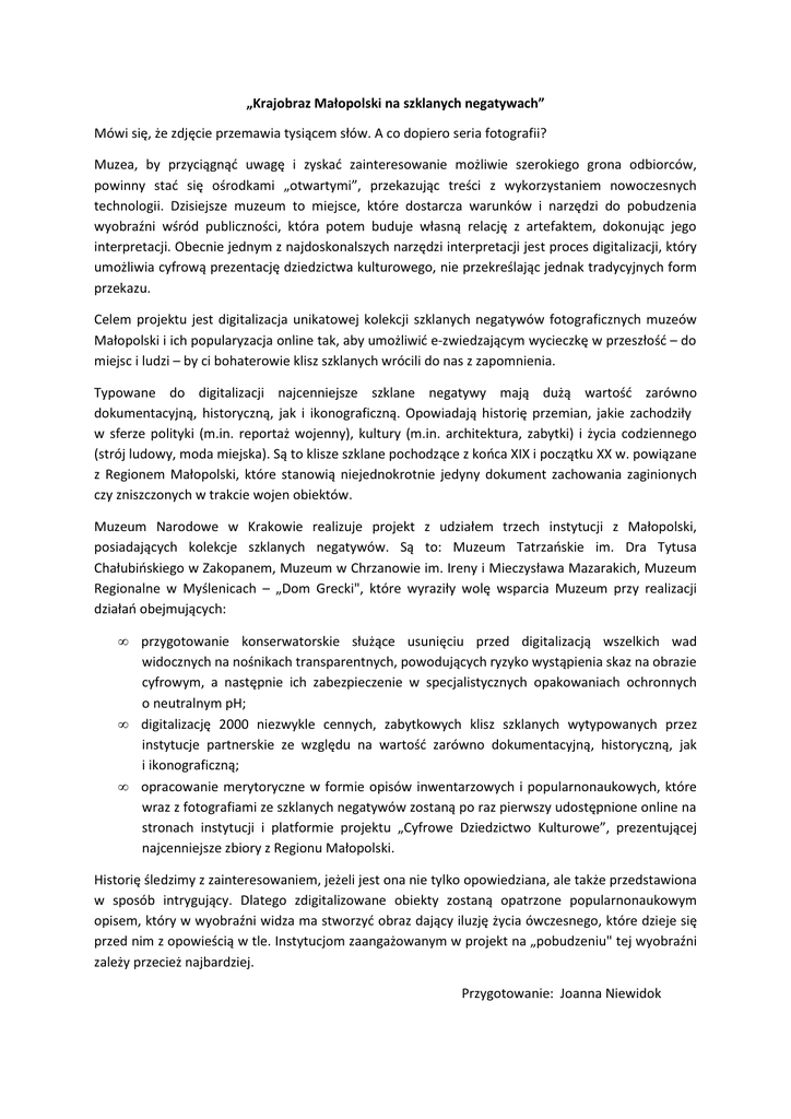„Krajobraz Małopolski na szklanych negatywach” Mówi się, że zdjęcie przemawia tysiącem słów. A co dopiero seria fotografii? Muzea, by przyciągnąć uwagę i zyskać zainteresowanie możliwie szerokiego grona odbiorców, powinny stać się ośrodkami „otwartymi”, przekazując treści z wykorzystaniem nowoczesnych technologii. Dzisiejsze muzeum to miejsce, które dostarcza warunków i narzędzi do pobudzenia wyobraźni wśród publiczności, która potem buduje własną relację z artefaktem, dokonując jego interpretacji. Obecnie jednym z najdoskonalszych narzędzi interpretacji jest proces digitalizacji, który umożliwia cyfrową prezentację dziedzictwa kulturowego, nie przekreślając jednak tradycyjnych form przekazu. Celem projektu jest digitalizacja unikatowej kolekcji szklanych negatywów fotograficznych muzeów Małopolski i ich popularyzacja online tak, aby umożliwić e-zwiedzającym wycieczkę w przeszłość – do miejsc i ludzi – by ci bohaterowie klisz szklanych wrócili do nas z zapomnienia. Typowane do digitalizacji najcenniejsze szklane negatywy mają dużą wartość zarówno dokumentacyjną, historyczną, jak i ikonograficzną. Opowiadają historię przemian, jakie zachodziły w sferze polityki (m.in. reportaż wojenny), kultury (m.in. architektura, zabytki) i życia codziennego (strój ludowy, moda miejska). Są to klisze szklane pochodzące z końca XIX i początku XX w. powiązane z Regionem Małopolski, które stanowią niejednokrotnie jedyny dokument zachowania zaginionych czy zniszczonych w trakcie wojen obiektów. Muzeum Narodowe w Krakowie realizuje projekt z udziałem trzech instytucji z Małopolski, posiadających kolekcje szklanych negatywów. Są to: Muzeum Tatrzańskie im. Dra Tytusa Chałubińskiego w Zakopanem, Muzeum w Chrzanowie im. Ireny i Mieczysława Mazarakich, Muzeum Regionalne w Myślenicach – „Dom Grecki", które wyraziły wolę wsparcia Muzeum przy realizacji działań obejmujących: • • • przygotowanie konserwatorskie służące usunięciu przed digitalizacją wszelkich wad widocznych na nośnikach transparentnych, powodujących ryzyko wystąpienia skaz na obrazie cyfrowym, a następnie ich zabezpieczenie w specjalistycznych opakowaniach ochronnych o neutralnym pH; digitalizację 2000 niezwykle cennych, zabytkowych klisz szklanych wytypowanych przez instytucje partnerskie ze względu na wartość zarówno dokumentacyjną, historyczną, jak i ikonograficzną; opracowanie merytoryczne w formie opisów inwentarzowych i popularnonaukowych, które wraz z fotografiami ze szklanych negatywów zostaną po raz pierwszy udostępnione online na stronach instytucji i platformie projektu „Cyfrowe Dziedzictwo Kulturowe”, prezentującej najcenniejsze zbiory z Regionu Małopolski. Historię śledzimy z zainteresowaniem, jeżeli jest ona nie tylko opowiedziana, ale także przedstawiona w sposób intrygujący. Dlatego zdigitalizowane obiekty zostaną opatrzone popularnonaukowym opisem, który w wyobraźni widza ma stworzyć obraz dający iluzję życia ówczesnego, które dzieje się przed nim z opowieścią w tle. Instytucjom zaangażowanym w projekt na „pobudzeniu" tej wyobraźni zależy przecież najbardziej. Przygotowanie: Joanna Niewidok