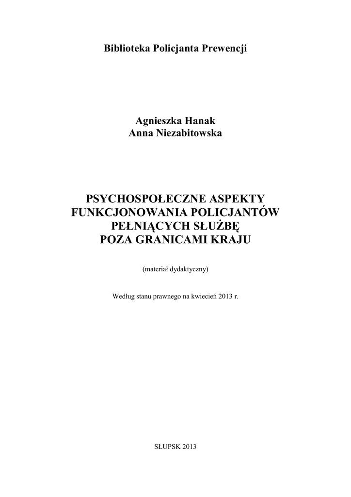 Biblioteka Policjanta Prewencji Agnieszka Hanak Anna Niezabitowska PSYCHOSPOŁECZNE ASPEKTY FUNKCJONOWANIA POLICJANTÓW PEŁNIĄCYCH SŁUŻBĘ POZA GRANICAMI KRAJU (materiał dydaktyczny) Według stanu prawnego na kwiecień 2013 r. SŁUPSK 2013 Materiał opracowany w Zakładzie Ogólnozawodowym Szkoły Policji w Słupsku Redakcja merytoryczna: Tomasz Gid Redakcja językowa i korekta: Grażyna Szot Projekt okładki: Marcin Jedynak Zatwierdzam i wprowadzam do użytku jako materiał dydaktyczny Wydawnictwo Szkoły Policji w Słupsku Słupsk 2013 2 Spis treści Wstęp .......................................................................................................................................................................... 1. Fazy funkcjonowania grupy, role grupowe, normy i przywództwo ............... 2. Zróżnicowanie międzykulturowe, etnocentryzm, stereotypy i uprzedzenia ................................................................................................................................................ 3. Stres pourazowy, zasady udzielania wsparcia po traumie ..................................... 4. Symptomy i etapy samobójstwa, pomoc osobie zagrożonej samobójstwem ............................................................................................................................................ Zakończenie .......................................................................................................................................................... Wykaz tabel ........................................................................................................................................................... Wykaz rycin .......................................................................................................................................................... Bibliografia ............................................................................................................................................................ 5 7 25 34 41 59 60 60 61 3 Ta strona jest pusta 4 Wstęp Skąd pomysł na niniejszą publikację? Szkoła Policji w Słupsku od kilkunastu lat, jako jedyna w Polsce, kształci policjantów do profesjonalnego pełnienia służby poza granicami kraju. Dobre przygotowanie policjantów i realizacja zadań na najwyższym poziomie zależą w znacznym stopniu od ich wiedzy psychologicznej i praktycznych umiejętności nie tylko funkcjonowania w odmiennej kulturze, ale również radzenia sobie w sytuacjach silnie stresujących, kryzysowych, gdy jedyne wsparcie udzielane jest przez kadrę dowódczą i policjantów funkcjonujących w ramach kontyngentu. Prowadząc zajęcia na kursach specjalistycznych dla kadry dowódczej kontyngentów policyjnych i policjantów pełniących służbę w jednostkach Policji w ramach kontyngentów policyjnych, spotykamy się z różnymi pytaniami dotyczącymi praktycznych, psychologicznych aspektów pełnienia służby poza granicami kraju. Często podczas zajęć z praw człowieka i psychologii policjanci wykazywali żywe zainteresowanie treściami znacznie wychodzącymi poza obszar omawianej problematyki. Zgłaszali potrzebę poznania praktycznych umiejętności kształtowania grupy, sposobów działania w odmiennym kulturowo środowisku, wpływu stresu na funkcjonowanie psychofizyczne osoby, w tym na możliwość pojawienia się symptomów samobójczych. Dlatego chcąc zaspokoić oczekiwania policjantów, w rozdziale pierwszym omówiłyśmy elementy charakteryzujące każdy zespół zadaniowy z uwzględnieniem sytuacji krytycznych i zabiegów, które świadomie stosowane przyczyniają się do budowania poczucia jedności w zespole, przynależności do grupy i skupienia jej wokół zadań przewidzianych mandatem misji – tak, by zespół mógł nie tylko efektywnie działać, ale i potrafił wspierać się w sytuacjach kryzysowych związanych z podejmowanymi interwencjami, jak również funkcjonowaniem w sytuacji separacji od naturalnego źródła wsparcia – bliskich. Funkcjonowanie w odmiennym kulturowo środowisku, interwencje wobec osób różniących się religią, zwyczajami, komunikatami pozawerbalnymi mogą powodować stres kulturowy, szczególnie u tych policjantów, którzy na misję wyjeżdżają po raz pierwszy. Stąd w rozdziale drugim pojawiła się problematyka dotycząca zróżnicowania kulturowego, omówiona została perspektywa patrzenia na odmienną kulturę przez pryzmat etnocentryzmu znacznie zakłócającego proces zrozumienia i szacunku dla dorobku odrębnej kultury. Mowa jest także o budowaniu mostu kulturowego poprzez unikanie stereotypów i uprzedzeń oraz nastawianie się na tolerancję, zrozumienie innych. Każdy policjant pełniący służbę w ramach kontyngentów policyjnych ma świadomość ryzyka, które taka służba ze sobą niesie. Zagrożenie utraty zdrowia lub życia związane z interwencjami na terenie dotkniętym konfliktem to niewątpliwie najistotniejszy czynnik traumatyczny. Należy również zwrócić uwagę na inne stałe stresory mające wpływ na kondycję psychofizyczną policjanta: rozłą5 kę z bliskimi, odmienność warunków kulturowych, klimatycznych, konieczność stałego funkcjonowania w hermetycznej grupie. Z tego powodu w rozdziale trzecim opisana została problematyka reakcji na zdarzenie traumatyczne i zasady udzielania wsparcia po jego zaistnieniu. Przeżywany stres, sytuacja urazowa mogą mieć wpływ na utratę lub zmianę poczucia własnej wartości, prowadzić do stanów lęku, depresji, a w konsekwencji do rozwoju syndromu przedsamobójczego. Potrzeba poznania możliwych działań profilaktycznych i symptomów samobójczych wywołuje na zajęciach pytania dotyczące tej problematyki. Cieszy nas poczucie odpowiedzialności za innych widoczne zarówno w zainteresowaniu tymi zagadnieniami kadry dowódczej, jak i podległych im na misji policjantów. Dlatego też w rozdziale czwartym kompleksowo zostały omówio