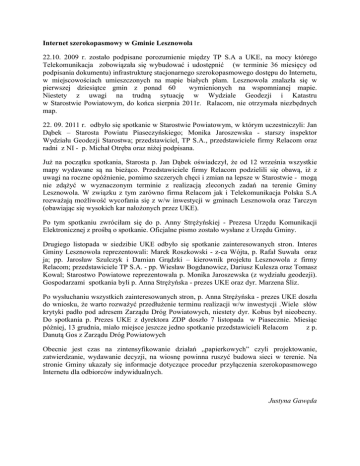 Internet szerokopasmowy w Gminie Lesznowola 22.10. 2009 r. zostało podpisane porozumienie między TP S.A a UKE, na mocy którego Telekomunikacja zobowiązała się wybudować i udostępnić (w terminie 36 miesięcy od podpisania dokumentu) infrastrukturę stacjonarnego szerokopasmowego dostępu do Internetu, w miejscowościach umieszczonych na mapie białych plam. Lesznowola znalazła się w pierwszej dziesiątce gmin z ponad 60 wymienionych na wspomnianej mapie. Niestety z uwagi na trudną sytuację w Wydziale Geodezji i Katastru w Starostwie Powiatowym, do końca sierpnia 2011r. Ralacom, nie otrzymała niezbędnych map. 22. 09. 2011 r. odbyło się spotkanie w Starostwie Powiatowym, w którym uczestniczyli: Jan Dąbek – Starosta Powiatu Piaseczyńskiego; Monika Jaroszewska - starszy inspektor Wydziału Geodezji Starostwa; przedstawiciel, TP S.A., przedstawiciele firmy Relacom oraz radni z NI - p. Michał Otręba oraz niżej podpisana. Już na początku spotkania, Starosta p. Jan Dąbek oświadczył, że od 12 września wszystkie mapy wydawane są na bieżąco. Przedstawiciele firmy Relacom podzielili się obawą, iż z uwagi na roczne opóźnienie, pomimo szczerych chęci i zmian na lepsze w Starostwie - mogą nie zdążyć w wyznaczonym terminie z realizacją zleconych zadań na terenie Gminy Lesznowola. W związku z tym zarówno firma Relacom jak i Telekomunikacja Polska S.A rozważają możliwość wycofania się z w/w inwestycji w gminach Lesznowola oraz Tarczyn (obawiając się wysokich kar nałożonych przez UKE). Po tym spotkaniu zwróciłam się do p. Anny Strężyńskiej - Prezesa Urzędu Komunikacji Elektronicznej z prośbą o spotkanie. Oficjalne pismo zostało wysłane z Urzędu Gminy. Drugiego listopada w siedzibie UKE odbyło się spotkanie zainteresowanych stron. Interes Gminy Lesznowola reprezentowali: Marek Roszkowski - z-ca Wójta, p. Rafał Suwała oraz ja; pp. Jarosław Szulczyk i Damian Grądzki – kierownik projektu Lesznowola z firmy Relacom; przedstawiciele TP S.A. - pp. Wiesław Bogdanowicz, Dariusz Kulesza oraz Tomasz Kowal; Starostwo Powiatowe reprezentowała p. Monika Jaroszewska (z wydziału geodezji). Gospodarzami spotkania byli p. Anna Strężyńska - prezes UKE oraz dyr. Marzena Śliz. Po wysłuchaniu wszystkich zainteresowanych stron, p. Anna Strężyńska - prezes UKE doszła do wniosku, że warto rozważyć przedłużenie terminu realizacji w/w inwestycji .Wiele słów krytyki padło pod adresem Zarządu Dróg Powiatowych, niestety dyr. Kobus był nieobecny. Do spotkania p. Prezes UKE z dyrektora ZDP doszło 7 listopada w Piasecznie. Miesiąc później, 13 grudnia, miało miejsce jeszcze jedno spotkanie przedstawicieli Relacom z p. Danutą Gos z Zarządu Dróg Powiatowych Obecnie jest czas na zintensyfikowanie działań „papierkowych” czyli projektowanie, zatwierdzanie, wydawanie decyzji, na wiosnę powinna ruszyć budowa sieci w terenie. Na stronie Gminy ukazały się informacje dotyczące procedur przyłączenia szerokopasmowego Internetu dla odbiorców indywidualnych. Justyna Gawęda