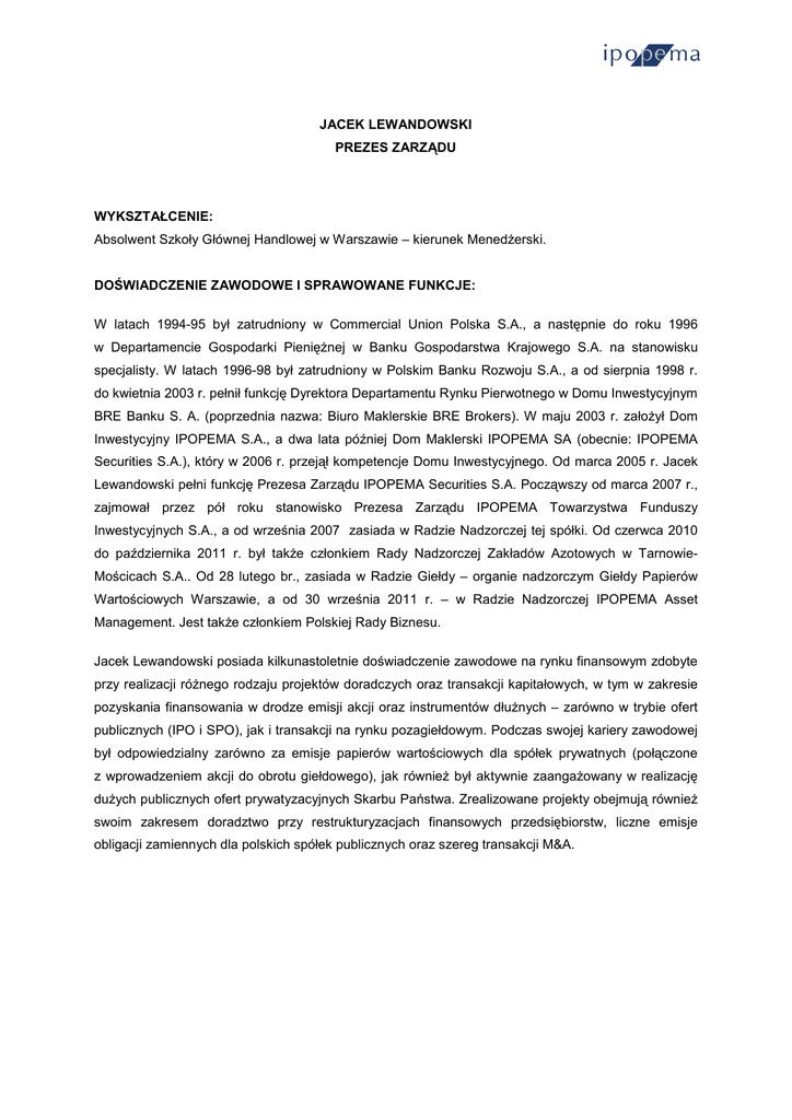 JACEK LEWANDOWSKI PREZES ZARZĄDU WYKSZTAŁCENIE: Absolwent Szkoły Głównej Handlowej w Warszawie – kierunek Menedżerski. DOŚWIADCZENIE ZAWODOWE I SPRAWOWANE FUNKCJE: W latach 1994-95 był zatrudniony w Commercial Union Polska S.A., a następnie do roku 1996 w Departamencie Gospodarki Pieniężnej w Banku Gospodarstwa Krajowego S.A. na stanowisku specjalisty. W latach 1996-98 był zatrudniony w Polskim Banku Rozwoju S.A., a od sierpnia 1998 r. do kwietnia 2003 r. pełnił funkcję Dyrektora Departamentu Rynku Pierwotnego w Domu Inwestycyjnym BRE Banku S. A. (poprzednia nazwa: Biuro Maklerskie BRE Brokers). W maju 2003 r. założył Dom Inwestycyjny IPOPEMA S.A., a dwa lata później Dom Maklerski IPOPEMA SA (obecnie: IPOPEMA Securities S.A.), który w 2006 r. przejął kompetencje Domu Inwestycyjnego. Od marca 2005 r. Jacek Lewandowski pełni funkcję Prezesa Zarządu IPOPEMA Securities S.A. Począwszy od marca 2007 r., zajmował przez pół roku stanowisko Prezesa Zarządu IPOPEMA Towarzystwa Funduszy Inwestycyjnych S.A., a od września 2007 zasiada w Radzie Nadzorczej tej spółki. Od czerwca 2010 do października 2011 r. był także członkiem Rady Nadzorczej Zakładów Azotowych w TarnowieMościcach S.A.. Od 28 lutego br., zasiada w Radzie Giełdy – organie nadzorczym Giełdy Papierów Wartościowych Warszawie, a od 30 września 2011 r. – w Radzie Nadzorczej IPOPEMA Asset Management. Jest także członkiem Polskiej Rady Biznesu. Jacek Lewandowski posiada kilkunastoletnie doświadczenie zawodowe na rynku finansowym zdobyte przy realizacji różnego rodzaju projektów doradczych oraz transakcji kapitałowych, w tym w zakresie pozyskania finansowania w drodze emisji akcji oraz instrumentów dłużnych – zarówno w trybie ofert publicznych (IPO i SPO), jak i transakcji na rynku pozagiełdowym. Podczas swojej kariery zawodowej był odpowiedzialny zarówno za emisje papierów wartościowych dla spółek prywatnych (połączone z wprowadzeniem akcji do obrotu giełdowego), jak również był aktywnie zaangażowany w realizację dużych publicznych ofert prywatyzacyjnych Skarbu Państwa. Zrealizowane projekty obejmują również swoim zakresem doradztwo przy restrukturyzacjach finansowych przedsiębiorstw, liczne emisje obligacji zamiennych dla polskich spółek publicznych oraz szereg transakcji M&A.