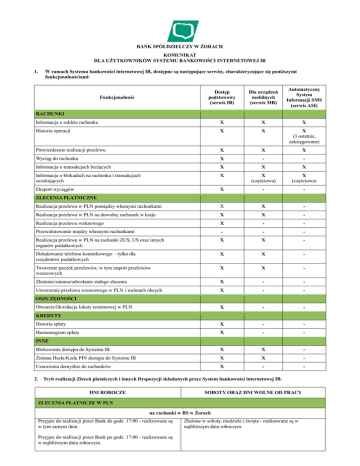 BANK SPÓŁDZIELCZY W ŻORACH KOMUNIKAT DLA UŻYTKOWNIKÓW SYSTEMU BANKOWOŚCI INTERNETOWEJ IB 1. W ramach Systemu bankowości internetowej IB, dostępne są następujące serwisy, charakteryzujące się poniższymi funkcjonalnościami: Dostęp podstawowy (serwis IB) Dla urządzeń mobilnych (serwis MB) Automatyczny System Informacji SMS (serwis ASI) Informacja o saldzie rachunku X X X Historia operacji X X X (3 ostatnie, zaksięgowane) Potwierdzenie realizacji przelewu X X X Wyciąg do rachunku X - - Informacja o transakcjach bieżących X X X Informacja o blokadach na rachunku i transakcjach oczekujących X X (częściowa) X (częściowa) Eksport wyciągów X - - Realizacja przelewu w PLN pomiędzy własnymi rachunkami X X - Realizacja przelewu w PLN na dowolny rachunek w kraju X X - Realizacja przelewu walutowego X - - Przewalutowanie między własnymi rachunkami - - - Realizacja przelewu w PLN na rachunki ZUS, US oraz innych organów podatkowych X X - Doładowanie telefonu komórkowego – tylko dla rezydentów podatkowych X X - Tworzenie paczek przelewów, w tym import przelewów wzorcowych X X - Złożenie/zmiana/odwołanie stałego zlecenia X - - Utworzenie przelewu wzorcowego w PLN i walutach obcych X - - X - - Historia spłaty X - - Harmonogram spłaty X - - Blokowanie dostępu do Systemu IB X X - Zmiana Hasła/Kodu PIN dostępu do Systemu IB X X - Ustawienia domyślne do rachunków X - - Funkcjonalność RACHUNKI ZLECENIA PŁATNICZNE OSZCZĘDNOŚCI Otwarcie/likwidacja lokaty terminowej w PLN KREDYTY INNE 2. Tryb realizacji Zleceń płatniczych i innych Dyspozycji składanych przez System bankowości internetowej IB. DNI ROBOCZE SOBOTY ORAZ DNI WOLNE OD PRACY ZLECENIA PŁATNICZE W PLN na rachunki w BS w Żorach Przyjęte do realizacji przez Bank do godz. 17:00 - realizowane są w tym samym dniu. Przyjęte do realizacji przez Bank po godz. 17:00 - realizowane są w najbliższym dniu roboczym. Złożone w soboty, niedziele i święta - realizowane są w najbliższym dniu roboczym. na rachunki w innych bankach Przyjęte do realizacji przez Bank do godz. 6:30 - realizowane są w tym samym dniu. Bank wysyła polecenia przelewu na I sesję Elixir* Złożone w soboty, niedziele i święta - realizowane są w najbliższym dniu roboczym. Przyjęte do realizacji przez Bank od godz. 6:31 do godz. 10:45 realizowane są w tym samym dniu. Bank wysyła polecenia przelewu na II sesję Elixir* Przyjęte do realizacji przez Bank od godz. 10:45 do godz.13:45 realizowane są w tym samym dniu. Bank wysyła polecenia przelewu na III sesję Elixir* Przyjęte do realizacji przez Bank od godz. 13:46 do godz. 17:00 są przekazywane do rozliczeń międzybankowych w najbliższym dniu roboczym, natomiast w dniu złożenia polecenia przelewu następuje obciążenie rachunku zleceniodawcy. Przyjęte do realizacji przez Bank po godz. 17:00 - realizowane są w najbliższym dniu roboczym. Przelew w systemie SORBNET (w tym powyżej kwoty 1 000 000 PLN) przyjmowany jest od godz. 8:00 do godz. 14:00 na dzień bieżący Brak możliwości złożenia zlecenia przelewu w systemie SORBNET Przyjęte do realizacji jako przelewy ekspresowe (BlueCash**) – realizowane są w trybie 24/7 (ograniczenie kwotowe do 10 000 PLN) Płatności z wykorzystaniem serwisu PayByNet*, oraz innych, które KIR udostępni w ramach usługi PayByNet* – realizowane są w trybie 24/7 Doładowania telefonów komórkowych – realizowane są w trybie 24/7 z odroczoną datą płatności złożone za pośrednictwem Systemu IB Realizowane są stosownie do wskazanej przez Klienta daty płatności. W przypadku daty płatności przypadającej na dzień wolny od pracy realizacja nastąpi w najbliższym dniu roboczym. stałe zlecenia Realizacja płatności w ramach stałego zlecenia następuje zgodnie z Tabelą z pkt 2 „Zlecenia płatnicze w PLN”. DYSPOZYCJE DOTYCZĄCE ZLECEŃ WALUTOWYCH na rachunki w BS w Żorach Zlecenia złożone danego dnia do godz. 12:00- realizowane są w tym samym dniu. Złożone w soboty oraz dni wolne od pracy realizowane są w najbliższym dniu roboczym. Zlecenia złożone po godz. 12:00 - realizowane są w najbliższym dniu roboczym. na rachunki w innych bankach Zlecenia złożone danego dnia do godz. 12:00- realizowane są w tym samym dniu. Złożone w soboty oraz dni wolne od pracy realizowane są w najbliższym dniu roboczym. Zlecenia złożone po godz. 12:00 - realizowane są w najbliższym dniu roboczym. OTWARCIE LOKATY Przyjęte do realizacji przez Bank do godz. 17:00 - realizowane są w tym samym dniu. Złożone w soboty oraz dni wolne od pracy realizowane są w najbliższym dniu roboczym. Przyjęte do realizacji przez Bank po godz. 17:00 - realizowane są w najbliższym dniu roboczym. ZERWANIE LOKATY PRZED TERMINEM Przyjęte do realizacji przez Bank do godz. 16:00 - realizowane są w tym samym dniu. Złożone w dni wolne od pracy realizowane są w najbliższym dniu roboczym. Przyjęte do realizacji przez Bank po godz. 16:00 - realizowane są w najbliższym dniu roboczym. *Elixir, PayByNet – czyli elektroniczny system rozliczeń międzybankowych realizujący zlecenia płatnicze, w tym polecenia przelewu pomiędzy rachunkami w bankach w Polsce za pośrednictwem Krajowej Izby Rozliczeniowej (KIR). **BlueCash – elektroniczny system szybkich przelewów międzybankowych realizowanych w czasie rzeczywistym za pośrednictwem BlueMedia. 3. Kontakt dla usług I-Bank: - kanał podstawowy: BSZory - kanał awaryjny/zastępczy: +48 782 078 778 Dla usługi Kod SMS (autoryzacja), Serwis ASI Techniczne wsparcie dla Klientów bankowości elektronicznej I-Bank +48 32 43 42 725