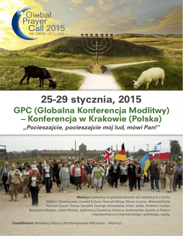 25-29 stycznia, 2015 GPC (Globalna Konferencja Modlitwy) – Konferencja w Krakowie (Polska) „Pocieszajcie, pocieszajcie mój lud, mówi Pan!” Mówcy (czekamy na potwierdzenie od niektórych z nich): Willem Glashouwer, Harald Eckert, Henryk Wieja, Marie-Louise Weissenböck, Roman Gavel, Tomas Sandell, George Annadoral, Sister Joela, Andrew Tucker, Benjamin Berger, Jobst Bittner, żydowscy/izraelscy mówcy, Ambasador Izraela w Polsce i reprezentanci z niemieckiego i polskiego rządu. Uwielbienie: Breaking Silence (Przełamywanie Milczenia – Niemcy). „Pocieszajcie, pocieszajcie, mój lud, mówi Pan!” to centralny temat Konferencji GPC w Krakowie/Oświęcimiu (Polska), 25-29 stycznia, 2015. W tym głęboko poruszającym wersie z Iz 40, 1, Bóg Izraela wzywa nas, nieżydowskich wierzących, byśmy pocieszali jego lud, który przeszedł przez tak wiele cierpienia. 27 stycznia, 1945 roku, został wyzwolony Obóz Koncentracyjny w Oświęcimiu, gdzie ponad milion Żydów zostało systematycznie i brutalnie wymordowanych w ciągu zaledwie trzech lat. Oświęcim stał się symbolem Holokaustu, w ciągu którego, w latach 1940-1945, zginęło 6 milionów spośród 13 milionów Żydów żyjących w tamtym czasie w Europie – było to dokładnie 70 lat temu. W latach 2005-2006 Unia Europejska wraz z Organizacją Narodów Zjednoczonych ustanowiły dzień 27 stycznia oficjalnym Dniem Pamięci Holokaustu. Nienawiść Żydów, jaka panowała wśród Kościoła Chrześcijańskiego w Europie (zarówno wśród katolików jak i protestantów), była głównym czynnikiem przygotowującym drogę dla Holokaustu. Począwszy od ojców wczesnego kościoła, poprzez wielkiego reformatora, Martina Lutra, teologia zastępcza, której głównym założeniem jest stwierdzenie, ze Bóg odrzucił Żydów, ponieważ oni odrzucili Jezusa, przeniknęła do europejskiego Kościoła. Nie tylko Kościół, ale również większość europejskich narodów zjednoczyło się w swojej niechęci, nieufności, czy nawet nienawiści wobec Żydów. Większość pozostałych przyjęło postawę obojętności. Te postawy, które były szczególnie silne w Niemczech pomogły Hitlerowi dojść do władzy i uczyniły mu drogę do „ostatecznego rozwiązania” – Holokaustu. 27 stycznia, 2015 r., jako reprezentanci modlącego się i pokutującego Kościoła w Europie, zapraszamy modlących się chrześcijan na całym świecie, aby dołączyli do nas w tym wołaniu do Pana, Boga Izraela, w duchu Daniela 9. Wyznawajmy razem grzechy naszych ojców i pokutujmy z nich! Odwróćmy się od naszych złych dróg, w przeszłości i obecnie! Nauczmy się z historii i pielęgnujmy ciepłe, kochające i pełne współczucia serce wobec Żydów w świetle tego, co musieli wycierpieć! Niech Bóg przemieni nas, modlących się chrześcijan i chrześcijan, na których ciąży odpowiedzialność, by być bardziej wrażliwymi, czujnymi i bijącymi na alarm w odniesieniu do trudnego położenia Jego Ludu! I niech Pan zwiększy nasze namaszczenie, aby powstać i stanąć za ludem żydowskim i narodem Izraela w tych dniach i w tym pokoleniu – szczególnie, kiedy widzimy, ze Żydom znów grozi drugi Holokaust przez jawną nienawiść świata Muzułmańskiego i rosnącego ogólnoświatowego antysemityzmu. Jako europejskie posługi, drodzy bracia i siostry na całym świecie, gorąco zapraszamy i mocno zachęcamy, abyście przysłali swoje narodowe delegacje modlących się liderów i przywódców waszych kościołów na Konferencję GPC w Krakowie, w Polsce (25-29 stycznia, 2015), rozpoczynającą 100-dniową modlitwę (i częściowy post). Program: 25 stycznia: dzień przybycia, 18.00 obiad w miejscu konferencji w hotelu Aspel (dla uczestników, którzy zapłacili pełną cenę). Pierwsza wieczorna sesja dla wszystkich uczestników rozpoczyna się o 19.30 (zakończenie o 22.00). 26 stycznia: Rano: Autobusy (wyruszające z Krakowa) zawiozą nas do Obozu Koncentracyjnego w Oświęcimiu. Późny ranek: wycieczka z przewodnikiem po Oświęcimiu. Lunch w prowiancie (dla uczestników, którzy zapłacili pełną cenę). Od 14.30-17.00 spotkanie z Benjaminem Bergerem w OświęcimiuBrzezince. Powrót autobusami do Krakowa na obiad w hotelu Aspel (dla uczestników, którzy zapłacili pełną cenę). Wieczorem nie będzie już sesji. 27 stycznia: 9.30-17.30 konferencja modlitewna. Lunch i obiad w hotelu Aspel (dla uczestników, którzy zapłacili pełną cenę). 19.15 Szczególny koncert dla uczczenia pamięci w Synagodze Świątyni w Krakowie wraz z żydowskimi/ izraelskimi i oficjalnymi niemiecko/polskimi gośćmi i uczestnikami konferencji. 28 stycznia: 9.30-17.30 Rozpoczęcie 100 dni modlitwy: dzielenie się wizją, nauczanie, czas modlitwy. Lunch i obiad w hotelu Aspel (dla uczestników, którzy zapłacili pełną cenę). Wieczorna sesja o 19.30: „Co zabierzemy ze sobą do domu i gdzie się stąd udamy?” 29 stycznia: Ostatnie śniadanie i odjazd. Miejsce konferencjin Centrum Aspel (Hotel Aspel), ul. Bratysławska 2, 31-201 Kraków (www.hotelaspel.pl) Podróż Kontakt Samolotem: Międzynarodowy Port Lotniczy w Krakowie (Polska) Dobre połączenia pociągiem i samochodem z lotniska. W mieście: Taxi lub publiczny transport. Narodowy koordynator dla Polski: Irena Stankiewicz [email protected] oraz Dr Henryk Wieja [email protected] Zakwaterowanie Ogólne Pytania dotyczące konferencji w Krakowie prosimy kierować do Kasi Kucharskiej [email protected] Tel.: 0048 501 77 48 95 Dostępne są 2 hotele w różnych kategoriach cenowych (trzygwiazdkowe i czterogwiazdkowe). Hotele te położone są w odległości 1,5 km od miejsca konferencji (20 min autobusem) i 1 km od Starego Miasta (10-15 min piechotą). Są to Hotel IBIS Kraków Centrum i Novotel Hotel Kraków Centrum. Proszę zarezerwujcie pokoje hotelowe używając specjalnego formularza rejestracyjnego GPC, który znajduje się na naszej stronie internetowej www.100-days.eu, aby otrzymać specjalne ceny