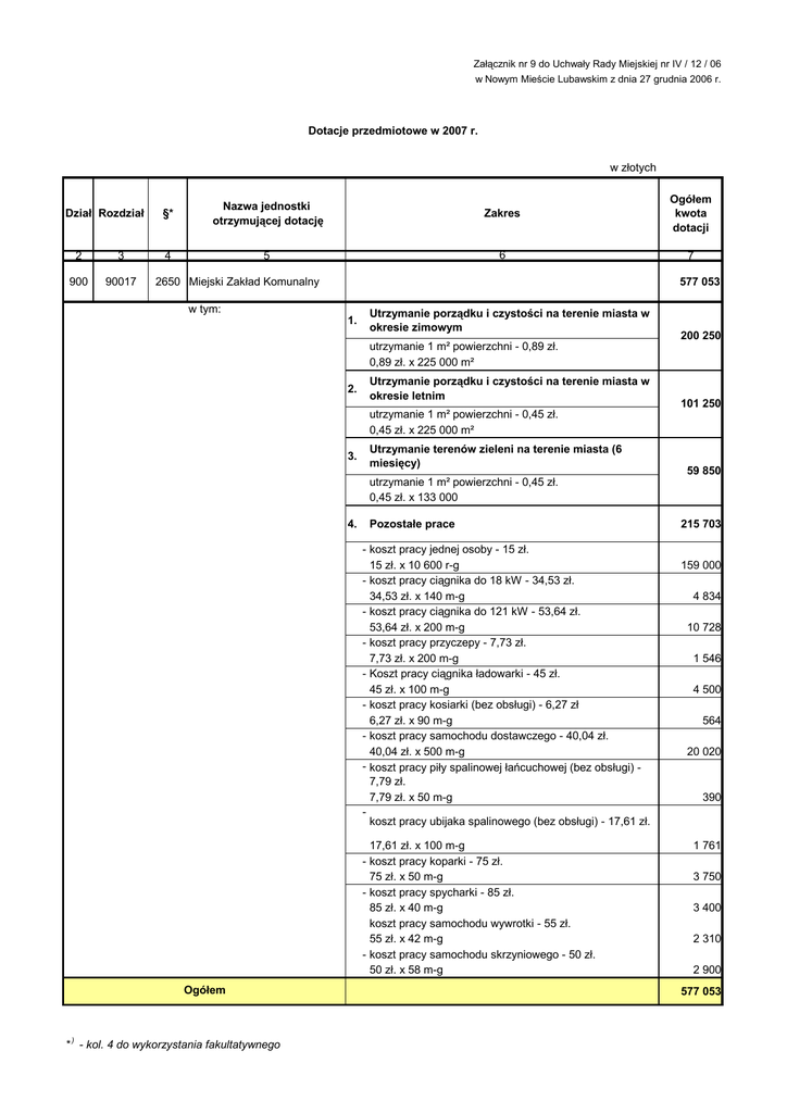 Załącznik nr 9 do Uchwały Rady Miejskiej nr IV / 12 / 06 w Nowym Mieście Lubawskim z dnia 27 grudnia 2006 r. Dotacje przedmiotowe w 2007 r. w złotych Dział Rozdział 2 3 900 90017 §* Nazwa jednostki otrzymującej dotację Zakres Ogółem kwota dotacji 4 5 6 7 2650 Miejski Zakład Komunalny 577 053 w tym: 1. Utrzymanie porządku i czystości na terenie miasta w okresie zimowym 200 250 utrzymanie 1 m² powierzchni - 0,89 zł. 0,89 zł. x 225 000 m² 2. Utrzymanie porządku i czystości na terenie miasta w okresie letnim 101 250 utrzymanie 1 m² powierzchni - 0,45 zł. 0,45 zł. x 225 000 m² 3. Utrzymanie terenów zieleni na terenie miasta (6 miesięcy) 59 850 utrzymanie 1 m² powierzchni - 0,45 zł. 0,45 zł. x 133 000 4. Pozostałe prace - koszt pracy jednej osoby - 15 zł. 15 zł. x 10 600 r-g - koszt pracy ciągnika do 18 kW - 34,53 zł. 34,53 zł. x 140 m-g - koszt pracy ciągnika do 121 kW - 53,64 zł. 53,64 zł. x 200 m-g - koszt pracy przyczepy - 7,73 zł. 7,73 zł. x 200 m-g - Koszt pracy ciągnika ładowarki - 45 zł. 45 zł. x 100 m-g - koszt pracy kosiarki (bez obsługi) - 6,27 zł 6,27 zł. x 90 m-g - koszt pracy samochodu dostawczego - 40,04 zł. 40,04 zł. x 500 m-g - koszt pracy piły spalinowej łańcuchowej (bez obsługi) 7,79 zł. 7,79 zł. x 50 m-g koszt pracy ubijaka spalinowego (bez obsługi) - 17,61 zł. 17,61 zł. x 100 m-g - koszt pracy koparki - 75 zł. 75 zł. x 50 m-g - koszt pracy spycharki - 85 zł. 85 zł. x 40 m-g koszt pracy samochodu wywrotki - 55 zł. 55 zł. x 42 m-g - koszt pracy samochodu skrzyniowego - 50 zł. 50 zł. x 58 m-g Ogółem * ) - kol. 4 do wykorzystania fakultatywnego 215 703 159 000 4 834 10 728 1 546 4 500 564 20 020 390 1 761 3 750 3 400 2 310 2 900 577 053