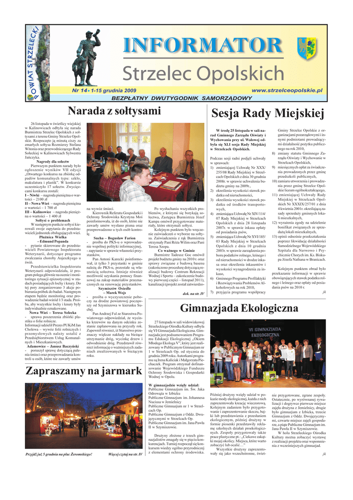 Narada z so³tysami 26 listopada w wietlicy wiejskiej w Kalinowicach odby³a siê narada Burmistrza Strzelec Opolskich z so³tysami z terenu Gminy Strzelce Opolskie. Rozpoczêto j¹ minut¹ ciszy za zmar³ych so³tysa Rozmierzy Stefana Witonia oraz przewodnicz¹cego Rady So³eckiej w Kalinowicach Sylwestra Jañczyka. Nagrody dla so³ectw Pierwszym punktem narady by³o og³oszenie wyników VII edycji Otwartego konkursu na zbiórkê odpadów komunalnych typu: szk³o, makulatura i plastik. W konkursie uczestniczy³o 17 so³ectw. Zwyciêzcami konkursu zostali: I Niwki nagroda pieniê¿na o wartoci 2100 z³ II Nowa Wie nagroda pieniê¿na o wartoci 1 700 z³ III Kalinowice nagroda pieniê¿na o wartoci 1 400 z³ So³tysi o problemach W nastêpnym punkcie so³tysi kierowali swoje zapytania do przedstawicieli jednostek obs³uguj¹cych wie. P³u¿nica Wielka Edmund Popanda - pytanie skierowane do przedstawicieli Powiatowego Inspektoratu Weterynarii, dotycz¹ce programu zwalczania choroby Aujeszkyego u wiñ. Przedstawicielka Inspektoratu Weterynarii odpowiedzia³a, i¿ program polega g³ównie na ocenie i monitoringu sytuacji epizootycznej w stadach posiadaj¹cych lochy i knury. Do tej pory zorganizowano 3 akcje pobierania próbek do badañ. Nastêpnym etapem bêdzie monitoring oraz prowadzenie badañ wród 1/3 stada. Proba, aby wszystkie lochy i knury by³y indywidualnie oznakowane. Nowa Wie Teresa Solecka - sprawa poszerzenia zbiórki plastiku o folie rolnicze. Informacji udzieli³ Prezes PUKiM Jan Cholewa wywóz folii rolniczych i przemys³owych nale¿y ustaliæ z Przedsiêbiorstwem Us³ug Komunalnych i Mieszkaniowych. Adamowice Janusz Baczyñski - poruszy³ sprawê dotycz¹c¹ palenia mieci oraz przeprowadzania kontroli u osób, które nie zawar³y umów Sesja Rady Miejskiej W rodê 25 listopada w sali narad Gminnego Zarz¹du Owiaty i Wychowania przy ul. Wa³owej odby³a siê XLI sesja Rady Miejskiej w Strzelcach Opolskich. na wywóz mieci. Kierownik Referatu Gospodarki i Ochrony rodowiska Krystyna Mo poinformowa³a, i¿ do osób, które nie zawar³y umów wys³ano pisma oraz przeprowadzono u tych osób kontrolê. Sucha Bogus³aw Farion - proba do PKS-u o wprowadzenie wspólnej polityki informacyjnej, - zapytanie w sprawie w³asnoci przystanków, Pan Antoni Karecki poinformowa³, i¿ tylko 3 przystanki w gminie nale¿¹ do PKS-u, pozosta³e s¹ w³asnoci¹ so³ectwa. Istnieje równie¿ mo¿liwoæ uzyskania pomocy finansowej na zakup materia³ów przeznaczonych na renowacjê przystanków. Szymiszów Osiedle Marek Wojs - proba o wyczyszczenie poboczy na drodze powiatowej pocz¹wszy od Szymiszowa w kierunku Suchej. Pan Andrzej Ful ze Starostwa Powiatowego odpowiedzia³, ¿e wycinka krzewów na danym odcinku zostanie zaplanowana na przysz³y rok. Zapewni³ równie¿, i¿ Starostwo przeznaczy wiêksze nak³ady na bie¿¹ce utrzymanie dróg, wycinkê drzew i odwodnienie dróg. Przedstawi³ równie¿ informacjê o wa¿niejszych zadaniach zrealizowanych w bie¿¹cym roku. Zapraszamy na jarmark Po wys³uchaniu wszystkich problemów, z którymi siê borykaj¹ so³ectwa, Zastêpca Burmistrza Józef Kampa omówi³ przygotowane materia³y, które otrzymali so³tysi. Kolejnym punktem by³o wrêczenie zawiadczeñ o wyborze na so³tysa. Zawiadczenia z r¹k Burmistrza otrzyma³y Pani Ró¿a Wilim oraz Pani Teresa Szopa. Co wa¿nego w Gminie Burmistrz Tadeusz Goc omówi³ projekt bud¿etu gminy na 2010 r. oraz sprawy zwi¹zane z budow¹ basenu (zakoñczono procedurê dotycz¹c¹ realizacji budowy Centrum Rekreacji Wodnej i Sportu zakoñczenie budowy pierwszej czêci listopad 2011), kanalizacji (projekt zosta³ zatwierdzodok. na str. IV Wiêcej czytaj na str. IV Kolejnym punktem obrad by³o przekazanie informacji w sprawie obowi¹zuj¹cych stawek podatku rolnego i lenego oraz op³aty od posiadania psów na 2010 r. jk Gimnazjada Ekologiczna 27 listopada w sali widowiskowej Strzeleckiego Orodka Kultury odby³a siê VI Gimnazjada Ekologiczna. Gimnazjada jest podsumowaniem Programu Edukacji Ekologicznej Okiem M³odego Ekologa V, który jest realizowany w Publicznym Gimnazjum nr 1 w Strzelcach Op. od stycznia do grudnia 2009 roku. Autorkami programu s¹ Irena Kaliciak i Ma³gorzata Piechaczek. Program otrzyma³ dofinansowanie Wojewódzkiego Funduszu Ochrony rodowiska i Gospodarki Wodnej w Opolu. W gimnazjadzie wziê³y udzia³: Publiczne Gimnazjum im. w. Jaka Odrow¹¿a w Izbicku Publiczne Gimnazjum im. Johannesa Nuciusa w Jemielnicy Publiczne Gimnazjum nr 1 w Strzelcach Op. Publiczne Gimnazjum z Oddz. Dwujêzycznymi w Strzelcach Op. Publiczne Gimnazjum im. Jana Paw³a II w Szymiszowie. Przyjd ju¿ 5 grudnia na plac ¯eromskiego! Podczas sesji radni podjêli uchwa³y w sprawach: 1) zmieniaj¹cej Uchwa³ê Nr XXX/ 255/08 Rady Miejskiej w Strzelcach Opolskich z dnia 30 grudnia 2008r. w sprawie uchwalenia bud¿etu gminy na 2009r., 2) okrelenia wysokoci stawek podatku od nieruchomoci, 3) okrelenia wysokoci stawek podatku od rodków transportowych, 4) zmieniaj¹ca Uchwa³ê Nr XIV/114/ 07 Rady Miejskiej w Strzelcach Opolskich z dnia 28 listopada 2007r. w sprawie inkasa op³aty od posiadania psów, 5) zmieniaj¹ca Uchwa³ê Nr XVI/185/ 03 Rady Miejskiej w Strzelcach Opolskich z dnia 10 grudnia 2003r. w sprawie zarz¹dzenia poboru podatków rolnego, lenego i od nieruchomoci w drodze inkasa oraz okrelenia inkasentów i wysokoci wynagrodzenia za inkaso, 6) Gminnego Programu Profilaktyki i Rozwi¹zywania Problemów Alkoholowych na rok 2010, 7) przyjêcia programu wspó³pracy Gminy Strzelce Opolskie z organizacjami pozarz¹dowymi i innymi podmiotami prowadz¹cymi dzia³alnoæ po¿ytku publicznego na rok 2010, 8) zmiany statutu Gminnego Zarz¹du Owiaty i Wychowanie w Strzelcach Opolskich, 9) miesiêcznych op³at za wiadczenia prowadzonych przez gminê przedszkoli publicznych, 10) zamiaru utworzenia i prowadzenia przez gminê Strzelce Opolskie liceum ogólnokszta³c¹cego, 11) zmieniaj¹cej Uchwa³y Rady Miejskiej w Strzelcach 