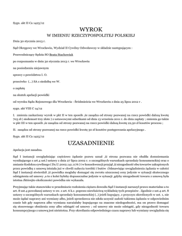 Sygn. akt II Ca 1425/12 WYROK W IMIENIU RZECZYPOSPOLITEJ POLSKIEJ Dnia 30 stycznia 2013 r. Sąd Okręgowy we Wrocławiu, Wydział II Cywilny Odwoławczy w składzie następującym : Przewodniczący Sędzia SO Beata Stachowiak po rozpoznaniu w dniu 30 stycznia 2013 r. we Wrocławiu na posiedzeniu niejawnym sprawy z powództwa I. O. przeciwko (...) SA z siedzibą we W. o zapłatę na skutek apelacji powódki od wyroku Sądu Rejonowego dla Wrocławia - Śródmieścia we Wrocławiu z dnia 25 lipca 2012 r . sygn. akt VIII C 14/12 I. zmienia zaskarżony wyrok w pkt II w ten sposób ,że zasądza od strony pozwanej na rzecz powódki dalszą kwotę 703 zł ( siedemset trzy złote ) z ustawowymi odsetkami od dnia 13 września 2011 r. do dnia zapłaty ; zmienia go także w pkt III w ten sposób ,że zasądza od strony pozwanej na rzecz powódki dalszą kwotę 22,50 zł kosztów procesu ; II. zasądza od strony pozwanej na rzecz powódki kwotę 30 zł kosztów postępowania apelacyjnego . Sygn. akt II Ca 1425/12 UZASADNIENIE Apelacja jest zasadna. Sąd I instancji uwzględniając częściowo żądanie pozwu uznał ,iż strona pozwana nie obaliła domniemania wynikającego z art.4 ust.l ustawy z dnia 27 lipca 2002 r. o szczególnych warunkach sprzedaży konsumenckiej oraz o zmianie Kodeksu cywilnego ( Dz.U.2002.141.1176 ) i w konsekwencji przyjął ,iż niezgodność obu towarów zakupionych przez powódkę z umową istniała już w chwili nabycia torebki i butów .Odmawiając uwzględnienia żądania w całości Sąd I instancji stwierdził ,iż powódka mogłaby domagać się zwrotu uiszczonej ceny jedynie w sytuacji skutecznego odstąpienia od umowy ,a to z kolei byłoby dopuszczalne jedynie w sytuacji ,gdyby niezgodność towaru z umową była istotna Jktórejto okoliczności powódka nie wykazała. Przyjmując takie stanowisko w przedmiocie rozłożenia ciężaru dowodu Sąd I instancji naruszył prawo materialne a to art. 8 ust.4 powołanej ustawy w zw. z art. 6 k.c. poprzez niewłaściwą wykładnię tych przepisów . Zgodnie z ust.4 art. 8 ustawy o szczególnych warunkach sprzedaży konsumenckiej (..) jeżeli kupujący, z przyczyn określonych w ust. 1, nie może żądać naprawy ani wymiany albo, jeżeli sprzedawca nie zdoła uczynić zadość takiemu żądaniu w odpowiednim czasie lub gdy naprawa albo wymiana narażałaby kupującego na znaczne niedogodności, ma on prawo domagać się stosownego obniżenia ceny albo odstąpić od umowy ; od umowy nie może odstąpić, gdy niezgodność towaru konsumpcyjnego z umową jest nieistotna. Przy określaniu odpowiedniego czasu naprawy lub wymiany uwzględnia się rodzaj towaru i cel jego nabycia . W cytowanym uregulowaniu przyjęto ,iż kupujący nie może od umowy odstąpić, jeżeli niezgodność towaru konsumpcyjnego z umową jest nieistotna .Literalna wykładnia art.8 ust.4 ustawy wskazuje ,to sprzedawca wywodzi skutki prawne z faktu , że niezgodność towaru z umową jest nieistotna ,a zatem to na stronie pozwanej spoczywał obowiązek wykazania ,iż kupującemu nie przysługuje prawo odstąpienia od umowy ,bowiem niezgodność towaru z umową jest nieistotna (art.6 k.c.). Z niekwestionowanych ustaleń Sądu Rejonowego wynika ,iż strona pozwana odmówiła wymiany obuwia lub zwrotu ceny, a uwzględniła reklamację częściowo dokonując naprawy wad obuwia .Natomiast strona pozwana odmówiła wymiany torebki ,a naprawa okazała się niemożliwa .Zatem w tym zakresie powódka uzyskała możliwość żądania obniżenia ceny lub odstąpienia od umowy .Powódka skorzystała z tego drugiego uprawnienia ,a strona pozwana nie wykazała ,iż niezgodność towaru z umową jest nieistotna Jak słusznie zauważył to Sąd I instancji nie była w tym zakresie wystarczająca opinia rzeczoznawcy z dnia 13.06.2011 r. mając jedynie walor dokumentu prywatnego .Z dokumentu tego wynika jedynie ,iż sprzedawca zarzucał ,iż w dacie sprzedaży nie zachodziła niezgodność tego towaru z umową ,a odpowiedzialność za utratę zapięcia ponosi powódka .Skoro Sąd Rejonowy uznał ,iż strona pozwana nie obaliła domniemania wynikającego z art.4 ustawy o sprzedaży konsumenckiej to w niniejszym procesie sprzedawca powinien był wykazać ,iż brak zapięcia torebki nie jest wadą istotną .Na tę okoliczność nie został przeprowadzony żaden dowód ,a strona pozwana nie zaprzeczyła twierdzeniom powódki ,iż brak zapięcia uniemożliwia normalne użytkowanie torebki ,a tym samym okoliczność tę uznać należało za przyznaną (art.230 k.p.c.) .Wobec powyższego powódka skutecznie odstąpiła od umowy i jej roszczenie o zwrot ceny w całości było zasadne (art.494 k.c). Rozważania dotyczące rozłożenia ciężaru dowodu odnieść należy także do ujawnionych wad obuwia .W szczególności nie ma podstaw do twierdzenia ,iż występowanie różnic w fakturze skóry i załamania skóry wpływają jedynie na walor estetyczny i tym samym -skoro nie wpływają na użyteczność obuwia czy komfort chodzeniato niezgodność towaru z umową jest nieistotna . Wskazać należy ,iż zgodnie z utrwalonym orzecznictwem SN oraz poglądami doktryny wypracowanymi na gruncie rękojmi przy dokonywaniu oceny czy zachodzi istotna niezgodność towaru konsumpcyjnego z umową należy brać pod uwagę nie tylko funkcjonalność i użyteczność towaru, lecz także walory estetyczne w kontekście uzasadnionych oczekiwań konsumenta .O istotności lub nieistotności wady powinien decydować punkt widzenia kupującego ,a zatem jego subiektywna ocena niezgodności z umową, oczywiście do granic nadużycia prawa . Słusznie podnosi powódka ,iż z uwagi na rodzaj rodzaju obuwia przez nią zakupionego jego walory estetyczne mają znacznie równie istotne jak wygoda w użytkowaniu .Taki rodzaj butów, jakie zakupiła powódkę jest towarem eleganckim; z reguły tego rodzaju obuwie przeznaczone jest do ^korzystania na szczególne okazje ,a nie do użytku codziennego .W związku z ty