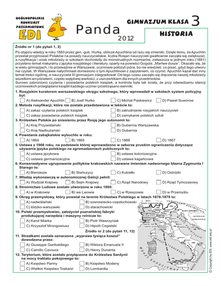 Panda gimnazjum klasa 2012 3 HISTORIA ród³o nr 1 (do pytañ 1, 2) Po objêciu w³adzy w roku 1883 przez gen.-gub. Hurkê, oblicze Apuchtina od razu siê zmieni³o. Dziêki temu, ¿e Apuchtin przesta³ przyjmowaæ Polaków na posady nauczycielskie, liczba Rosjan nauczycieli gwa³townie zaczê³a siê zwiêkszaæ, a rusyfikacja i ucisk m³odzie¿y w szko³ach dochodzi³y do monstrualnych rozmiarów, zw³aszcza w jednym roku (1881) przys³ano temat maturalny z jêzyka rosyjskiego i literatury, oparty na powieœci Gogola: „Martwe dusze”. Okaza³o siê, ¿e w wielu gimnazjach, i to przewa¿nie w Warszawie, uczniowie po³o¿yli pióra, bo nie wiedzieli, co pisaæ, gdy¿ tego utworu nie czytali. W Warszawie natychmiast doniesiono o tym Apuchtinowi z zapytaniem, co czyniæ. Apuchtin kaza³ daæ inny temat treœci ogólnej, a nauczyciela III gimnazjum zdegradowa³. Od tego czasu zaczê³o siê drêczenie naszej m³odzie¿y wszelkimi arcydzie³ami, czêsto w¹tpliwej wartoœci, z uszczerbkiem dla innych przedmiotów. Surowo zabroniono czytania i posiadania polskich ksi¹¿ek, a kontrola by³a tak œcis³a, ¿e przy odwiedzaniu stancji uczniowskich przegl¹dano ksi¹¿ki ka¿dego ucznia i przetrz¹sano sienniki. 1. Rosyjskim kuratorem warszawskiego okrêgu szkolnego, który wprowadzi³ w szko³ach system policyjny by³: A) Aleksander Apuchtin B) Josif Hurko C) Micha³ Paskiewicz 2. Metoda rusyfikacji, która nie zosta³a przedstawiona w tekœcie to: A) zakaz czytania polskich ksi¹¿ek D) Pawe³ Suworow B) zatrudnianie rosyjskich nauczycieli C) zakaz posiadania polskich ksi¹¿ek D) zamykanie polskich szkó³ 3. Królestwo Polskie po zniesieniu przez Rosjê jego autonomii to: A) Kraj Przywiœlañski B) Gubernia Warszawska C) Kraj Nadbu¿añski 4. Powstanie zabajkalskie wybuch³o w roku: D) Gubernia A) 1864 B) 1865 C) 1866 D) 1867 5. Ustawa z 1908 roku, na podstawie której wprowadzono w zaborze pruskim ograniczenia dotycz¹ce u¿ywania jêzyka polskiego na zgromadzeniach publicznych to: A) ustawa jêzykowa B) ustawa kolonizacyjna C) ustawa germanizacyjna D) ustawa kagañcowa 6. Konserwatywne ugrupowanie polityków krakowskich nazwane imieniem nadwornego b³azna Zygmunta I Starego to: A) Bieniasze B) Stañczycy 7. W³adzê wykonawcz¹ w autonomicznej Galicji pe³ni³: C) Kukie³ki D) Ostró¿ki A) Wydzia³ Krajowy B) Sejm Krajowy 8. Stronnictwo Ludowe zosta³o utworzone w roku 1895: C) Rz¹d Narodowy D) Rz¹d Tymczasowy A) w Krakowie B) we Lwowie C) w Rzeszowie D) w Przemyœlu 9. Okrêg przemys³owy, który powsta³ na terenie Królestwa Polskiego w latach 1878-1879 to: A) nadwiœlañski B) sosnowiecko-czêstochowski C) ³ódzko-warszawki D) starachowicki 10. Polski przemys³owiec, za³o¿yciel poznañskiej fabryki produkuj¹cej narzêdzia i maszyny rolnicze to: A) Karol Miarka B) Piotr Wawrzyniak ród³o nr 2 (do pytañ 11, 12) 11. Strza³kami zosta³a oznaczona „wyprawa tysi¹ca koszul” dowodzona przez: A) Giuseppe Garibaldiego B) Wiktora Emanuela II C) Camillo Cavoura D) Henry Dunanta 12. Terytorium, które zosta³o przy³¹czone do Królestwa Sardynii na mocy traktatu pokojowego to: A) Ksiêstwo Parmy B) Ksiêstwo Modeny C) Wielkie Ksiêstwo Toskanii D) Lombardia Copyright by EDI, www.edi.edu.pl D) Hipolit Cegielski C C) Krzysztof Mrongowiusz 13. W bitwach pod Magent¹ i Solferino klêskê ponios³a armia: A) francuska B) austriacka 14. Pierwsz¹ stolic¹ Królestwa W³och by³: C) Piemontu D) pruska A) Mediolan B) Turyn 15. Papie¿, który og³osi³ siê „wiêŸniem Watykanu” to: C) Rzym D) Benewent A) Jan XIX B) Pius XI C) Jan XX 16. Polityk, który „uczyni³ Niemcy wielkimi, ale Niemców ma³ymi” to: A) Otto von Bismarck D) Pius IX B) Helmut von Moltke C) Karol I Habsburg 17. Wilhelm I zosta³ królem Prus w roku: D) Fryderyk III Hohenzollern A) 1859 B) 1860 18. Monarchia Austro-Wêgierska powsta³a w roku: C) 1861 D) 1862 A) 1867 B) 1869 C) 1870 19. Pretekstem do wojny prusko-francuskiej by³ spór o tron: D) 1872 A) w³oski B) hiszpañski C) grecki 20. Proklamacja Cesarstwa Niemieckiego odby³a siê w roku 1871 w: D) austriacki A) Wiedniu B) Wersalu C) Frankfurcie 21. Pañstwo, którego w roku 1907 nie obejmowa³o Trójporozumienie to: D) Berlinie A) Rosja B) Francja C) Wielka Brytania D) W³ochy 22. Jedn¹ z poœrednich przyczyn I wojny œwiatowej by³ konflikt francusko-niemiecki o: A) Maroko B) Egipt C) Indie D) Afrykê Po³udniow¹ ród³o nr 3 (do pytañ 23, 24) 23. Karykatura przedstawia kolonializm: A) niemiecki B) brytyjski C) austriacki 24. Postaæ historyczna, dla której kula ziemska okaza³a siê zbyt twarda to: A) car Aleksander II D) w³oski B) cesarz Wilhelm II C) car Miko³aj II D) cesarz Franciszek Józef 25. Do zwyciêstwa Francuzów w bitwie nad Marn¹ w 1914 roku przyczyni³y siê: D) Brusi³owa A) 11 XI 1918 roku 28. I wojna œwiatowa trwa³a: D) 3 XI 1918 roku B) 3 X 1918 roku C) 29 IX 1918 roku A) 3 i pó³ roku B) 4 lata i 3 miesi¹ce C) 4 lata i 9 miesiêcy 29. Wed³ug kalendarza juliañskiego carat w Rosji zosta³ obalony w: A) grudniu 1917 roku B) listopadzie 1917 roku C) lutym 1917 roku D) paŸdzierniku 1917 roku 30. Przewodnicz¹cym Rady Komisarzy Ludowych w roku 1917 zosta³: A) Feliks Dzier¿yñski B) W³odzimierz Ilicz Lenin C) Lew Trocki D) Józef Stalin D) 5 lat C A) Samsonowa B) Kiereñskiego C) Rennenkampfa 27. Niemcy podpisa³y akt zawieszenia broni w lesie Compiegne: Copyright by EDI, www.edi.edu.pl A) czo³gi B) gazy bojowe C) taksówki D) samoloty 26. Najwiêksz¹ operacjê zaczepn¹ wojsk rosyjskich przeprowadzon¹ latem 1916 roku nazwano ofensyw¹:
