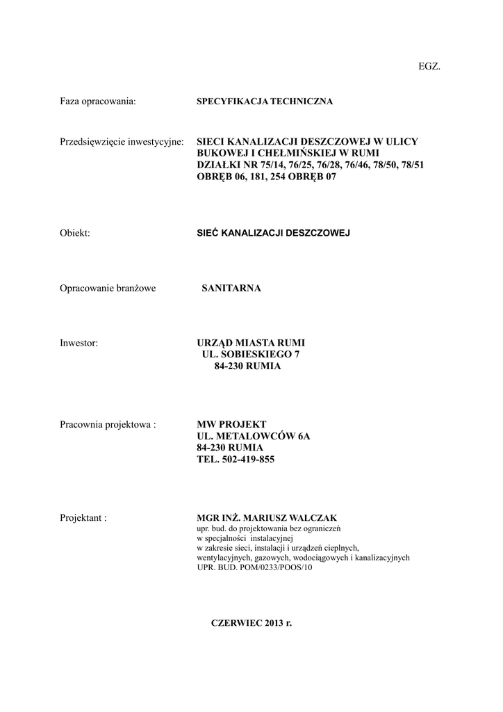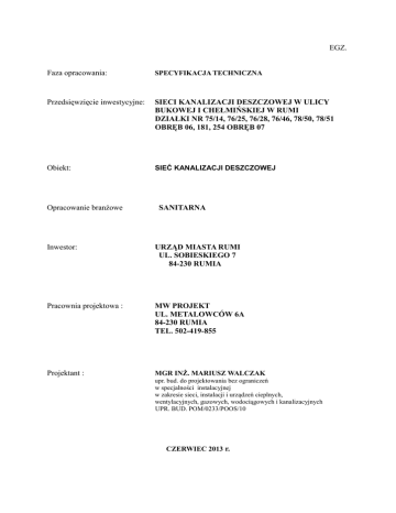 EGZ. Faza opracowania: SPECYFIKACJA TECHNICZNA Przedsięwzięcie inwestycyjne: SIECI KANALIZACJI DESZCZOWEJ W ULICY BUKOWEJ I CHEŁMIŃSKIEJ W RUMI DZIAŁKI NR 75/14, 76/25, 76/28, 76/46, 78/50, 78/51 OBRĘB 06, 181, 254 OBRĘB 07 Obiekt: SIEĆ KANALIZACJI DESZCZOWEJ Opracowanie branżowe SANITARNA Inwestor: URZĄD MIASTA RUMI UL. SOBIESKIEGO 7 84-230 RUMIA Pracownia projektowa : MW PROJEKT UL. METALOWCÓW 6A 84-230 RUMIA TEL. 502-419-855 Projektant : MGR INŻ. MARIUSZ WALCZAK upr. bud. do projektowania bez ograniczeń w specjalności instalacyjnej w zakresie sieci, instalacji i urządzeń cieplnych, wentylacyjnych, gazowych, wodociągowych i kanalizacyjnych UPR. BUD. POM/0233/POOS/10 CZERWIEC 2013 r. SIECI KANALIZACJI DESZCZOWEJ W ULICY BUKOWEJ CHEŁMIŃSKIEJ W RUMI DZIAŁKI NR 75/14, 76/25, 76/28, 76/46 OBRĘB 06, 181, 254 OBRĘB 08 SZCZEGÓŁOWA SPECYFIKACJA TECHNICZNA WYKONANIA I ODBIORU ROBÓT SST - SIEĆ KANALIZACJI DESZCZOWEJ Kod CPV: 45111200-0 45232400-6 45232410-9 45232130-2 Roboty w zakresie przygotowania terenu pod budowę i roboty ziemne Roboty budowlane w zakresie kanałów ściekowych Roboty w zakresie kanalizacji ściekowej Roboty budowlane w zakresie rurociągów do odprowadzania wody burzowej Opracował: inż. Mariusz Walczak sierpień 2013 r. 2 SZCZEGÓŁOWA SPECYFIKACJA TECHNICZNA SIECI KANALIZACJI DESZCZOWEJ 1. WSTĘP 1.1. PRZEDMIOT SST Przedmiotem niniejszej Szczegółowej Specyfikacji Technicznej /SST/ są wymagania dotyczące wykonania i odbioru robót obejmujących sieci kanalizacji deszczowej W ulicy Bukowej i Chełmińskiej w Rumi, dz. nr 75/14, 76/25, 76/28, 76/46 obręb 06, 181, 254 obręb 08. 1.2. ZAKRES STOSOWANIA SST Szczegółowa Specyfikacja Techniczna jest stosowana jako dokument przetargowy i kontraktowy przy zlecaniu i realizacji robót wymienionych w punkcie 1.1. 1.3. ZAKRES ROBÓT OBJĘTYCH SST Roboty, których dotyczy Specyfikacja, obejmuje wszystkie czynności umożliwiające i mające na celu budowę sieci kanalizacji deszczowej zgodnie z p. 1.1. obejmują następujący zakres robót: − budowę sieci kanalizacji deszczowej w ulicy Bukowej od włączenia do projektowanej sieci kanalizacji deszczowej w ulicy Kazimierskiej /studnia D27/ do studni D50 za skrzyżowaniem z ulicą . − budowę sieci kanalizacji deszczowej w ulicy Chełmińskiej od włączenia do projektowanej sieci kanalizacji deszczowej w ulicy Bukowej /studnia D44/ do studni D45 za skrzyżowaniem z ulicą Topolową. − włączenie do sieci wpustów ulicznych w ulicy zlokalizowanych zgodnie z projektem układu drogowego 1.4. OKREŚLENIA PODSTAWOWE Sieć kanalizacyjna - układ połączonych przewodów kanalizacyjnych i obiektów inżynierskich, znajdujących się poza budynkami od pierwszej studzienki kanalizacyjnej licząc od strony budynku do oczyszczalni ścieków lub wylotów kanałów deszczowych albo burzowych do odbiorników Sieć kanalizacyjna deszczowa - sieć kanalizacyjna przeznaczona do odprowadzania ścieków opadowych Dziennik budowy - opatrzony pieczęcią Zamawiającego zeszyt, z ponumerowanymi stronami, służący do notowania wydarzeń zaistniałych w czasie wykonywania zadania budowlanego, rejestrowania dokonywanych odbiorów Robót, przekazywania poleceń i innej korespondencji technicznej pomiędzy Inżynierem, Wykonawcą i Projektantem. Kierownik budowy - osoba wyznaczona przez Wykonawcę, upoważniona do kierowania Robotami i do występowania w jego imieniu w sprawach realizacji Kontraktu. Księga Obmiaru - akceptowany przez Inżyniera zeszyt z ponumerowanymi stronami służący do wpisywania przez wykonawcę obmiaru wykonanych robót w formie wyliczeń, szkiców i ewentualnych dodatkowych załączników, wpisy w księdze obmiaru podlegają potwierdzeniu przez Inżyniera. Przykrycie - osłona ułożona nad kanałem w celu ochrony przed mechanicznym uszkodzeniem od góry, Wskaźnik zagęszczenia gruntu - wielkość charakteryzująca stan zagęszczenia gruntu określona wg wzoru : SPD = Pd/Pds gdzie : Pd - gęstość objętościowa szkieletu zagęszczonego gruntu Mg/m3 Pds - maksymalna gęstość objętościowa szkieletu gruntowego przy wilgotności optymalnej, określona w normalnej próbie Proctora, zgodnie z PN-B-04481 Rysunki - część Dokumentacji Projektowej, która wskazuje lokalizację, charakterystykę i wymiary obiektu będącego przedmiotem Robót. 3 Skrzyżowanie - takie miejsce na trasie sieci kanalizacyjnej, w którym jakakolwiek części rzutu poziomego kanału przecina lub pokrywa jakąkolwiek część rzutu poziomego innej innego urządzenia podziemnego albo naziemnego, np. rurociągu, toru kolejowego, drogi, wody żeglownej lub spławnej, kabli, gazociągów itp., Studzienka kanalizacyjna - studzienka rewizyjna - na kanale nieprzełazowym przeznaczona do kontroli i prawidłowej eksploatacji kanałów. Studzienka przelotowa – studzienka kanalizacyjna zlokalizowana na załamaniach osi kanału na planie, na załamaniach spadku kanału oraz na odcinkach prostych. Studzienka połączeniowa - studzienka kanalizacyjna przeznaczona dołączenia co najmniej dwóch kanałów dopływowych w jeden kanał odpływowy. Studzienka ściekowa uliczna - urządzenie do odbioru ścieków opadowych spływających do kanału z powierzchni terenu. Wylot kanału - element na końcu kanału odprowadzającego ścieki do odbiornika. Rura ochronna - rura o średnicy większej od rury przewodowej, służącą do przenoszenia obciążeń zewnętrznych i do zabezpieczenia kanału przy przejściu pod przeszkodą terenową. Komora robocza - zasadnicza część studzienki przeznaczona do czynności eksploatacyjnych. Wysokość komory roboczej jest to odległość pomiędzy rzędną dolnej powierzchni płyty lub innego elementu przykrycia studzienki a rzędną spocznika lub dna studzienki. Płyta przykrycia studzienki - płyta przykrywająca komorę roboczą. Właz kanałowy - element żeliwny przeznaczony do przykrycia studzienek rewizyjnych umożliwiający dostęp do urządz