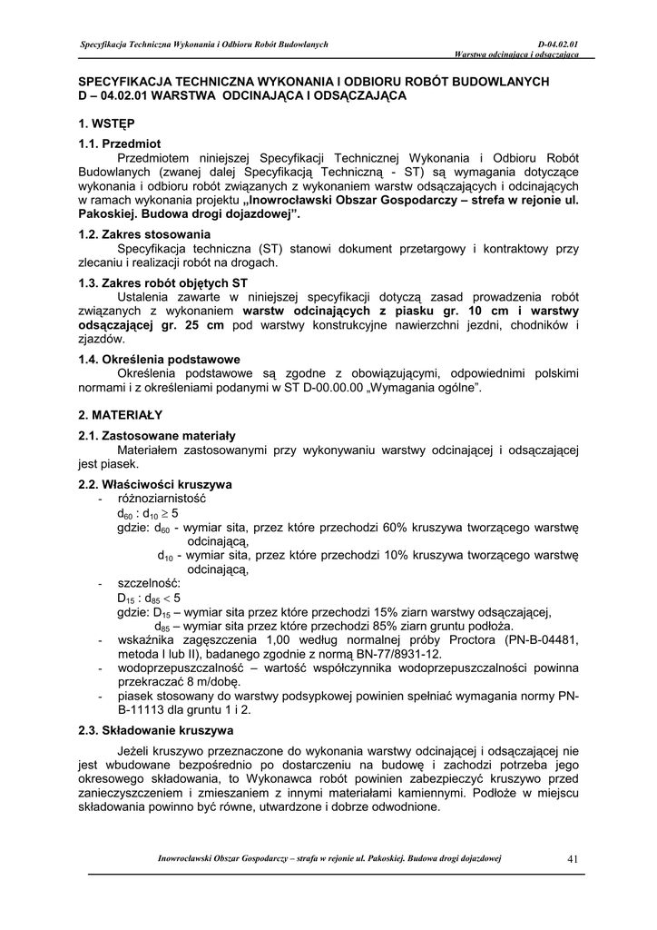 Specyfikacja Techniczna Wykonania i Odbioru Robót Budowlanych D-04.02.01 Warstwa odcinająca i odsączająca SPECYFIKACJA TECHNICZNA WYKONANIA I ODBIORU ROBÓT BUDOWLANYCH D – 04.02.01 WARSTWA ODCINAJĄCA I ODSĄCZAJĄCA 1. WSTĘP 1.1. Przedmiot Przedmiotem niniejszej Specyfikacji Technicznej Wykonania i Odbioru Robót Budowlanych (zwanej dalej Specyfikacją Techniczną - ST) są wymagania dotyczące wykonania i odbioru robót związanych z wykonaniem warstw odsączających i odcinających w ramach wykonania projektu „Inowrocławski Obszar Gospodarczy – strefa w rejonie ul. Pakoskiej. Budowa drogi dojazdowej”. 1.2. Zakres stosowania Specyfikacja techniczna (ST) stanowi dokument przetargowy i kontraktowy przy zlecaniu i realizacji robót na drogach. 1.3. Zakres robót objętych ST Ustalenia zawarte w niniejszej specyfikacji dotyczą zasad prowadzenia robót związanych z wykonaniem warstw odcinających z piasku gr. 10 cm i warstwy odsączającej gr. 25 cm pod warstwy konstrukcyjne nawierzchni jezdni, chodników i zjazdów. 1.4. Określenia podstawowe Określenia podstawowe są zgodne z obowiązującymi, odpowiednimi polskimi normami i z określeniami podanymi w ST D-00.00.00 „Wymagania ogólne”. 2. MATERIAŁY 2.1. Zastosowane materiały Materiałem zastosowanymi przy wykonywaniu warstwy odcinającej i odsączającej jest piasek. 2.2. Właściwości kruszywa - róŜnoziarnistość d60 : d10 ≥ 5 gdzie: d60 - wymiar sita, przez które przechodzi 60% kruszywa tworzącego warstwę odcinającą, d10 - wymiar sita, przez które przechodzi 10% kruszywa tworzącego warstwę odcinającą, - szczelność: D15 : d85 < 5 gdzie: D15 – wymiar sita przez które przechodzi 15% ziarn warstwy odsączającej, d85 – wymiar sita przez które przechodzi 85% ziarn gruntu podłoŜa. - wskaźnika zagęszczenia 1,00 według normalnej próby Proctora (PN-B-04481, metoda I lub II), badanego zgodnie z normą BN-77/8931-12. - wodoprzepuszczalność – wartość współczynnika wodoprzepuszczalności powinna przekraczać 8 m/dobę. - piasek stosowany do warstwy podsypkowej powinien spełniać wymagania normy PNB-11113 dla gruntu 1 i 2. 2.3. Składowanie kruszywa JeŜeli kruszywo przeznaczone do wykonania warstwy odcinającej i odsączającej nie jest wbudowane bezpośrednio po dostarczeniu na budowę i zachodzi potrzeba jego okresowego składowania, to Wykonawca robót powinien zabezpieczyć kruszywo przed zanieczyszczeniem i zmieszaniem z innymi materiałami kamiennymi. PodłoŜe w miejscu składowania powinno być równe, utwardzone i dobrze odwodnione. Inowrocławski Obszar Gospodarczy – strafa w rejonie ul. Pakoskiej. Budowa drogi dojazdowej 41 Specyfikacja Techniczna Wykonania i Odbioru Robót Budowlanych D-04.02.01 Warstwa odcinająca i odsączająca 3. SPRZĘT Wykonawca przystępujący do wykonania warstwy odcinającej i odsączającej powinien wykazać się moŜliwością korzystania z następującego sprzętu: - równiarek, - walców, - płyt wibracyjnych lub ubijaków mechanicznych. 4. TRANSPORT Kruszywa moŜna przewozić dowolnymi środkami transportu w warunkach zabezpieczających je przed zanieczyszczeniem, zmieszaniem z innymi materiałami, nadmiernym wysuszeniem i zawilgoceniem. 5. WYKONANIE ROBÓT 5.1. Zasady ogólne Wykonanie warstwy odcinającej i odsączającej naleŜy poprzedzić wykonaniem profilowania dna koryta oraz badaniem jego zagęszczenia. Profilowanie podłoŜa powinno być wykonane w korzystnych warunkach atmosferycznych i skoordynowane z kompleksowym wykonaniem wszystkich elementów nawierzchni. 5.2. Rozkładanie kruszywa Kruszywo powinno być rozkładane w warstwie o grubości wynikającej z konieczności lokalnego wyrównania z zachowaniem wymaganych spadków i rzędnych wysokościowych. Grubość rozłoŜonej warstwy luźnego kruszywa powinna być taka, aby po jej zagęszczeniu osiągnięto grubość projektowaną. W miejscach, w których widoczna jest segregacja kruszywa naleŜy przed zagęszczeniem wymienić kruszywo na materiał o odpowiednich właściwościach. 5.3. Zagęszczenie kruszywa Natychmiast po końcowym wyprofilowaniu warstwy naleŜy przystąpić do jej zagęszczania. Zagęszczanie nawierzchni o jednostronnym spadku naleŜy rozpoczynać od dolnej krawędzi i przesuwać pasami podłuŜnymi częściowo nakładającymi się, w kierunku jej górnej krawędzi. Nierówności lub zagłębienia powstałe w czasie zagęszczania powinny być wyrównywane na bieŜąco przez spulchnienie warstwy kruszywa i dodanie lub usunięcie materiału, aŜ do otrzymania równej powierzchni. Zagęszczanie naleŜy kontynuować do osiągnięcia wskaźnika zagęszczenia nie mniejszego od 1,0 według normalnej próby Proctora, przeprowadzonej według PN-B-04481. Wilgotność kruszywa podczas zagęszczania powinna być równa wilgotności optymalnej z tolerancją od -20% do +10% jej wartości. W przypadku, gdy wilgotność kruszywa jest wyŜsza od wilgotności optymalnej, kruszywo naleŜy osuszyć przez mieszanie i napowietrzanie. W przypadku, gdy wilgotność kruszywa jest niŜsza od wilgotności optymalnej, kruszywo naleŜy zwilŜyć określoną ilością wody i równomiernie wymieszać. 5.4. Utrzymanie warstwy odcinającej Warstwa odcinająca i odsączająca po wykonaniu, a przed ułoŜeniem następnej warstwy powinny być utrzymywane w dobrym stanie. Nie dopuszcza się ruchu budowlanego po wykonanej warstwie. W przypadku warstwy z kruszywa dopuszcza się ruch pojazdów koniecznych dla wykonania wyŜej leŜącej warstwy nawierzchni. Koszt napraw wynikłych z niewłaściwego utrzymania warstwy obciąŜa Wykonawcę robót. 42 Inowrocławski Obszar Gospodarczy – strafa w rejonie ul. Pakoskiej. Budowa drogi dojazdowej Specyfikacja Techniczna Wykonania i Odbioru Robót Budowlanych D-04.02.01 Warstwa odcinająca i odsączająca 6. KONTROLA JAKOŚCI ROBÓT 6.1. Ogólne zasady kontroli W czasie wykonywania robót Wykonawca powinien prowadzić systematycznie badania kontrolne i dostar