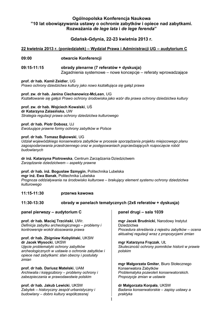 Ogólnopolska Konferencja Naukowa ”10 lat obowiązywania ustawy o ochronie zabytków i opiece nad zabytkami. Rozważania de lege lata i de lege ferenda” Gdańsk-Gdynia, 22-23 kwietnia 2013 r. 22 kwietnia 2013 r. (poniedziałek) – Wydział Prawa i Administracji UG – audytorium C 09:00 otwarcie Konferencji 09:15-11:15 obrady plenarne (7 referatów + dyskusja) Zagadnienia systemowe – nowe koncepcje – referaty wprowadzające prof. dr hab. Kamil Zeidler, UG Prawo ochrony dziedzictwa kultury jako nowo kształtująca się gałąź prawa prof. zw. dr hab. Janina Ciechanowicz-McLean, UG Kształtowanie się gałęzi Prawo ochrony środowiska jako wzór dla prawa ochrony dziedzictwa kultury prof. zw. dr hab. Wojciech Kowalski, UŚ dr Katarzyna Zalasińska, UW Strategia regulacji prawa ochrony dziedzictwa kulturowego prof. dr hab. Piotr Dobosz, UJ Ewoluujące prawne formy ochrony zabytków w Polsce prof. dr hab. Tomasz Bąkowski, UG Udział wojewódzkiego konserwatora zabytków w procesie sporządzania projektu miejscowego planu zagospodarowania przestrzennego oraz w postępowaniach poprzedzających rozpoczęcie robót budowlanych dr inż. Katarzyna Piotrowska, Centrum Zarządzania Dziedzictwem Zarządzanie dziedzictwem – aspekty prawne prof. dr hab. inż. Bogusław Szmygin, Politechnika Lubelska mgr inż. Ewa Banak, Politechnika Lubelska Prognoza oddziaływania na środowisko kulturowe – brakujący element systemu ochrony dziedzictwa kulturowego 11:15-11:30 przerwa kawowa 11:30-13:30 obrady w panelach tematycznych (2x6 referatów + dyskusja) panel pierwszy – audytorium C panel drugi – sala 1039 prof. dr hab. Maciej Trzciński, UWr. Definicja zabytku archeologicznego – problemy i kontrowersje wokół stosowania prawa mgr Jacek Brudnicki, Narodowy Instytut Dziedzictwa Procedura skreślenia z rejestru zabytków – ocena aktualnej regulacji wraz z propozycjami zmian prof. dr hab. Zbigniew Kobyliński, UKSW dr Jacek Wysocki, UKSW Ujęcie problematyki ochrony zabytków archeologicznych w ustawie o ochronie zabytków i opiece nad zabytkami: stan obecny i postulaty zmian mgr Katarzyna Frączak, UŁ Skuteczność ochrony pomników historii w prawie polskim prof. dr hab. Dariusz Matelski, UAM Archiwalia i księgozbiory – problemy ochrony i zabezpieczania w prawodawstwie polskim mgr Małgorzata Gmiter, Biuro Stołecznego Konserwatora Zabytków Problematyka pozwoleń konserwatorskich. Propozycje zmian w ustawie prof. dr hab. Jakub Lewicki, UKSW Zabytek – historyczny zespół urbanistyczny i budowlany – dobro kultury współczesnej dr Małgorzata Korpała, UKSW Badania konserwatorskie – zapisy ustawy a praktyka 1 mgr Katarzyna Płażyńska, UG Świadectwo minionej epoki czy dobra kultury współczesnej? Problemy ochrony prawnej architektury nowoczesnej w Polsce mgr Ewelina Pabisiak, Biuro Stołecznego Konserwatora Zabytków Nadzór konserwatorski – propozycje zmian w ustawie Sonia Jaszczyńska, UW Otoczenie zabytku mgr Krzysztof Kaszubowski, UW Decyzja wojewódzkiego konserwatora zabytków o wstrzymaniu prac konserwatorskich 13:30-14:30 przerwa obiadowa 14:30-16:30 obrady w panelach tematycznych (2x6 referatów + dyskusja) panel pierwszy – audytorium C panel drugi – sala 1039 dr Iwona Gredka, Wyższa Szkoła Humanitas w Sosnowcu Narzędzia prawnej ochrony zabytków w świetle art. 95 ustawy o ochronie zabytków i opiece nad zabytkami dr Alicja Jagielska-Burduk, Uniwersytet Kazimierza Wielkiego w Bydgoszczy Koncepcja świadomego dysponenta zabytków w ustawie o ochronie zabytków i opiece nad zabytkami prof. dr hab. Anna Gerecka-Żołyńska, UAM Konserwator zabytków jako oskarżyciel posiłkowy w procesie karnym dr Beata Ruszkiewicz, UG Wpływ decyzji konserwatora zabytków na wykonywanie prawa własności zabytków nieruchomych ks. prof. dr hab. Sławomir Fundowicz, KUL Zasady współpracy administracji publicznej ze związkami wyznaniowymi w zakresie ochrony zabytków dr Monika Drela, UWr. Decyzja o czasowym zajęciu zabytku nieruchomego dr inż. Robert Hirsch, PG, Miejski Konserwator Zabytków w Gdyni Wykorzystane szanse i potencjalne zagrożenia czyli udział samorządów lokalnych w ochronie i konserwacji zabytków. Wybrane zagadnienia mgr Piotr Łada, adwokat w Warszawie mgr Barbara Brózda, Warszawa Znalezienie zabytku - problematyka stosunków właścicielskich na gruncie ustawy o ochronie zabytków i opiece nad zabytkami oraz kodeksu cywilnego dr Przemysław Panfil, UG Finansowanie opieki nad zabytkami przez samorządy – wybrane problemy praktyczne dr Tomasz Sienkiewicz, KUL Pozwolenia wydawane na podstawie art. 52-55 ustawy o ochronie zabytków i opiece nad zabytkami Aleksandra Brodowska, UW Analiza praktycznych aspektów funkcjonowania instytucji społecznego opiekuna zabytków w kontekście kompetencji nadanych ustawą o ochronie zabytków i opiece nad zabytkami prof. dr hab. Piotr Stec, Uniwersytet Opolski Postępowanie cywilne w sprawie zwrotu dobra kultury wywiezionego nielegalnie z terytorium państwa członkowskiego UE 17:00-18:00 uroczyste zakończenie Programu „Ochrona dziedzictwa kulturowego w Polsce” 19:00 wieczorne przyjęcie dla zaproszonych gości (Muzeum Marynarki Wojennej w Gdyni) 2 23 kwietnia 2013 r. (wtorek) – Muzeum Marynarki Wojennej w Gdyni – sala konferencyjna 09:00-10:00 zwiedzanie ORP „Błyskawica” – spotkanie przy okręcie 10:00 laudacja książki Muzea publiczne. Studium administracyjnoprawne autorstwa dr Katarzyny Zalasińskiej 10:30-12:30 obrady plenarne (7 referatów + dyskusja) prof. dr hab. Jerzy Menkes, SGH Krajowy program ochrony zabytków i opieki nad zabytkami oraz ochrona zabytków na wypadek konfliktu zbrojnego i sytuacji kryzysowych dr Paweł Kowalski, SWPS w Warszawie Inkorporacja prawa międzynarodowego w zakresie ochrony dóbr kultury na wypadek konfliktu zbrojnego dr Anna Kociołek-Pęksa, Szkoła Główna Służby Pożarniczej w Warszawie Prawne aspekty przeciwpożarowej i kryzysowej ochrony zabytków mgr 
