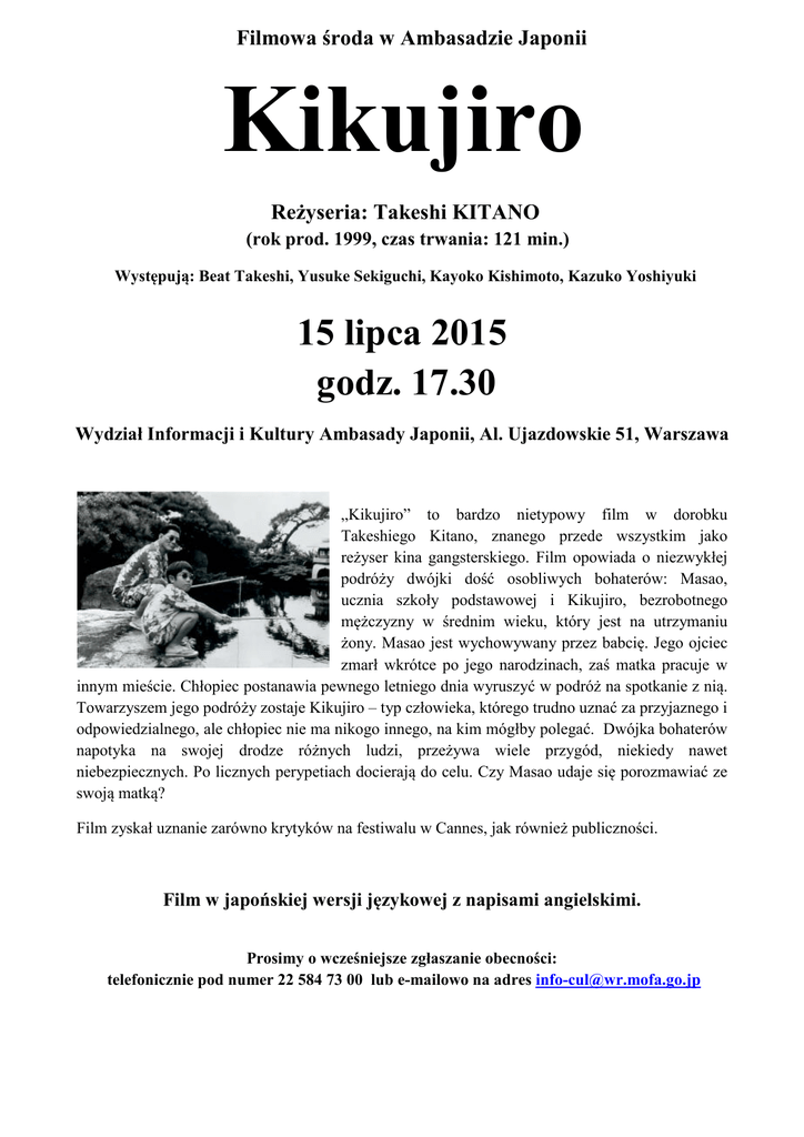 Filmowa środa w Ambasadzie Japonii Kikujiro Reżyseria: Takeshi KITANO (rok prod. 1999, czas trwania: 121 min.) Występują: Beat Takeshi, Yusuke Sekiguchi, Kayoko Kishimoto, Kazuko Yoshiyuki 15 lipca 2015 godz. 17.30 Wydział Informacji i Kultury Ambasady Japonii, Al. Ujazdowskie 51, Warszawa „Kikujiro” to bardzo nietypowy film w dorobku Takeshiego Kitano, znanego przede wszystkim jako reżyser kina gangsterskiego. Film opowiada o niezwykłej podróży dwójki dość osobliwych bohaterów: Masao, ucznia szkoły podstawowej i Kikujiro, bezrobotnego mężczyzny w średnim wieku, który jest na utrzymaniu żony. Masao jest wychowywany przez babcię. Jego ojciec zmarł wkrótce po jego narodzinach, zaś matka pracuje w innym mieście. Chłopiec postanawia pewnego letniego dnia wyruszyć w podróż na spotkanie z nią. Towarzyszem jego podróży zostaje Kikujiro – typ człowieka, którego trudno uznać za przyjaznego i odpowiedzialnego, ale chłopiec nie ma nikogo innego, na kim mógłby polegać. Dwójka bohaterów napotyka na swojej drodze różnych ludzi, przeżywa wiele przygód, niekiedy nawet niebezpiecznych. Po licznych perypetiach docierają do celu. Czy Masao udaje się porozmawiać ze swoją matką? Film zyskał uznanie zarówno krytyków na festiwalu w Cannes, jak również publiczności. Film w japońskiej wersji językowej z napisami angielskimi. Prosimy o wcześniejsze zgłaszanie obecności: telefonicznie pod numer 22 584 73 00 lub e-mailowo na adres [email protected]