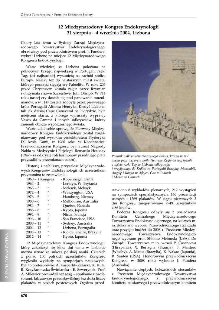 Z życia Towarzystwa / From the Endocrine Society 12 Międzynarodowy Kongres Endokrynologii 31 sierpnia – 4 września 2004, Lizbona Cztery lata temu w Sydney Zarząd Międzynarodowego Towarzystwa Endokrynologicznego, obradujący pod przewodnictwem prof. J. Fundera, wybrał Lizbonę na miejsce 12 Międzynarodowego Kongresu Endokrynologii. Z ŻYCIA TOWARZYSTWA Warto wiedzieć, że Lizbona położona na północnym brzegu największej w Portugalii rzeki Tag, jest najbardziej wysuniętą na zachód stolicą Europy. Należy też do najstarszych miast świata, którego początki sięgają ery Paleolitu. W roku 205 przed Chrystusem została zajęta przez Rzymian i otrzymała nazwę Szczęśliwej Julii Olisipo. W 714 roku naszej ery dostała się pod panowanie muzułmanów, a w 1147 została zdobyta przez pierwszego króla Portugalii Alfonsa Henryka. Kiedyś Lizbona, tak jak dzisiaj Cape Canaveral na Florydzie, była miejscem startu, z którego wyruszały wyprawy Vasco da Gamma i innych odkrywców, którzy zmienili oblicze współczesnego świata. Warto zdać sobie sprawę, że Pierwszy Międzynarodowy Kongres Endokrynologii został zorganizowany pod wysokim protektoratem Fryderyka IX, króla Danii, w 1960 roku w Kopenhadze. Przewodniczącym Kongresu był laureat Nagrody Nobla w Medycynie i Fizjologii Bernardo Houssay (1947 - za odkrycie roli hormonów przedniego płata przysadki w przemianach cukru). Historię i najbliższą przyszłość Międzynarodowych Kongresów Endokrynologii ich uczestnikom przypomina to zestawienie: 1960 – 1 Kongres - Kopenhaga, Dania 1964 – 2 ” - Londyn, W. Brytania 1968 – 3 ” - Meksyk, Meksyk 1972 – 4 ” - Waszyngton, USA 1976 – 5 ” - Hamburg, Niemcy 1980 – 6 ” - Melbourne, Australia 1984 – 7 ” - Quebec, Kanada 1988 – 8 ” - Kyoto, Japonia 1992 – 9 ” - Nicea, Francja 1996 – 10 ” - San Francisco, USA 2000 – 11 ” - Sydney, Australia 2004 – 12 ” - Lizbona, Portugalia 2008 – 13 ” - Rio de Janeiro, Brazylia 2012 – 14 ” - Kyoto, Japonia 12 Międzynarodowy Kongres Endokrynologii, który zakończył się kilka dni temu w Lizbonie można uznać za sukces polskiej nauki. Czterech z ponad 100 polskich uczestników Kongresu wygłosiło wykłady na sympozjach naukowych. Byli to profesorowie: A. Kasperlik-Załuska, K. Kula, B. Krzyżanowska-Świniarska i E. Sewerynek. Prof. A. Milewicz prowadził też sesję – spotkanie z profesorami. Jak zawsze przedstawiliśmy też dużą liczbę plakatów w sesjach posterowych. Ogółem przed670 Pomnik Odkrywców ówczesnego świata, którzy w XV wieku przy wsparciu króla Henryka Żeglarza wypływali z ujścia rzeki Tag w Lizbonie odkrywając i przyłączając do Królestwa Portugalii Brazylię, Mozambik, Angolę i Kongo w Afryce, Goa w Indiach i Makao w Chinach. stawiono 8 wykładów plenarnych, 212 wystąpień na sympozjach specjalistycznych, 146 prezentacji ustnych i 1369 plakatów. W ciągu pierwszych 3 dni Kongresu zarejestrowano 2949 uczestników z 86 krajów. Podczas Kongresu odbyły się 2 posiedzenia Komitetu Centralnego Międzynarodowego Towarzystwa Endokrynologicznego, na których m. in. dokonano wyboru Przewodniczącego i Zarządu oraz przyjęto budżet do 2008 r. Prezesem Międzynarodowego Towarzystwa Endokrynologicznego wybrano prof. Shlomo Melmeda (USA). Do Zarządu Towarzystwa m.in. weszli P. Casanoeva (Hiszpania), X. Bertagna (Francja), F. Mantero (Włochy), A. Matos (Brazylia), K. Nakao (Japonia), R. Santen (USA). Honorowym przewodniczącym Kongresu w 2008 roku wybrano J. Fundera (Australia). Nawiązanie ciepłych, koleżeńskich stosunków z Prezesem Międzynarodowego Towarzystwa Endokrynologicznego, z przewodniczącym komitetu naukowego i przewodniczącym komitetu Endokrynologia Polska / Polish Journal of Endocrinology 2004; 5 (55) Uroczystość otwarcia 12 Międzynarodowego Kongresu Endokrynologii, Lizbona, 31 sierpnia 2004 r. W pierwszym rzędzie, po środku, przy stole prezydialnym siedzi Prezydent Republiki Portugalii, Jorge Sampaio, Ministrowie Zdrowia, Nauki, Mer Lizbony. W drugim rzędzie, wśród przedstawicieli narodowych towarzystw, Prezes Polskiego Towarzystwa Endokrynologicznego, prof. Stefan Zgliczyński. Z ŻYCIA TOWARZYSTWA Grupa przedstawicieli Polskiego Towarzystwa Endokrynologicznego przed wejściem do Centrum Kongresowego w Lizbonie w dniu 2 września 2004. 671 Z życia Towarzystwa / From the Endocrine Society organizacyjnego następnego, 13 Kongresu Międzynarodowego Towarzystwa Endokrynologicznego w Rio de Janeiro, oraz z innymi przedstawicielami światowej endokrynologii na specjalnym spotkaniu zorganizowanym w ambasadzie brazylijskiej w Lizbonie dnia 2 września 2004 roku, powinno przyczynić się do pogłębienia i zacieśnienia naszej współpracy. Powinno też ułatwić przyjęcie do wygłoszenia na Kongresie w Rio de Janeiro jeszcze większej liczby najlepszych prac przygotowanych przez członków Polskiego Towarzystwa Endokrynologicznego. Natomiast, czy było coś nowego i odkrywczego w endokrynologii na 12 Międzynarodowym Kongresie w Lizbonie napiszą zapewne moi przyjaciele, inni uczestnicy tego sympatycznego spotkania. Prof. Stefan Zgliczyński Prezes Polskiego Towarzystwa Endokrynologicznego Z ŻYCIA TOWARZYSTWA Clube de Fado to miejsce przyjacielskiego spotkania uczestników kongresu, gdzie smutne i nostalgiczne pieśni Fado były najbardziej charakterystycznymi elementami kultury portugalskiej. Po Kongresie niektórzy z jego uczestników pojechali do Sanktuarium w Fatimie. Nazwa tej miejscowości pochodzi od imienia mauretańskiej księżniczki Fatimy, która z miłości do portugalskiego księcia przyjęła chrzest i została jego żoną. 672 Endokrynologia Polska / Polish Journal of Endocrinology 2004; 5 (55) Ogromny sukces Międzynarodowego Programu Towarzystwa! Przyjęcie aż 6 kandydatów z Polski mimo, że proponowano nam dwóch jest rzeczywiście ogromnym sukcesem Polskiego Towarzystwa Endokrynologicznego i jego „Komitetu Sele