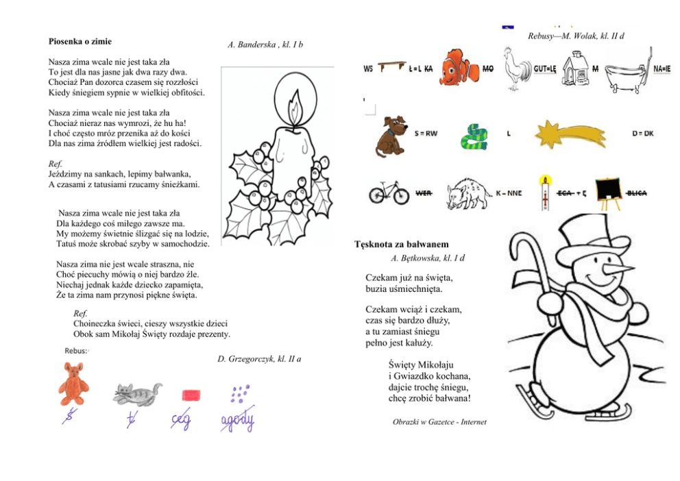Piosenka o zimie Rebusy—M. Wolak, kl. II d A. Banderska , kl. I b Nasza zima wcale nie jest taka zła To jest dla nas jasne jak dwa razy dwa. Chociaż Pan dozorca czasem się rozzłości Kiedy śniegiem sypnie w wielkiej obfitości. Nasza zima wcale nie jest taka zła Chociaż nieraz nas wymrozi, że hu ha! I choć często mróz przenika aż do kości Dla nas zima źródłem wielkiej jest radości. Ref. Jeździmy na sankach, lepimy bałwanka, A czasami z tatusiami rzucamy śnieżkami. Nasza zima wcale nie jest taka zła Dla każdego coś miłego zawsze ma. My możemy świetnie ślizgać się na lodzie, Tatuś może skrobać szyby w samochodzie. Tęsknota za bałwanem A. Bętkowska, kl. I d Nasza zima nie jest wcale straszna, nie Choć piecuchy mówią o niej bardzo źle. Niechaj jednak każde dziecko zapamięta, Że ta zima nam przynosi piękne święta. Czekam już na święta, buzia uśmiechnięta. Ref. Choineczka świeci, cieszy wszystkie dzieci Obok sam Mikołaj Święty rozdaje prezenty. D. Grzegorczyk, kl. II a Czekam wciąż i czekam, czas się bardzo dłuży, a tu zamiast śniegu pełno jest kałuży. Święty Mikołaju i Gwiazdko kochana, dajcie trochę śniegu, chcę zrobić bałwana! Obrazki w Gazetce - Internet K. Maksim, kl. I d O. Szafranek, kl. II d 1.Wisi na choince. 2. Dostają dzieci na deser. 3.Z czego robimy mąkę? 4.Imę żeńskie. 5. Jeżdżą na nich dzieci zimą. 6.Lepimy zimą. 7. Dostają dzieci pod choinkę. Wykonaj dzielenie. Zaznacz w wyrazie literę, którą wskaże iloraz. Odczytaj hasło. 8.Piszemy nim w szkole. 9. Chodzą w nich chłopcy. 10. Świeci w nocy. 4: 2 = 2:2= GRZYBY KOLĘDA MIKOŁAJ 12 :4 = 14 : 2 = 8:2= BABKA GWIAZDKA OPŁATEK Uzupełnij krzyżówkę. 11. Złożono w nim dzieciątko. 12. Przed Bożym Narodzeniem. 13. Roznosi prezenty. 14.Zwierzątko Mikołaja. K. Maj, O. Zychowicz, kl. II d Wykonaj obliczenia, wykreśl nieprawidłowy wynik, odczytaj hasło. 20 - 7 25 : 5 = 13 - 4 19 - 9 8+4 4+7 19 + 4 20 + 2 13 10 4 9 6 10 12 9 13 11 6 23 30 22 Ł L O A S Ń D M U J C E H C Z. Fiutka, kl. III d