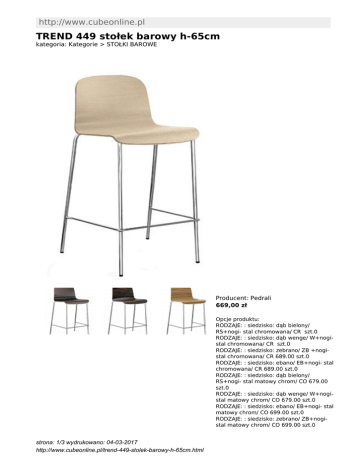 http://www.cubeonline.pl TREND 449 stołek barowy h-65cm kategoria: Kategorie > STOŁKI BAROWE Producent: Pedrali 669,00 zł strona: 1/3 wydrukowano: 04-03-2017 http://www.cubeonline.pl/trend-449-stolek-barowy-h-65cm.html Opcje produktu: RODZAJE: : siedzisko: dąb bielony/ RS+nogi- stal chromowana/ CR szt.0 RODZAJE: : siedzisko: dąb wenge/ W+nogistal chromowana/ CR szt.0 RODZAJE: : siedzisko: zebrano/ ZB +nogistal chromowana/ CR 689.00 szt.0 RODZAJE: : siedzisko: ebano/ EB+nogi- stal chromowana/ CR 689.00 szt.0 RODZAJE: : siedzisko: dąb bielony/ RS+nogi- stal matowy chrom/ CO 679.00 szt.0 RODZAJE: : siedzisko: dąb wenge/ W+nogistal matowy chrom/ CO 679.00 szt.0 RODZAJE: : siedzisko: ebano/ EB+nogi- stal matowy chrom/ CO 699.00 szt.0 RODZAJE: : siedzisko: zebrano/ ZB+nogistal matowy chrom/ CO 699.00 szt.0 Kod QR: Trend 449, wyprodukowany przez firm? Pedrali jest hokerem modnym, komfortowym oraz ergonomicznym. Siedzisko jest zrobione ze sklejki laminowanej i jest dost?pne w czterech kolorach, za? nog s? ze stali chromowanej. WYMIARY (cm): wysoko?? siedziska- 65 wysokos? ca?kowita- 88,50 szeroko??- 48 strona: 2/3 wydrukowano: 04-03-2017 http://www.cubeonline.pl/trend-449-stolek-barowy-h-65cm.html g?eboko??- 51 MATERIA?: siedzisko- sklejka fornirowana nogi- stal chromowana lub stal matowy chrom - cztery nogi INNE: mo?na stawia? jedno na drugim (max. 4 sztuk) Inne produkty firmy Pedrali: http://cubedesign.pl/manufacturer/pedrali strona: 3/3 wydrukowano: 04-03-2017 http://www.cubeonline.pl/trend-449-stolek-barowy-h-65cm.html