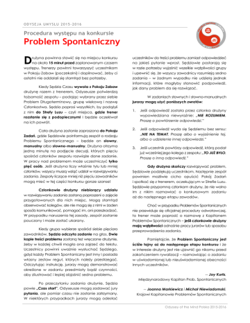 ODYSEJA UMYSŁU 2015-2016 Procedura występu na konkursie Problem Spontaniczny D rużyna powinna stawić się na miejscu konkursu na około 15 minut przed zaplanowanym czasem występu. Trenerzy powinni towarzyszyć uczestnikom w Pokoju Zabaw (poczekalni) i dopilnować, żeby ci ostatni nie oddalali się stamtąd bez potrzeby. Kiedy Sędzia Czasu wywoła z Pokoju Zabaw drużynę razem z trenerem, Odyseusze potwierdzą tożsamość zespołu – podając wybrany przez siebie Problem Długoterminowy, grupę wiekową i nazwę Członkostwa. Sędzia poprosi wszystkich, by podążyli z nim do Strefy Luzu – czyli miejsca, gdzie trener rozstanie się z podopiecznymi i będzie oczekiwał na ich powrót. Cała drużyna zostanie zaproszona do Pokoju Zadań, gdzie Sędziowie poinformują zespół o rodzaju Problemu Spontanicznego – będzie on słowny, manualny albo słowno-manualny. Drużyna otrzyma jedną minutę na podjęcie decyzji, których pięciu spośród członków zespołu rozwiąże dane zadanie. W pracy nad problemem może uczestniczyć tylko pięć osób. Jeśli drużyna liczy właśnie tylu lub mniej członków, wszyscy muszą wziąć udział w rozwiązywaniu zadania. Zespoły liczące mniej niż pięciu zawodników mogą mieć w tej części konkursu gorsze szanse! Członkowie drużyny niebiorący udziału w rozwiązywaniu zadania zostaną poproszeni o zajęcie przygotowanych dla nich miejsc. Mogą stamtąd obserwować kolegów, ale nie mogą się z nimi w żaden sposób komunikować, pomagać im, ani przeszkadzać. W przypadku naruszenia tej zasady, zespół zostanie pouczony i może zostać ukarany. Kiedy grupa wybierze spośród siebie pięcioro zawodników, Sędzia odczyta zadanie na głos. Dwie kopie treści problemu zostaną też wręczone drużynie, żeby w każdej chwili mogła ona zajrzeć do tekstu. Uczestnicy powinni uważnie wysłuchać Sędziego, gdyż każdy Problem Spontaniczny jest inny i posiada własny zestaw reguł, których należy przestrzegać. Odczytując instrukcję, jurorzy mogą demonstrować określone w zadaniu przedmioty bądź czynności, aby zilustrować i lepiej objaśnić sedno problemu. Po przeczytaniu zadania drużynie, Sędzia powie „Czas start”. Odyseusze mogą zadawać jury pytania, ale pomiar czasu nie zostanie zatrzymany. W niektórych przypadkach jurorzy mogą odesłać uczestników do treści problemu zamiast odpowiedzieć na jakieś pytanie wprost. Sędziowie postarają się w razie potrzeby wyjaśnić wszelkie wątpliwości grupy i upewnić się, że wszyscy zawodnicy rozumieją sedno zadania – w żadnym wypadku nie udzielą jednak informacji, które mogłyby stanowić podpowiedź, jak dany problem da się rozwiązać. W zadaniach słownych i słowno-manualnych jurorzy mogą użyć poniższych zwrotów: 1. Jeśli odpowiedź została przez członka drużyny wypowiedziana niewyraźnie: „NIE ROZUMIEM. Proszę o powtórzenie odpowiedzi.” 2. Jeśli odpowiedź wyda się Sędziemu bez sensu: „NIE NA TEMAT. Proszę albo o wyjaśnienie tej, albo o udzielenie innej odpowiedzi.” 3. Jeśli uczestnik powtórzy odpowiedź, którą podał już wcześniej jego kolega z zespołu: „TO JUŻ BYŁO. Proszę o inną odpowiedź.” Gdy drużyna skończy rozwiązywać problem, Sędziowie podziękują uczestnikom. Następnie zespół powinien możliwie cicho opuścić Pokój Zadań i spotkać się z trenerem, oczekującym w Strefie Luzu. Sędziowie przypomną członkom drużyny, że nie wolno im z nikim rozmawiać o konkursowym zadaniu aż do następnego etapu zawodów. Choć w przypadku Problemów Spontanicznych nie przewiduje się oficjalnej procedury odwoławczej, to trener może poprosić o rozmowę z Kapitanem Problemów Spontanicznych – jeśli członkowie drużyny mają wątpliwości odnośnie pracy jurorów lub sposobu przeprowadzenia zadania. Pamiętajcie, że Problem Spontaniczny jest ściśle tajny aż do następnego etapu konkursu i że w interesie drużyny jest nie ujawnić go nikomu przed zakończeniem rywalizacji – rozmawiając o zadaniu w uświadomionej lub nieuświadomionej obecności innych uczestników. -- Joy Kurtz, Międzynarodowy Kapitan Prob. Spontanicznych -- Joanna Markiewicz i Michał Niewiadomski, Krajowi Kapitanowie Problemów Spontanicznych Odyssey of the Mind Polska 2015-2016