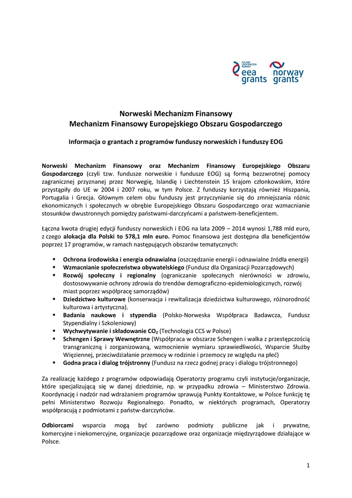 Norweski Mechanizm Finansowy Mechanizm Finansowy Europejskiego Obszaru Gospodarczego Informacja o grantach z programów funduszy norweskich i funduszy EOG Norweski Mechanizm Finansowy oraz Mechanizm Finansowy Europejskiego Obszaru Gospodarczego (czyli tzw. fundusze norweskie i fundusze EOG) są formą bezzwrotnej pomocy zagranicznej przyznanej przez Norwegię, Islandię i Liechtenstein 15 krajom członkowskim, które przystąpiły do UE w 2004 i 2007 roku, w tym Polsce. Z funduszy korzystają również Hiszpania, Portugalia i Grecja. Głównym celem obu funduszy jest przyczynianie się do zmniejszania różnic ekonomicznych i społecznych w obrębie Europejskiego Obszaru Gospodarczego oraz wzmacnianie stosunków dwustronnych pomiędzy państwami-darczyńcami a państwem-beneficjentem. Łączna kwota drugiej edycji funduszy norweskich i EOG na lata 2009 – 2014 wynosi 1,788 mld euro, z czego alokacja dla Polski to 578,1 mln euro. Pomoc finansowa jest dostępna dla beneficjentów poprzez 17 programów, w ramach następujących obszarów tematycznych: Ochrona środowiska i energia odnawialna (oszczędzanie energii i odnawialne źródła energii) Wzmacnianie społeczeństwa obywatelskiego (Fundusz dla Organizacji Pozarządowych) Rozwój społeczny i regionalny (ograniczanie społecznych nierówności w zdrowiu, dostosowywanie ochrony zdrowia do trendów demograficzno-epidemiologicznych, rozwój miast poprzez współpracę samorządów) Dziedzictwo kulturowe (konserwacja i rewitalizacja dziedzictwa kulturowego, różnorodność kulturowa i artystyczna). Badania naukowe i stypendia (Polsko-Norweska Współpraca Badawcza, Fundusz Stypendialny i Szkoleniowy) Wychwytywanie i składowanie CO2 (Technologia CCS w Polsce) Schengen i Sprawy Wewnętrzne (Współpraca w obszarze Schengen i walka z przestępczością transgraniczną i zorganizowaną, wzmocnienie wymiaru sprawiedliwości, Wsparcie Służby Więziennej, przeciwdziałanie przemocy w rodzinie i przemocy ze względu na płeć) Godna praca i dialog trójstronny (Fundusz na rzecz godnej pracy i dialogu trójstronnego) Za realizację każdego z programów odpowiadają Operatorzy programu czyli instytucje/organizacje, które specjalizującą się w danej dziedzinie, np. w przypadku zdrowia – Ministerstwo Zdrowia. Koordynację i nadzór nad wdrażaniem programów sprawują Punkty Kontaktowe, w Polsce funkcję tę pełni Ministerstwo Rozwoju Regionalnego. Ponadto, w niektórych programach, Operatorzy współpracują z podmiotami z państw-darczyńców. Odbiorcami wsparcia mogą być zarówno podmioty publiczne jak i prywatne, komercyjne i niekomercyjne, organizacje pozarządowe oraz organizacje międzyrządowe działające w Polsce. 1 Projekty realizowane są w partnerstwie z podmiotami z krajów darczyńców, istnieje jednak również możliwość, w zależności od specyfiki programu, przygotowywania projektów indywidualnych nie wymagających angażowania podmiotów z Islandii, Lichtensteinu czy Norwegii. Aby ułatwiać poszukiwanie partnerów z państw-darczyńców, ustanowiony został Fundusz Współpracy Dwustronnej na poziomie programu. Podmiotom poszukującym partnerów sugeruje się kontakt z polskim operatorem poszczególnych programów, możliwe jest również skierowanie zapytania do Ambasady Norwegii w Warszawie a także Biura Regionalnego Województwa Lubuskiego, które korzystając z obecności biur regionalnych państw-darczyńców w Brukseli, może wspomóc lubuskie podmioty w inicjowaniu takich partnerstw. Poziom dofinansowania projektów wynosi do 85% całkowitych kosztów kwalifikowanych projektu, pozostałe środki zapewniają beneficjenci jako wkład własny. W niektórych przypadkach, organizacje pozarządowe mogą uzyskać dofinansowanie na poziomie 90%. Minimalna kwota dofinansowania projektu to 170 tys. Euro, jednakże w niektórych programach przewidziano ustanowienie Funduszu Małych Grantów, w których kwota dofinansowania może wynosić od 5 tys. do 250 tys. Euro. Szczegóły odnośnie minimalnej i maksymalnej wartości dofinansowania określone są zgodnie ze specyfiką danego programu. O środki z funduszy norweskich i EOG można ubiegać się poprzez zgłaszanie projektów w konkursach, ogłaszanych przez operatorów w ramach poszczególnych programów. Ponadto realizowane są tzw. projekty predefiniowane czyli projekty "z góry" wskazane do realizacji. AKTUALNIE OTWARTE ZAPROSZENIA DO SKŁADANIA WNIOSKÓW: Zagadnienie: Termin składania wniosków: Priorytet: Obszar objęty programem: Program: Cel: Partner projektu ze strony darczyńców: Przewidywane wyniki – tura II: Budżet i tura II: Przewidywane wyniki – tura III: Budżet i tura III: Przewidywane wyniki – tura IV: Budżet i tura IV: Fundusz Stypendialny Tura II - 30 kwietnia 2013 r. Tura III - 03 czerwca 2013 r. Tura IV - 03 czerwca 2013 r. Badania i nauka PA19 - stypendia PA24 - bilateralne programy stypendialne PL10 - Program stypendialny EOG; Norwesko-Polski Program Stypendialny Zwiększony kapitał ludzki oraz baza wiedzy w państwach będących beneficjentami Islandzkie Centrum Badań (RANNIS), Agencja ds. Kształcenia Międzynarodowego (AIBA), Norweskie Centrum Współpracy Międzynarodowej w Edukacji (SIU) Zwiększenie mobilności studentów i pracowników wyższych uczelni pomiędzy państwami-beneficjentami a Norwegią lub krajami należącymi do EFTA i EOG € 1 793 334 Zwiększona i wzmocniona współpraca instytucjonalna na wszystkich poziomach sektora edukacji (edukacja szkolna, szkolnictwo wyższe, kształcenie zawodowe / edukacja i kształcenie dorosłych) pomiędzy państwami-beneficjentami a państwami należącymi do EFTA i EOG. € 1 873 333 Zwiększona i wzmocniona współpraca instytucjonalna w sektorze szkolnictwa wyższego pomiędzy państwami-beneficjentami a Norwegią. € 2 866 667 2 WWW – tura II, III i IV: Kto może się ubiegać: http://www.fss.org.pl/en/nabory; http://eeagrants.org/programme/view/PL10/PA19 Studenci i pr