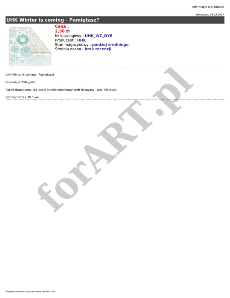 Informacje o produkcie Utworzono 04-03-2017 UHK Winter is coming - Pamiętasz? Cena : 2,50 zł Nr katalogowy : UHK_WC_DYR Producent : UHK Stan magazynowy : poniżej średniego Średnia ocena : brak recenzji UHK Winter is coming - Pamiętasz? T. pl Gramatura 250 g/m2. Papier dwustronny. Na jasnej stronie dodatkowy wzór foliowany - tzw. ink resist. fo rA R Rozmiar 30.5 x 30.5 xm Wygenerowano w programie www.oscGold.com