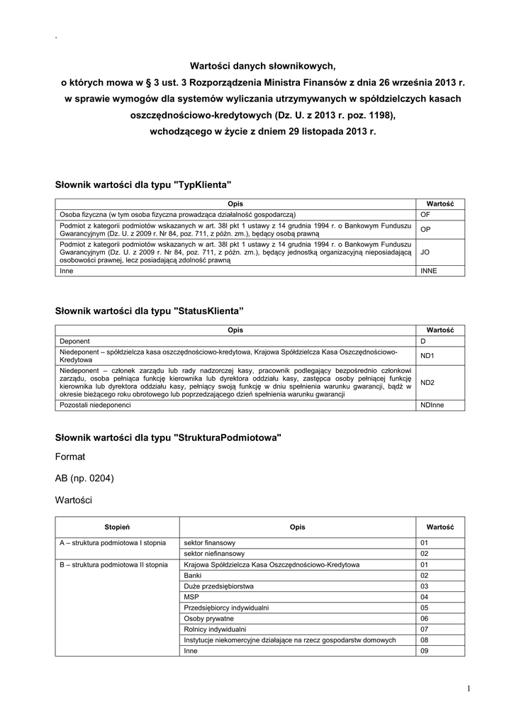 . Wartości danych słownikowych, o których mowa w § 3 ust. 3 Rozporządzenia Ministra Finansów z dnia 26 września 2013 r. w sprawie wymogów dla systemów wyliczania utrzymywanych w spółdzielczych kasach oszczędnościowo-kredytowych (Dz. U. z 2013 r. poz. 1198), wchodzącego w życie z dniem 29 listopada 2013 r. Słownik wartości dla typu "TypKlienta" Wartość Opis Osoba fizyczna (w tym osoba fizyczna prowadząca działalność gospodarczą) OF Podmiot z kategorii podmiotów wskazanych w art. 38l pkt 1 ustawy z 14 grudnia 1994 r. o Bankowym Funduszu Gwarancyjnym (Dz. U. z 2009 r. Nr 84, poz. 711, z późn. zm.), będący osobą prawną OP Podmiot z kategorii podmiotów wskazanych w art. 38l pkt 1 ustawy z 14 grudnia 1994 r. o Bankowym Funduszu Gwarancyjnym (Dz. U. z 2009 r. Nr 84, poz. 711, z późn. zm.), będący jednostką organizacyjną nieposiadającą osobowości prawnej, lecz posiadającą zdolność prawną JO Inne INNE Słownik wartości dla typu "StatusKlienta” Wartość Opis Deponent D Niedeponent – spółdzielcza kasa oszczędnościowo-kredytowa, Krajowa Spółdzielcza Kasa OszczędnościowoKredytowa ND1 Niedeponent – członek zarządu lub rady nadzorczej kasy, pracownik podlegający bezpośrednio członkowi zarządu, osoba pełniąca funkcję kierownika lub dyrektora oddziału kasy, zastępca osoby pełniącej funkcję kierownika lub dyrektora oddziału kasy, pełniący swoją funkcję w dniu spełnienia warunku gwarancji, bądź w okresie bieżącego roku obrotowego lub poprzedzającego dzień spełnienia warunku gwarancji ND2 Pozostali niedeponenci NDInne Słownik wartości dla typu "StrukturaPodmiotowa" Format AB (np. 0204) Wartości Stopień A – struktura podmiotowa I stopnia B – struktura podmiotowa II stopnia Opis Wartość sektor finansowy 01 sektor niefinansowy 02 Krajowa Spółdzielcza Kasa Oszczędnościowo-Kredytowa 01 Banki 02 Duże przedsiębiorstwa 03 MSP 04 Przedsiębiorcy indywidualni 05 Osoby prywatne 06 Rolnicy indywidualni 07 Instytucje niekomercyjne działające na rzecz gospodarstw domowych 08 Inne 09 1 . Słownik wartości dla typu "StrukturaProduktowa" Format C (np. 02) Wartości Stopień C – struktura produktowa dla depozytów Opis Wartość depozyty bieżące 01 depozyty terminowe 02 Słownik wartości dla typu "TypDokumentu" Opis Wartość Dowód osobisty DO Paszport PA Karta stałego pobytu KSP Paszport zagraniczny lub dowód osobisty zagraniczny PAZ Inne INNE Osoba małoletnia nieposiadająca dokumentu tożsamości OM Słownik wartości dla typu "StatusWierzytelnosci" Opis Wartość Wierzytelność z tytułu rachunku imiennego z wyłączeniem udziałów i wkładów członkowskich G1 Wierzytelność z tytułu przeprowadzania przez kasę rozliczeń finansowych G2 Wierzytelność z tytułu kosztów pogrzebu lub zapisu na wypadek śmierci (art. 14 ust. 1 ustawy o spółdzielczych kasach oszczędnościowo-kredytowych), o ile stała się wymagalna przed dniem spełnienia warunku gwarancji G3 Wierzytelność niegwarantowana - z tytułu udziałów i wkładów członkowskich NG1 Inna wierzytelność niegwarantowana NG2 2 . Słownik definicji agregatów z księgi głównej Nazwa Opis Definicja agregatu wg arkuszy sprawozdawczych Filtr dla słowników typu „StrukturaPodmiotowa” oraz „StrukturaProduktowa” P-01 depozyty bieżące ogółem ZZPO01.1A + ZZPO01.2 A + ZZPO01.3 A + ZZPO01.4 A + ZZPO01.5 A + ZZPO01.6 A + ZZPO01.7 A lub ZZPO01.8A (A=02) i (B=03 lub B=04 lub B=05 lub B=06 lub B=07 lub B=08) i (C=01) P-02 depozyty terminowe ogółem ZZPO01.1(suma od C do G)+ ZZPO01.2 (suma od C do G) + ZZPO01.3 (suma od C do G) + ZZPO01.4 (suma od C do G) + ZZPO01.5 (suma od C do G) + ZZPO01.6 (suma od C do G) + ZZPO01.7 (suma od C do G) lub ZZPO01.8(suma od C do G) (A=02) i (B=03 lub B=04 lub B=05 lub B=06 lub B=07 lub B=08) i (C=02) P-03 depozyty osób fizycznych ZZPO01.3 (suma od A do G) + ZZPO01.4 (suma od A do G) + ZZPO01.5 (suma od A do G) (A=02) i (B=05 lub B=06 lub B=07) i (C=01 lub C=2) P-04 depozyty podmiotów innych, niż osób fizycznych wykazanych powyżej ZZPO01.1 (suma od A do G) + ZZPO01.2 (suma od A do G) + ZZPO01.6 (suma od A do G) + ZZPO01.7 (suma od A do G) (A=02) i (B=03 lub B=04 lub B=08 lub B=09) i (C=01 lub C=2) Uwaga: Podane definicje bazują na formularzach sprawozdawczości określonych w załączniku nr 1 do rozporządzenia Ministra Finansów z dnia 8 stycznia 2013 r. w sprawie informacji sprawozdawczych spółdzielczych kas oszczędnościowo-kredytowych oraz Krajowej Spółdzielczej Kasy Oszczędnościowo-Kredytowej. Wartości agregatów winny być określone na podstawie danych z księgi głównej. 3