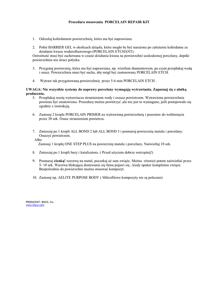 Procedura stosowania PORCELAIN REPAIR KIT 1. Odizoluj koferdamem powierzchnię, która ma być naprawiana. 2. Połóż BARRIER GEL w okolicach dziąsła, które mogło by być narażone po założeniu koferdamu za działanie kwasu wodorofluorowego (PORCELAIN ETCHANT). Ostrożność musi być zachowana w czasie działania kwasu na powierzchni uszkodzonej porcelany, dopóki powierzchnia nie straci połysku. 3. Przygotuj powierznię, która ma być naprawiana, np. wiertłem diamentowym, po czym przepłukaj wodą i osusz. Powierzchnia musi być sucha, aby mógł być zastosowany PORCELAIN ETCH. 4. Wytraw tak przygotowaną powierzchnię przez 5-6 min PORCELAIN ETCH . UWAGA: Nie wszystkie systemy do naprawy porcelany wymagają wytrawiania. Zapoznaj się z ulotką producenta. 5. Przepłukaj resztę wytrawiacza strumieniem wody i oszusz powietrzem. Wytrawiona powierzchnia powinna być zmatowiona. Procedurę można powtórzyć ,ale nie jest to wymagane, jeśli postepowało się zgodnie z instrukcją. 6. Zastosuj 2 krople PORCELAIN PRIMER na wytrawioną powierzchnię i pozostaw do wchłonięcia przez 30 sek. Osusz strumieniem powietrza. 7. Zmieszaj po 1 kropli ALL BOND 2 lub ALL BOND 3 i posmaruj powierznię metalu i porcelany. Osuszyć powietrzem. Albo Zastosuj 1 kroplę ONE STEP PLUS na powierznię matalu i porcelany. Naświetlaj 10 sek. 8. Zmieszaj po 1 kropli bazy i katalizatora. ( Przed użyciem dobrze wstrząśnij!) 9. Posmaruj cienką! warstwę na metal, poczekaj aż sam zwiąże. Można również potem naświetlać przez 5- 10 sek. Warstwa blokująca dostawanie się tlenu pojawi się , kiedy opaker kompletnie związe. Bezpośrednio do powierzchni można stosować kompozyt. 10. Zastosuj np. AELITE PURPOSE BODY ( Mikrofilowe kompozyty nie są polecane) PRODUCENT: BISCO, Inc. www.bisco.com