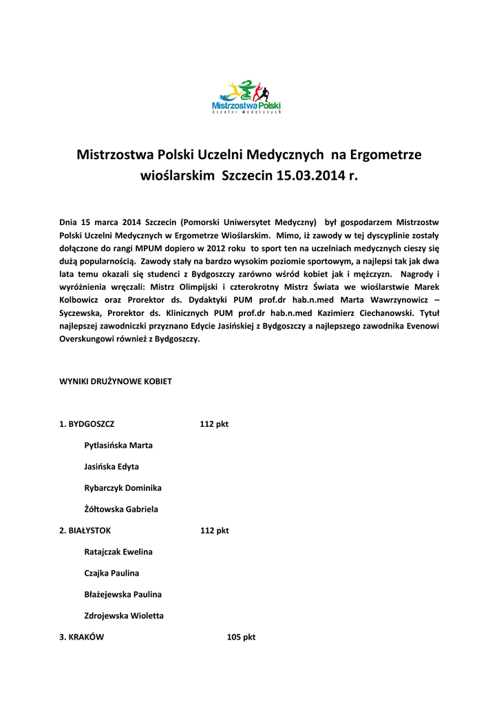 Mistrzostwa Polski Uczelni Medycznych na Ergometrze wioślarskim Szczecin 15.03.2014 r. Dnia 15 marca 2014 Szczecin (Pomorski Uniwersytet Medyczny) był gospodarzem Mistrzostw Polski Uczelni Medycznych w Ergometrze Wioślarskim. Mimo, iż zawody w tej dyscyplinie zostały dołączone do rangi MPUM dopiero w 2012 roku to sport ten na uczelniach medycznych cieszy się dużą popularnością. Zawody stały na bardzo wysokim poziomie sportowym, a najlepsi tak jak dwa lata temu okazali się studenci z Bydgoszczy zarówno wśród kobiet jak i mężczyzn. Nagrody i wyróżnienia wręczali: Mistrz Olimpijski i czterokrotny Mistrz Świata we wioślarstwie Marek Kolbowicz oraz Prorektor ds. Dydaktyki PUM prof.dr hab.n.med Marta Wawrzynowicz – Syczewska, Prorektor ds. Klinicznych PUM prof.dr hab.n.med Kazimierz Ciechanowski. Tytuł najlepszej zawodniczki przyznano Edycie Jasińskiej z Bydgoszczy a najlepszego zawodnika Evenowi Overskungowi również z Bydgoszczy. WYNIKI DRUŻYNOWE KOBIET 1. BYDGOSZCZ 112 pkt Pytlasińska Marta Jasińska Edyta Rybarczyk Dominika Żółtowska Gabriela 2. BIAŁYSTOK 112 pkt Ratajczak Ewelina Czajka Paulina Błażejewska Paulina Zdrojewska Wioletta 3. KRAKÓW 105 pkt Bjornsgaard Signe Vonen Mari Bazan Anna Pieprzyca Magda 4. Poznań 92 pkt Łuczak Kinga Rost Martyna Sacha Marta Liberska Agata 5. Wrocław 90 pkt Sokołowska Marta Krytowska Joanna Sobkowicz Anna Pietrzak Joanna 6. Łódź 87 pkt Jankowska Nina Kurzawa Maria Kołodziejczak Magda Nogacka Katarzyna 7. Szczecin Cichosz Agnieszka Żyłowska Marlena Kowalska Justyna Chwiałkowski Dominika 77 pkt WYNIKI DRUŻYNOWE MĘŻCZYZN 1. BYDGOSZCZ 120 pkt Overskung Even Karpiński Bartłomiej Madelski Karol Anielski Maciej 2. WROCŁAW 105,5 pkt Mielczarek Piotr Klepacki Krzysztof Kobecki Jakub Maciaszek Julian 3. BIAŁYSTOK 102 pkt Rogulski Albert Bulcer Arkadiusz Żołnowski Łukasz Zabłocki Marek 4. Łódź 95 pkt Pawełczak Dariusz Cichosz Jarosław Jankowski Przemysław Stach Bartłomiej 5. Szczecin Okła Mateusz Kosikowski Patryk Ortlieb Tomasz Kułaga Mateusz 85 pkt 6. Gdańsk 76,5 pkt Trzepałkowski Rafał Migda Mirosław Witkowski Marek Bardo Szymon 7. Kraków 75 pkt Pihl Michael Andersen Erik Osak Paweł Sandoy Sturla 8. Lublin 53 pkt Surmacz Wojciech Kosikowski Jakub Jawoszek Patryk Drela Jan 9. Poznań Krogulecki Michał Michalewicz Mateusz Dreger Igor Pisarek Jakub . 49 pkt