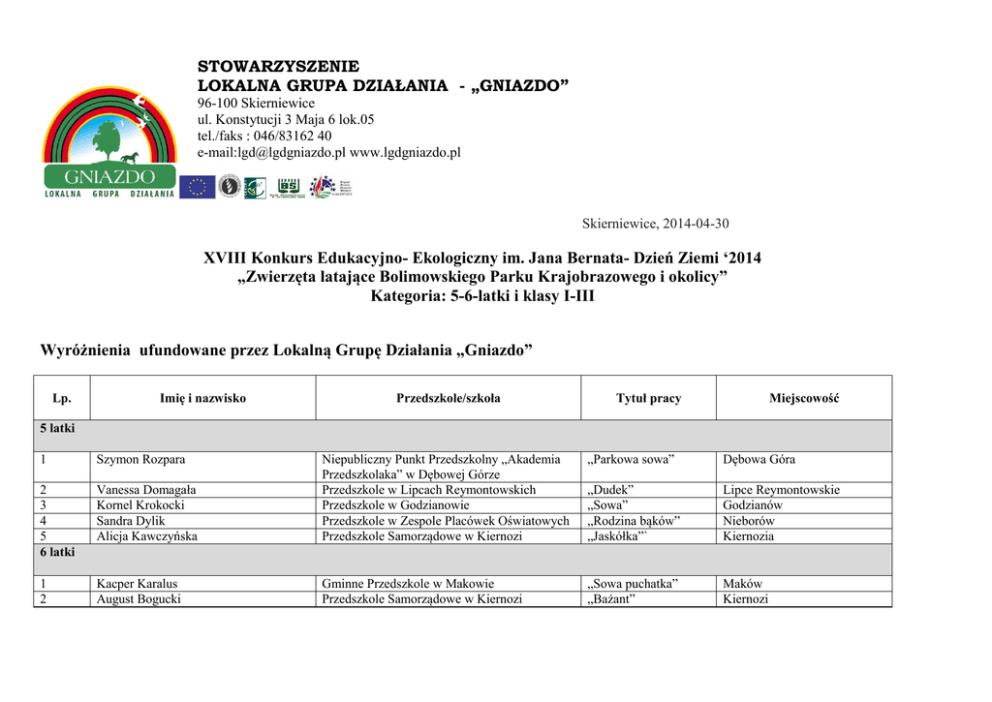 STOWARZYSZENIE LOKALNA GRUPA DZIAŁANIA - „GNIAZDO” 96-100 Skierniewice ul. Konstytucji 3 Maja 6 lok.05 tel./faks : 046/83162 40 e-mail:[email protected] www.lgdgniazdo.pl Skierniewice, 2014-04-30 XVIII Konkurs Edukacyjno- Ekologiczny im. Jana Bernata- Dzień Ziemi ‘2014 „Zwierzęta latające Bolimowskiego Parku Krajobrazowego i okolicy” Kategoria: 5-6-latki i klasy I-III Wyróżnienia ufundowane przez Lokalną Grupę Działania „Gniazdo” Lp. Imię i nazwisko Przedszkole/szkoła Tytuł pracy Miejscowość 5 latki „Parkowa sowa” Dębowa Góra Vanessa Domagała Kornel Krokocki Sandra Dylik Alicja Kawczyńska Niepubliczny Punkt Przedszkolny „Akademia Przedszkolaka” w Dębowej Górze Przedszkole w Lipcach Reymontowskich Przedszkole w Godzianowie Przedszkole w Zespole Placówek Oświatowych Przedszkole Samorządowe w Kiernozi „Dudek” „Sowa” „Rodzina bąków” „Jaskółka”` Lipce Reymontowskie Godzianów Nieborów Kiernozia Kacper Karalus August Bogucki Gminne Przedszkole w Makowie Przedszkole Samorządowe w Kiernozi „Sowa puchatka” „Bażant” Maków Kiernozi 1 Szymon Rozpara 2 3 4 5 6 latki 1 2 „Sowa uszata” Michowice Mikołaj Antonkiewicz Karolina Nowak Szkoła Podstawowa im. J. Korczaka w Michowicach Szkoła Podstawowa w Białyninie Gminne Przedszkole w Makowie „Sokół” „Dzięcioł średni” Białynin Maków 1 2 Zuzanna Krawczyk Ewelina Rzadkiewicz Szkoła Podstawowa w Godzianowie Szkoła Podstawowa w Dąbrowicach Godzianów Dąbrowice 3 4 Aleksandra Piechut Jakub Szeląg Szkoła Podstawowa w Słomkowie Publiczna Szkoła Podstawowa w Janisławicach 5 Krzysztof Filipek Szkoła Podstawowa im. Księdza kardynała S.Wyszyńskiego w Woli Makowskiej „Ptasie trele” „Ptaki Bolimowskiego Parku Krajobrazowego” „Motyl” „Skowronek przy gnieździe” „Sowa” Kacper Klemba Mateusz Wojciechowski Szymon Sikora Miłosz Chmurski Szkoła Podstawowa w Białyninie Szkoła Podstawowa w Białyninie Szkoła Podstawowa w Nowym Dworze Niepubliczna Szkoła w Zagórzu „Biedronka” „Gil” „Sowa” „Gniazdo hajstry – bociana czarnego” „Sowa” Białynin Białynin Nowy Dwór Zagórz „Sowa uszata” _ Wola Makowska Nowy Dwór „Ptaszki lotki” „Motyle” „Boćki w gnieździe” Dzierzgówek Słupia Dzierzgówek 3 Izabela Wielanek 4 5 I klasa Słomków Janisławice Wola Makowska II klasa 1 2 3 4 5 Paweł Bachura III klasa Szkoła Podstawowa w Godzianowie 1 2 Zuzanna Kujawiak Jakub Sadach 3 4 5 Jakub Marks Marta Kowara Maciej Pękosz Szkoła Podstawowa w Woli Makowskiej Publiczna Szkoła Podstawowa w Nowym Dworze Szkoła Podstawowa w Dzierzgówku ZSO w Słupi Szkoła Podstawowa w Dzierzgówku Godzianów