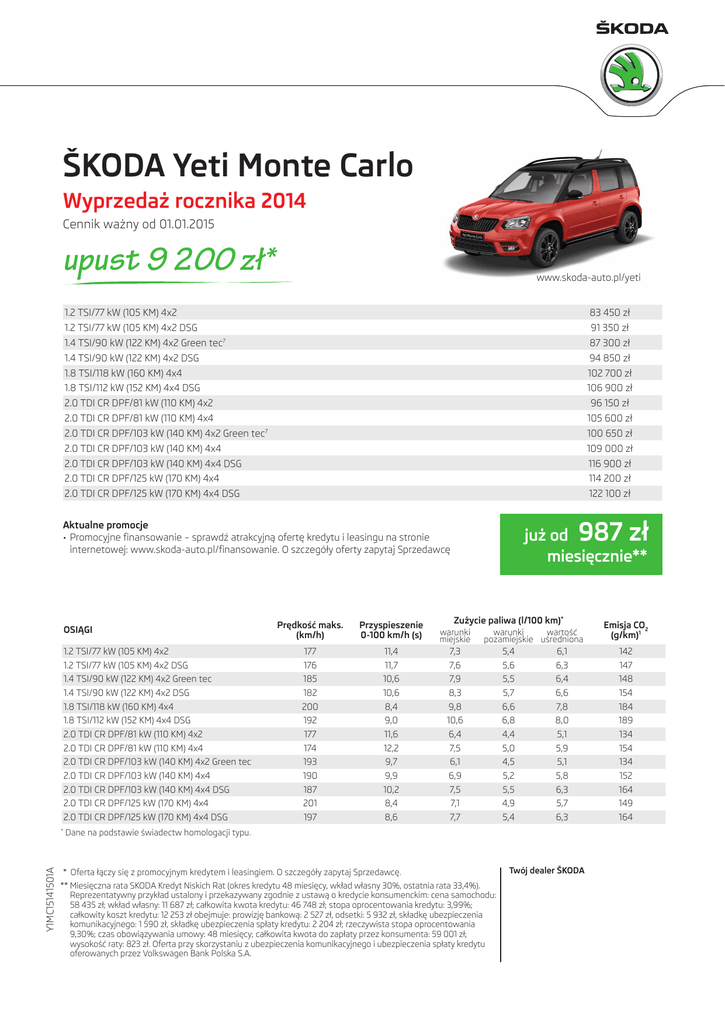 ŠKODA Yeti Monte Carlo Wyprzedaż rocznika 2014 Cennik ważny od 01.01.2015 upust 9 200 zł* www.skoda-auto.pl/yeti 1.2 TSI/77 kW (105 KM) 4x2 83 450 zł 1.2 TSI/77 kW (105 KM) 4x2 DSG 91 350 zł 1.4 TSI/90 kW (122 KM) 4x2 Green tec7 87 300 zł 1.4 TSI/90 kW (122 KM) 4x2 DSG 94 850 zł 1.8 TSI/118 kW (160 KM) 4x4 102 700 zł 1.8 TSI/112 kW (152 KM) 4x4 DSG 106 900 zł 2.0 TDI CR DPF/81 kW (110 KM) 4x2 96 150 zł 2.0 TDI CR DPF/81 kW (110 KM) 4x4 105 600 zł 2.0 TDI CR DPF/103 kW (140 KM) 4x2 Green tec7 100 650 zł 2.0 TDI CR DPF/103 kW (140 KM) 4x4 109 000 zł 2.0 TDI CR DPF/103 kW (140 KM) 4x4 DSG 116 900 zł 2.0 TDI CR DPF/125 kW (170 KM) 4x4 114 200 zł 2.0 TDI CR DPF/125 kW (170 KM) 4x4 DSG 122 100 zł 987 zł Aktualne promocje • Promocyjne finansowanie – sprawdź atrakcyjną ofertę kredytu i leasingu na stronie internetowej: www.skoda-auto.pl/finansowanie. O szczegóły oferty zapytaj Sprzedawcę już od miesięcznie** Zużycie paliwa (l/100 km)* Prędkość maks. (km/h) Przyspieszenie 0-100 km/h (s) 1.2 TSI/77 kW (105 KM) 4x2 177 11,4 7,3 5,4 6,1 1.2 TSI/77 kW (105 KM) 4x2 DSG 176 11,7 7,6 5,6 6,3 147 1.4 TSI/90 kW (122 KM) 4x2 Green tec 185 10,6 7,9 5,5 6,4 148 1.4 TSI/90 kW (122 KM) 4x2 DSG 182 10,6 8,3 5,7 6,6 154 1.8 TSI/118 kW (160 KM) 4x4 200 8,4 9,8 6,6 7,8 184 1.8 TSI/112 kW (152 KM) 4x4 DSG 192 9,0 10,6 6,8 8,0 189 2.0 TDI CR DPF/81 kW (110 KM) 4x2 177 11,6 6,4 4,4 5,1 134 2.0 TDI CR DPF/81 kW (110 KM) 4x4 174 12,2 7,5 5,0 5,9 154 2.0 TDI CR DPF/103 kW (140 KM) 4x2 Green tec 193 9,7 6,1 4,5 5,1 134 2.0 TDI CR DPF/103 kW (140 KM) 4x4 190 9,9 6,9 5,2 5,8 152 2.0 TDI CR DPF/103 kW (140 KM) 4x4 DSG 187 10,2 7,5 5,5 6,3 164 2.0 TDI CR DPF/125 kW (170 KM) 4x4 201 8,4 7,1 4,9 5,7 149 2.0 TDI CR DPF/125 kW (170 KM) 4x4 DSG 197 8,6 7,7 5,4 6,3 164 OSIĄGI warunki miejskie warunki wartość pozamiejskie uśredniona Dane na podstawie świadectw homologacji typu. Y1MC15141501A * * Oferta łączy się z promocyjnym kredytem i leasingiem. O szczegóły zapytaj Sprzedawcę. ** Miesięczna rata SKODA Kredyt Niskich Rat (okres kredytu 48 miesięcy, wkład własny 30%, ostatnia rata 33,4%). Reprezentatywny przykład ustalony i przekazywany zgodnie z ustawą o kredycie konsumenckim: cena samochodu: 58 435 zł; wkład własny: 11 687 zł; całkowita kwota kredytu: 46 748 zł; stopa oprocentowania kredytu: 3,99%; całkowity koszt kredytu: 12 253 zł obejmuje: prowizję bankową: 2 527 zł, odsetki: 5 932 zł, składkę ubezpieczenia komunikacyjnego: 1 590 zł, składkę ubezpieczenia spłaty kredytu: 2 204 zł; rzeczywista stopa oprocentowania 9,30%; czas obowiązywania umowy: 48 miesięcy; całkowita kwota do zapłaty przez konsumenta: 59 001 zł; wysokość raty: 823 zł. Oferta przy skorzystaniu z ubezpieczenia komunikacyjnego i ubezpieczenia spłaty kredytu oferowanych przez Volkswagen Bank Polska S.A. Twój dealer ŠKODA Emisja CO2 (g/km)1 142 ŠKODA Yeti Monte Carlo WYBRANE ELEMENTY WYPOSAŻENIA STANDARDOWEGO PODRÓŻUJ BEZPIECZNIE • Poduszka powietrzna dla kierowcy i pasażera • Boczne poduszki powietrzne z przodu • Kurtyny powietrzne • Poduszka chroniąca kolana kierowcy • ESP (z ABS, EBV, MSR, ASR, EDS, HBA, DSR) • TPM – funkcja kontroli ciśnienia w oponach PO PIERWSZE FUNKCJONALNOŚĆ • Przednie światła przeciwmgłowe z elementami w kolorze czarnym • Elektromechaniczne wspomaganie kierownicy • Halogenowe reflektory przednie z elementami w kolorze czarnym • Tylne światła w technologii LED • Światła do jazdy dziennej • Wyświetlacz Maxi DOT z komputerem pokładowym • Konsola środkowa z podłokietnikiem Jumbo Box • Schowek na okulary • Uchwyt na kwity parkingowe • VarioFlex z funkcją stolika • Latarka w bagażniku • Zestaw siatek • Relingi dachowe – czarne PODRÓŻUJ KOMFORTOWO • Zdalnie sterowany centralny zamek (2 składane kluczyki) • Czujnik parkowania z tyłu • Trójramienna skórzana sportowa kierownica wielofunkcyjna z przeszyciami w kolorze czerwonym (pakiet skórzany, obsługa: radio, GSM) • Climatronic - dwustrefowa, automatyczna klimatyzacja • Sportowe fotele kierowcy i pasażera z przodu regulowane na wysokość • Elektrycznie sterowane szyby z przodu i z tyłu • Elektrycznie sterowane, podgrzewane, składane lusterka boczne z oświetleniem wokół drzwi AUDIO I KOMUNIKACJA • Radioodtwarzacz BOLERO (Bluetooth, USB, MP3) • Gniazdo AUX IN • Dodatkowe 4 głośniki z tyłu STYLISTYKA • SUNSET – tylne szyby o wyższym stopniu przyciemnienia • Obręcze kół ze stopu metali lekkich ORIGAMI 7J x 17” w kolorze czarnym • Zestaw naprawczy do kół • Dach, relingi, osłony lusterek zewnętrznych, spojler na zderzaku z przodu, dyfuzor z tyłu, ramka grilla oraz progi drzwi w kolorze czarnym • Klamki drzwi w kolorze nadwozia • Zderzaki w kolorze nadwozia • Listwy boczne w kolorze nadwozia • Oznaczenie Monte Carlo na błotnikach z przodu • Ochronne listwy na progi drzwi z oznaczeniem Monte Carlo • Ozdobna końcówka układu wydechowego • Tapicerka SPORT (kierownica, mieszek gałki zmiany biegów oraz dźwignia hamulca ręcznego z przeszyciami w kolorze czerwonym) • Deska rozdzielcza w kolorze czarnym z dekorem na wzór karbonu • Dywaniki z przeszyciami w kolorze czerwonym • Stalowe nakładki na pedały WYBRANE ELEMENTY WYPOSAŻENIA OPCJONALNEGO PODRÓŻUJ BEZPIECZNIE • Boczne poduszki powietrzne z tyłu z kurtynami powietrznymi . . 1 300 • Uchwyty ISOFIX na fotelu pasażera z przodu. . . . . . . . . . . . . . . . . . 150 • Offroad – tryb wspomagania jazdy w trudnym terenie (tylko dla 4x4). . . . . . . . . . . . . . . . . . . . . . . . . . . . . . . . . . . . . . . . . . . . . . . . 350 • HHC – funkcja wspomagania ruszania pod wzniesienia dla systemu ESP1. . . . . . . . . . . . . . . . . . . . . . . . . . . . . . . . . . . . . . . . . . . . . . . .600 • Alarm z funkcją monitoringu wnętrza i czujnikiem przechyłu + niezależna syrena. . . . . . . . . . . . . . . . . .