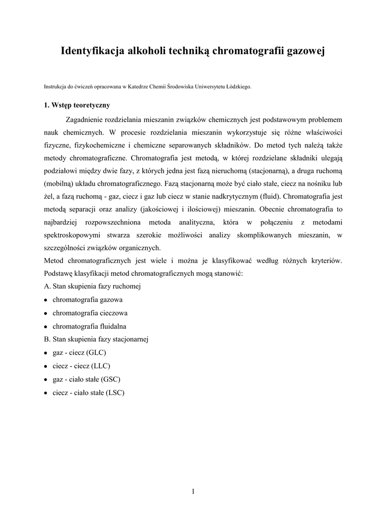 Identyfikacja alkoholi techniką chromatografii gazowej Instrukcja do ćwiczeń opracowana w Katedrze Chemii Środowiska Uniwersytetu Łódzkiego. 1. Wstęp teoretyczny Zagadnienie rozdzielania mieszanin związków chemicznych jest podstawowym problemem nauk chemicznych. W procesie rozdzielania mieszanin wykorzystuje się różne właściwości fizyczne, fizykochemiczne i chemiczne separowanych składników. Do metod tych należą także metody chromatograficzne. Chromatografia jest metodą, w której rozdzielane składniki ulegają podziałowi między dwie fazy, z których jedna jest fazą nieruchomą (stacjonarną), a druga ruchomą (mobilną) układu chromatograficznego. Fazą stacjonarną może być ciało stałe, ciecz na nośniku lub żel, a fazą ruchomą - gaz, ciecz i gaz lub ciecz w stanie nadkrytycznym (fluid). Chromatografia jest metodą separacji oraz analizy (jakościowej i ilościowej) mieszanin. Obecnie chromatografia to najbardziej rozpowszechniona metoda analityczna, która w połączeniu z metodami spektroskopowymi stwarza szerokie możliwości analizy skomplikowanych mieszanin, w szczególności związków organicznych. Metod chromatograficznych jest wiele i można je klasyfikować według różnych kryteriów. Podstawę klasyfikacji metod chromatograficznych mogą stanowić: A. Stan skupienia fazy ruchomej chromatografia gazowa chromatografia cieczowa chromatografia fluidalna B. Stan skupienia fazy stacjonarnej gaz - ciecz (GLC) ciecz - ciecz (LLC) gaz - ciało stałe (GSC) ciecz - ciało stałe (LSC) 1 C. Natura zjawisk będących podstawą procesu chromatograficznego chromatografia adsorpcyjna chromatografia podziałowa chromatografia jonowymienna chromatografia sitowa D. Techniki eksperymentalne technika kolumnowa technika planarna (cienkowarstwowa i bibułowa) Chromatografia gazowa jest metodą stosunkowo „młodą”, gdyż pierwsze prace ukazały się w 1952 roku. Chromatografia gazowa jest szybką i skuteczną metodą rozdzielania mieszanin związków lotnych. Znalazła ona szerokie zastosowanie do identyfikacji i oznaczeń ilościowych złożonych mieszanin, kontroli procesów technologicznych, wyznaczania niektórych stałych fizykochemicznych oraz badania kinetyki reakcji. Zgodnie z wcześniejszą klasyfikacją wyróżnia się następujące rodzaje chromatografii gazowej: 1. chromatografia w układzie gaz - ciało stałe, 2. chromatografia w układzie gaz – ciecz. Aparatura do chromatografii gazowej Chromatografy gazowe należą do przyrządów najczęściej wykorzystywanych w analizie chemicznej. Chromatografy gazowe można podzielić na: chromatografy laboratoryjne, chromatografy procesowe, stanowiące część instalacji przemysłowych i używane w ciągłej, automatycznej kontroli procesów technologicznych, chromatografy przenośne (walizkowe lub kieszonkowe) o małych rozmiarach, służące do analiz polowych. Schemat chromatografu gazowego przedstawiono na rysunku 1. Częściami składowymi chromatografu są: 1) zbiornik gazu nośnego, 2) regulator przepływu (odtleniacz i osuszacz) gazu nośnego, 3) dozownik, 4) kolumna chromatograficzna, 2 5) termostat dozownika, kolumny i detektora, 6) detektor, 7) przepływomierz, 8) wzmacniacz sygnału, 9) rejestrator i integrator lub komputer z drukarką. 11 10 7 1 2 3 4 6 8 9 5 Rys. 1. Schemat chromatografu gazowego; 1- zbiornik, 2 - regulator przepływu gazu, 3 - dozownik, 4 - kolumna, 5 - termostat, 6 - detektor, 7 - przepływomierz, 8 - wzmacniacz, 9 - rejestrator, 10 - integrator, 11 - wylot gazów Gaz nośny powinien być chemicznie obojętny zarówno w stosunku do wypełnienia kolumny, jak i do składników badanej mieszaniny. Jako gaz nośny stosuje się najczęściej wodór, azot, argon lub hel. Rodzaj gazu nośnego ma mały wpływ na wynik rozdzielania chromatograficznego. Wybór gazu nośnego zależy głównie od zastosowanego detektora. Istotne znaczenie ma czystość gazu nośnego, dlatego przed kolumną znajduje się układ oczyszczania gazu nośnego. Metodą chromatografii gazowej można rozdzielać substancje, które w warunkach chromatografowania mają postać gazów lub par. Są to zatem takie substancje gazowe, ciekłe i stałe, których temperatura wrzenia lub sublimacji nie przekracza 400 C. Dozownik jest to urządzenie, za pomocą którego wprowadza się próbkę w strumień gazu nośnego, a ten przenosi ją do kolumny. Kolumna to najistotniejsza część układu chromatograficznego. Zachodzą w niej procesy rozdzielcze i dlatego wybór rodzaju kolumny i jej wypełnienia ma decydujący wpływ na wynik analizy. 3 Najczęściej kolumny dzieli się na: a) kolumny z wypełnieniem, b) kolumny o przekroju otwartym - kapilarne. Substancje rozdzielane w kolumnie chromatograficznej są wykrywane przez detektor w miarę, jak opuszczają kolumnę. Detektor reaguje zatem sygnałem elektrycznym na obecność śladów analizowanej substancji w gazie nośnym opuszczającym kolumnę. Dobry detektor powinien charakteryzować się: dobrą czułością i wykrywalnością, szerokim zakresem liniowości wskazań, stabilnością wskazań i niskim poziomem „szumów” linii zerowej, selektywnością lub uniwersalnością wskazań, łatwością obsługi, niskim kosztem. Najczęściej stosowane detektory to: 1. katarometr, 2. detektor płomieniowo – jonizacyjny, 3. detektor płomieniowo – fotometryczny, 4. detektor wychwytu elektronów, 5. detektor termojonowy. Detektor termokonduktometryczny - katarometr (TCD) TCD jest detektorem uniwersalnym, stężeniowym. Wykrywa wszystkie związki, których przewodność cieplna różni się od przewodności gazu nośnego. Zasada działania katarometru polega na wykorzystaniu wrażliwości niektórych oporników na małe zmiany temperatury. Zasadniczym elementem pomiarowym są cztery oporniki włączone w ramiona mostka Wheatstone`a. Dwa z nich, umieszczone przed dozownikiem, służą jako elementy porównawcze, gdyż przepływa przez nie czysty gaz nośny. Dwa pozos