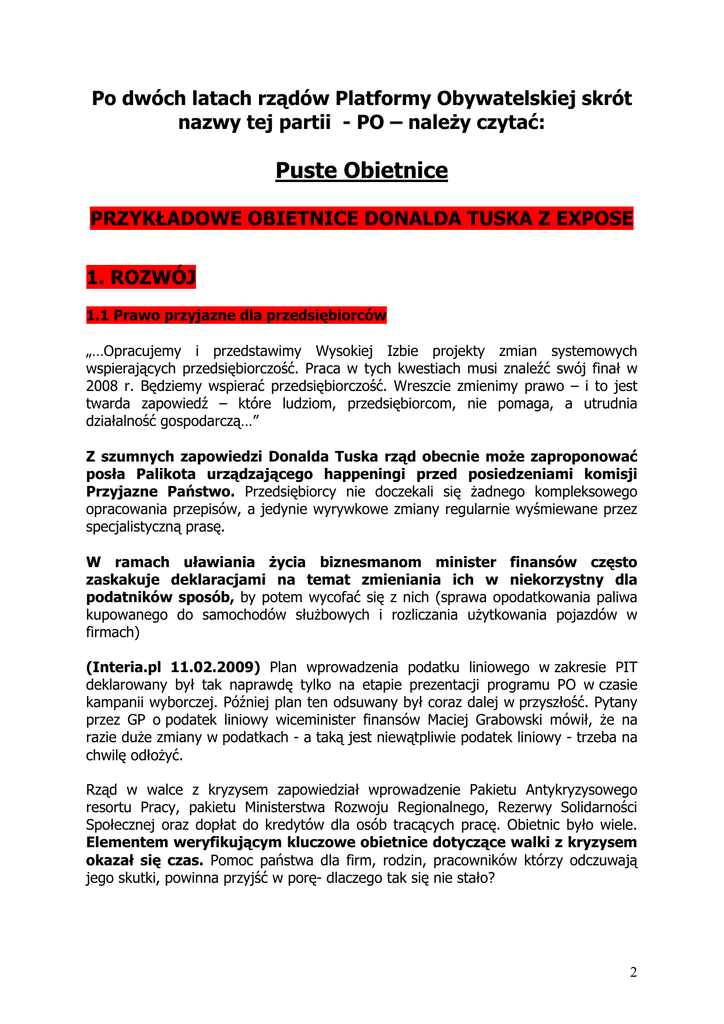 Po dwóch latach rządów Platformy Obywatelskiej skrót nazwy tej partii - PO – należy czytać: Puste Obietnice PRZYKŁADOWE OBIETNICE DONALDA TUSKA Z EXPOSE 1. ROZWÓJ 1.1 Prawo przyjazne dla przedsiębiorców „…Opracujemy i przedstawimy Wysokiej Izbie projekty zmian systemowych wspierających przedsiębiorczość. Praca w tych kwestiach musi znaleźć swój finał w 2008 r. Będziemy wspierać przedsiębiorczość. Wreszcie zmienimy prawo – i to jest twarda zapowiedź – które ludziom, przedsiębiorcom, nie pomaga, a utrudnia działalność gospodarczą…” Z szumnych zapowiedzi Donalda Tuska rząd obecnie może zaproponować posła Palikota urządzającego happeningi przed posiedzeniami komisji Przyjazne Państwo. Przedsiębiorcy nie doczekali się żadnego kompleksowego opracowania przepisów, a jedynie wyrywkowe zmiany regularnie wyśmiewane przez specjalistyczną prasę. W ramach uławiania życia biznesmanom minister finansów często zaskakuje deklaracjami na temat zmieniania ich w niekorzystny dla podatników sposób, by potem wycofać się z nich (sprawa opodatkowania paliwa kupowanego do samochodów służbowych i rozliczania użytkowania pojazdów w firmach) (Interia.pl 11.02.2009) Plan wprowadzenia podatku liniowego w zakresie PIT deklarowany był tak naprawdę tylko na etapie prezentacji programu PO w czasie kampanii wyborczej. Później plan ten odsuwany był coraz dalej w przyszłość. Pytany przez GP o podatek liniowy wiceminister finansów Maciej Grabowski mówił, że na razie duże zmiany w podatkach - a taką jest niewątpliwie podatek liniowy - trzeba na chwilę odłożyć. Rząd w walce z kryzysem zapowiedział wprowadzenie Pakietu Antykryzysowego resortu Pracy, pakietu Ministerstwa Rozwoju Regionalnego, Rezerwy Solidarności Społecznej oraz dopłat do kredytów dla osób tracących pracę. Obietnic było wiele. Elementem weryfikującym kluczowe obietnice dotyczące walki z kryzysem okazał się czas. Pomoc państwa dla firm, rodzin, pracowników którzy odczuwają jego skutki, powinna przyjść w porę- dlaczego tak się nie stało? 2 - po dopłaty do kredytów przeznaczone dla tracących pracę zgłosiło się 631 osób; - tylko 63 firmy chcą uzyskać dopłaty do wynagrodzeń dla pracowników; - rezerwa dla najuboższych, do której trafiły pieniądze z wyższej akcyzy, została zlikwidowana, mimo że podniesiono akcyzę na ten cel, pieniądze z niej, ok. 1,1mld. zł. nie trafiły do najuboższych, ale łatają budżet. Możliwość uzyskania dopłat jest obwarowana tak wyśrubowanymi wymogami, że wiele firm nie będzie z nich korzystać. Firmy upadają nim dostaną pomoc. Pracownicy są zwalniani, zamiast pobierać dopłaty do ich pensji, rodziny zaciągają kredyty na spłaty poprzednich zobowiązań- a rząd obiecywał, że w trudnych chwilach nie zostawi ich samych. Wiec to kolejny tylko szumnie zapowiadany projekt marketingowy. 1.2 Szybka i prosta rejestracja firm – jedno okienko „…Wprowadzenie, ale wreszcie na serio, zasady jednego okienka przy zakładaniu firmy…” Premierowi coś się pomyliło – jest jedno okienko ale w czterech urzędach. Przedsiębiorcy dalej spędzają całe dnie na gonitwach między urzędami. 1.3 Bezpieczne emerytury – Fundusz Rezerwy Demograficznej „…w tym przeznaczenie części przychodów z prywatyzacji na istotne cele dla obywateli, w szczególności na Fundusz Rezerwy Demograficznej, nazywany przez nas „Bezpieczną emeryturą”, staną się podstawą odbudowywania społecznego przyzwolenia na prywatyzację…” Donald Tusk zrobił zupełnie coś innego niż zapowiadał. Postanowił załatać dziurę budżetową pożyczając pieniądze właśnie z Funduszu Rezerwy Demograficznej. Mają one pójść na wydatki ZUS. Zamiast worka z pieniędzmi dla przyszłych pokoleń za jakiś czas znajdziemy pusty portfel angielskiego gentelmana – ministra Rostowskiego. W budżecie na 2009 r. przewidziana jest minimalna waloryzacja rent i emerytur. Rada Ministrów zaakceptowała propozycję pozostawienia wskaźnika waloryzacji emerytur i rent w 2010 r. na poziomie ustawowego minimum. A ceny rosną. Ciekawe czy D. Tusk wie ile teraz kosztuje chleb, kurczaki etc. FUS otrzyma w 2010 roku dotację z budżetu w wysokości 37,9 mld zł. Mimo to zabraknie mu na wypłatę świadczeń. Nie wystarczy nawet dodatkowe 7,5 mld zł, które rząd ma przenieść z Funduszu Rezerwy Demograficznej. 3 1.4 Rozwój dzięki funduszom z UE W 2008 roku z kwoty 280 mld zł (67 mld euro) wydaliśmy jedynie 1 mld zł. na rok 2009 Pani minister Bińkowska zaplanował wydać 17 mld zł. czyli 17 razy więcej i pewnie stąd optymizm Pani minister - na papierze wszystko ładnie wygląda. Minęło już 1/3 czasu na wykorzystanie tych środków jeśli nic się nie zmieni i będziemy wykorzystywać środki z UE w tym tempie co dotychczas to znaczna część tych 280 mld zł. przejdzie nam niestety koło nosa. Szczególnie wolno są wydawane środki na duże inwestycje Infrastrukturalne. Na 260 dużych projektów, tylko 22 projekty zostały wysłane do akceptacji do Komisji Europejskiej. Nie wiemy ile z nich zostało zaakceptowane. 1.5 Wejście do strefy euro „…Pewnym ukoronowaniem działań na rzecz przywrócenia gospodarce pełnej stabilności i zdolności do szybkiego wzrostu będzie przyjęcie przez Polskę wspólnej waluty europejskiej, czyli wejście do strefy euro…” Premier obiecał nam wspólną walutę i rekordowy sprint przez korytarz ERM2. Rządowa sztafeta już na pierwszej prostej rymsnęła z wielkim hukiem na murawę. EURO było tylko PR-owską zagrywką, jednym z licznych balonów propagandowych PO wypuszczonym by odwrócić uwagę opinii publicznej od kłopotów rządu. 1.6 Ograniczenie zwiększania długu publicznego „…Państwo, które żyje na kredyt, nie będzie dla obywateli godne zaufania. Deficyt budżetu oznacza stały wzrost długu publicznego (…) Żeby zbudować w tej dziedzinie zaufanie społeczne, 