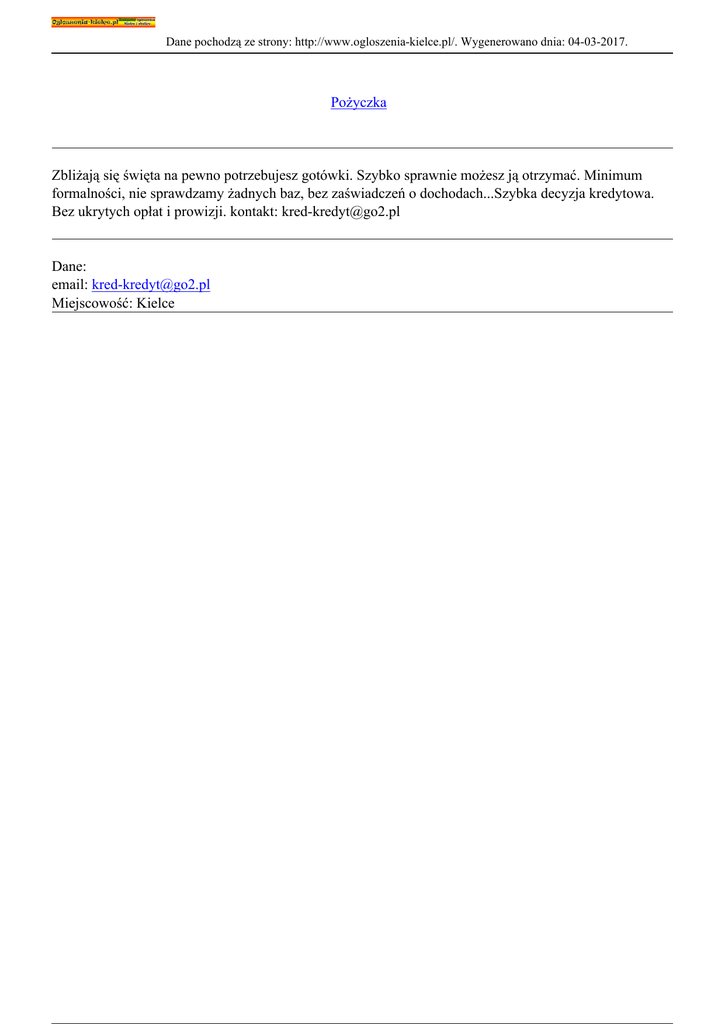 Dane pochodzą ze strony: http://www.ogloszenia-kielce.pl/. Wygenerowano dnia: 04-03-2017. Pożyczka Zbliżają się święta na pewno potrzebujesz gotówki. Szybko sprawnie możesz ją otrzymać. Minimum formalności, nie sprawdzamy żadnych baz, bez zaświadczeń o dochodach...Szybka decyzja kredytowa. Bez ukrytych opłat i prowizji. kontakt: [email protected] Dane: email: [email protected] Miejscowość: Kielce