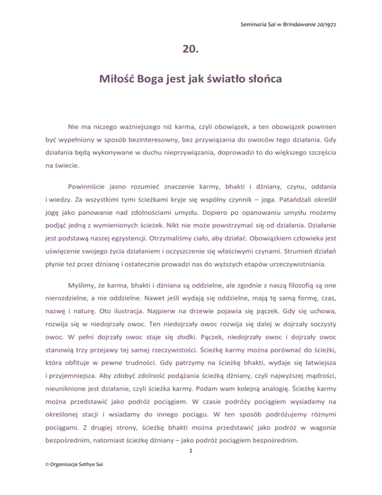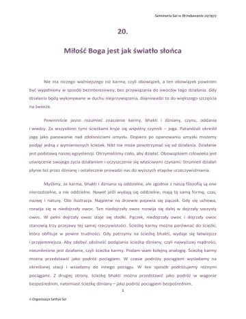 Seminaria Sai w Brindawanie 20/1972 20. Miłość Boga jest jak światło słońca Nie ma niczego ważniejszego niż karma, czyli obowiązek, a ten obowiązek powinien być wypełniony w sposób bezinteresowny, bez przywiązania do owoców tego działania. Gdy działania będą wykonywane w duchu nieprzywiązania, doprowadzi to do większego szczęścia na świecie. Powinniście jasno rozumieć znaczenie karmy, bhakti i dżniany, czynu, oddania i wiedzy. Za wszystkimi tymi ścieżkami kryje się wspólny czynnik – joga. Patańdżali określił jogę jako panowanie nad zdolnościami umysłu. Dopiero po opanowaniu umysłu możemy podjąć jedną z wymienionych ścieżek. Nikt nie może powstrzymać się od działania. Działanie jest podstawą naszej egzystencji. Otrzymaliśmy ciało, aby działać. Obowiązkiem człowieka jest uświęcenie swojego życia działaniem i oczyszczenie się właściwymi czynami. Strumień działań płynie też przez dżnianę i ostatecznie prowadzi nas do wyższych etapów urzeczywistniania. Myślimy, że karma, bhakti i dżniana są oddzielne, ale zgodnie z naszą filozofią są one nierozdzielne, a nie oddzielne. Nawet jeśli wydają się oddzielne, mają tę samą formę, czas, nazwę i naturę. Oto ilustracja. Najpierw na drzewie pojawia się pączek. Gdy się uchowa, rozwija się w niedojrzały owoc. Ten niedojrzały owoc rozwija się dalej w dojrzały soczysty owoc. W pełni dojrzały owoc staje się słodki. Pączek, niedojrzały owoc i dojrzały owoc stanowią trzy przejawy tej samej rzeczywistości. Ścieżkę karmy można porównać do ścieżki, która obfituje w pewne trudności. Gdy patrzymy na ścieżkę bhakti, wydaje się łatwiejsza i przyjemniejsza. Aby zdobyć zdolność podążania ścieżką dżniany, czyli najwyższej mądrości, nieuniknione jest działanie, czyli ścieżka karmy. Podam wam kolejną analogię. Ścieżkę karmy można przedstawić jako podróż pociągiem. W czasie podróży pociągiem wysiadamy na określonej stacji i wsiadamy do innego pociągu. W ten sposób podróżujemy różnymi pociągami. Z drugiej strony, ścieżkę bhakti można przedstawić jako podróż w wagonie bezpośrednim, natomiast ścieżkę dżniany – jako podróż pociągiem bezpośrednim. 1 © Organizacja Sathya Sai Seminaria Sai w Brindawanie 20/1972 Chociaż ścieżka karmy jest trudna, dostarcza nam różnorodnych doświadczeń. Istnieją trzy rodzaje karmy: karma, wikarma i akarma. Zgodnie z Gitą są to trzy odgałęzienia. Karmę można nazwać zadekretowanym obowiązkiem. Wikarma dotyczy pewnych działań, które są zabronione. Jednak, jeśli podejmuje się takie zakazane działania w celu urzeczywistnienia Boga, stają się one uświęcone. O akarmie mówi się, że jest czystym lenistwem lub bezczynnością. Karmy są wyjaśnione w Gicie. Muszą one być wprowadzane w czyn, a nie tylko opisywane słowami. Karma jest naszym obowiązkiem od urodzenia. Gita nazywa człowieka karmadżą, co znaczy urodzonym dzięki karmie i dla niej. Moksza, czyli wyzwolenie, i dżanma, czyli narodziny, pochodzą od karmy. Bez karmy nie możemy spędzić nawet jednej minuty. Chociaż działanie przyjmuje zwykłą fizyczną postać, pomaga nam ono pożytecznie spędzać czas. Dopóki nasze pięć zmysłów ciała funkcjonuje właściwie, nie możemy nie podejmować takiego czy innego działania. Działanie zawsze prowadzi do nagrody lub owocu. Owocem działania jest reakcja, odbicie i oddźwięk samego działania. Ale Gita uczy, że działanie, jakie podejmujemy w celu urzeczywistnienia Boga, musi być wolne od jakichkolwiek względów na nagrodę lub owoce. Wszyscy głosiciele przesłań Gity mówią, że człowiek ma jedynie prawo do działania i że nie ma prawa domagać się owoców tego działania. Ale Gita nie mówi, że człowiek nie może cieszyć się owocami działania. Gita mówi, że człowiek powinien dobrowolnie zrezygnować z prawa do cieszenia się owocami działania. Nie mówi na phaleszu, czyli nie ma owoców. Mówi ma phaleszu – nie masz prawa do owoców; chociaż jest owoc, nakazuje się, aby zrezygnować z pragnienia owocu działania. Również w naszych świętych Wedach napisano, że człowiek osiąga prawdziwe szczęście dzięki dobrowolnej rezygnacji z pragnienia owocu. Można zastanawiać się, jak czerpać przyjemność z poświęcenia. Bez tjagi, czyli poświęcenia, nie może być ani bhogi, rozrywki, ani jogi, dyscypliny duchowej, lecz tylko roga, czyli choroba. Weźcie przykład z wdechu. Jeśli nie wypuścimy powietrza, które zaczerpnęliśmy, uszkodzimy płuca. Podobnie, jeśli nie wydalimy pożywienia, które spożyliśmy, dostaniemy rozstroju żołądka. Jeśli krew, która płynie przez tętnice, nie przepłynie przez jakiś określony punkt ciała, krew się tam zatrzyma i powstanie zapalenie ropne. Zatem, wszelkie nasze dobro jest nierozerwalnie związane z tjagą. Jeśli dziecko nie przejawia naturalnego wzrastania, matka bardzo się tym niepokoi. Porzucamy ciało, które odziedziczyliśmy przy narodzeniu, i przez wzrost poświęcamy pierwotny stan, osiągając nowy. Niezależnie czy 2 © Organizacja Sathya Sai Seminaria Sai w Brindawanie 20/1972 robimy to świadomie, czy nieświadomie, tjaga prowadzi nas do szczęścia. Poświęcenie darzy nas najwyższym zadowoleniem. Możemy nie potrafić poświęcić się z własnej woli, ale świadome poświęcenie prowadzi do wielkiego szczęścia. Nie wiemy, kiedy to ciało złożone z pięciu organów zmysłowych, podupadnie. Chociaż mówi się, że granicą jest sto lat, ale nie wierzcie w to. Możemy umrzeć w dzieciństwie, w młodości, w średnim wieku lub w starości. Tego nie wiemy. Nie wiemy też, czy umrzemy we własnej wiosce, czy w na pustyni. Śmierć jest pewna. Mądry człowiek w ciągu swojego życia musi zrozumieć prawdę i śmierć. Jeśli w ciągu życia porzucicie to dehabranti, iluzję ciała, będziecie mogli rozwinąć wyższe rozumienie, tjagabranti