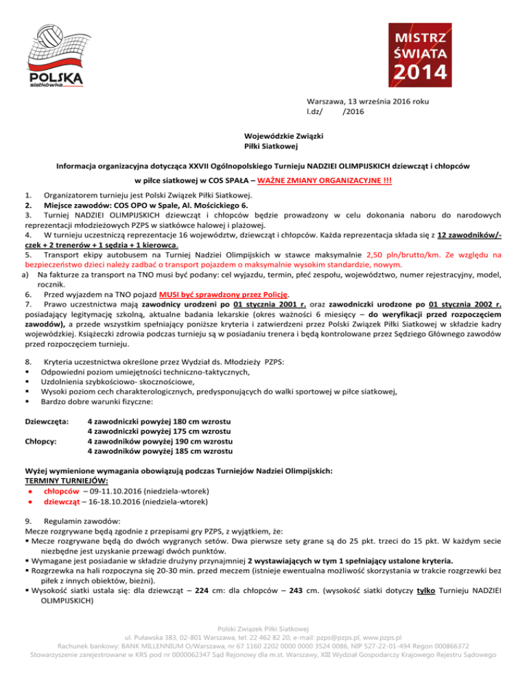 Warszawa, 13 września 2016 roku l.dz/ /2016 Wojewódzkie Związki Piłki Siatkowej Informacja organizacyjna dotycząca XXVII Ogólnopolskiego Turnieju NADZIEI OLIMPIJSKICH dziewcząt i chłopców w piłce siatkowej w COS SPAŁA – WAŻNE ZMIANY ORGANIZACYJNE !!! 1. Organizatorem turnieju jest Polski Związek Piłki Siatkowej. 2. Miejsce zawodów: COS OPO w Spale, Al. Mościckiego 6. 3. Turniej NADZIEI OLIMPIJSKICH dziewcząt i chłopców będzie prowadzony w celu dokonania naboru do narodowych reprezentacji młodzieżowych PZPS w siatkówce halowej i plażowej. 4. W turnieju uczestniczą reprezentacje 16 województw, dziewcząt i chłopców. Każda reprezentacja składa się z 12 zawodników/czek + 2 trenerów + 1 sędzia + 1 kierowca. 5. Transport ekipy autobusem na Turniej Nadziei Olimpijskich w stawce maksymalnie 2,50 pln/brutto/km. Ze względu na bezpieczeństwo dzieci należy zadbać o transport pojazdem o maksymalnie wysokim standardzie, nowym. a) Na fakturze za transport na TNO musi być podany: cel wyjazdu, termin, płeć zespołu, województwo, numer rejestracyjny, model, rocznik. 6. Przed wyjazdem na TNO pojazd MUSI być sprawdzony przez Policję. 7. Prawo uczestnictwa mają zawodnicy urodzeni po 01 stycznia 2001 r. oraz zawodniczki urodzone po 01 stycznia 2002 r. posiadający legitymację szkolną, aktualne badania lekarskie (okres ważności 6 miesięcy – do weryfikacji przed rozpoczęciem zawodów), a przede wszystkim spełniający poniższe kryteria i zatwierdzeni przez Polski Związek Piłki Siatkowej w składzie kadry wojewódzkiej. Książeczki zdrowia podczas turnieju są w posiadaniu trenera i będą kontrolowane przez Sędziego Głównego zawodów przed rozpoczęciem turnieju. 8. Kryteria uczestnictwa określone przez Wydział ds. Młodzieży PZPS: Odpowiedni poziom umiejętności techniczno-taktycznych, Uzdolnienia szybkościowo- skocznościowe, Wysoki poziom cech charakterologicznych, predysponujących do walki sportowej w piłce siatkowej, Bardzo dobre warunki fizyczne: Dziewczęta: Chłopcy: 4 zawodniczki powyżej 180 cm wzrostu 4 zawodniczki powyżej 175 cm wzrostu 4 zawodników powyżej 190 cm wzrostu 4 zawodników powyżej 185 cm wzrostu Wyżej wymienione wymagania obowiązują podczas Turniejów Nadziei Olimpijskich: TERMINY TURNIEJÓW: chłopców – 09-11.10.2016 (niedziela-wtorek) dziewcząt – 16-18.10.2016 (niedziela-wtorek) 9. Regulamin zawodów: Mecze rozgrywane będą zgodnie z przepisami gry PZPS, z wyjątkiem, że: Mecze rozgrywane będą do dwóch wygranych setów. Dwa pierwsze sety grane są do 25 pkt. trzeci do 15 pkt. W każdym secie niezbędne jest uzyskanie przewagi dwóch punktów. Wymagane jest posiadanie w składzie drużyny przynajmniej 2 wystawiających w tym 1 spełniający ustalone kryteria. Rozgrzewka na hali rozpoczyna się 20-30 min. przed meczem (istnieje ewentualna możliwość skorzystania w trakcie rozgrzewki bez piłek z innych obiektów, bieżni). Wysokość siatki ustala się: dla dziewcząt – 224 cm: dla chłopców – 243 cm. (wysokość siatki dotyczy tylko Turnieju NADZIEI OLIMPIJSKICH) Polski Związek Piłki Siatkowej ul. Puławska 383, 02-801 Warszawa, tel: 22 462 82 20, e-mail: [email protected], www.pzps.pl Rachunek bankowy: BANK MILLENNIUM O/Warszawa, nr 67 1160 2202 0000 0000 3524 0086, NIP 527-22-01-494 Regon 000866372 Stowarzyszenie zarejestrowane w KRS pod nr 0000062347 Sąd Rejonowy dla m.st. Warszawy, XIII Wydział Gospodarczy Krajowego Rejestru Sądowego Mecze rozgrywane będą piłkami MOLTEN V5M 5000. (Piłki do gry zabezpiecza PZPS, zaś piłki do rozgrzewki podczas turnieju każde województwo dla siebie !!!). Podczas TNO 2016 obowiązują następujące zmiany do przepisów gry gra bez zawodnika LIBERO, sposób zagrywki dowolny (zgodnie z przepisami gry w piłkę siatkową), obowiązek gry w I i II secie różnymi szóstkami. W III secie nie ma ograniczeń w składzie - decyduje trener. 10. W dniu przyjazdu (o godz. 14:00) odbędzie się odprawa techniczna, sprawdzenie dokumentów. Po odprawie zaczną się mecze. Sprawdziany i testy sprawnościowe zostaną przeprowadzone przez drugich trenerów poszczególnych zespołów w następnym dniu od rana w kolejności alfabetycznej województw. 11. Warunkiem dopuszczenia do turnieju jest przesłanie mailem na adres: [email protected] wypełnionych druków w zakresie danych WZPS-ów oraz pełnych danych osobowych zawodników/-czek: –Załacznik_1_TNO_2016 oraz Załacznik_2_TNO_2016 (wzory druków zostaną przesłane do WZPS-ów oraz są dostępne na stronie www.pzps.pl ) 12. Losowanie komisyjne grup odbędzie się w PZPS na podstawie wyników Turniejów Nadziei Olimpijskich z ostatnich 3 lat. 13. Wszystkie koszty województwa pokrywają ze środków uzyskanych na ten cel (szkolenie Kadr Nadziei Olimpijskich) z PZPS. 14. Delegowanie sędziego na TNO przez WZPS-y jest obligatoryjne. Sędziami na turniej powinni być kandydaci na szczebel centralny, którzy nominację na turniej uzyskują od Wydziału Sędziowskiego właściwego WZPS-u. Z województwa – obowiązkowo jeden sędzia na KAŻDY Z TURNIEJÓW !!!. (czyli 1 sędzia na turniej chłopców i 1 sędzia na turniej dziewcząt z każdego województwa !!!). Nie wysłanie sędziego komplikuje rozgrywanie meczów, przez co zmniejsza możliwość prowadzenia zawodów na odpowiednio wysokim poziomie. W takim przypadku WZPS który nie przysłał sędziego wg. poniższego podziału zostanie obciążony kosztami pobytu na rzecz WZPS który w zastępstwie przyśle sędziego. W dniu przyjazdu o godz. 14:00 odbędzie się zebranie organizacyjne - w sali konferencyjnej na parterze za stołówką (proszę o przygotowanie książeczek zdrowia zawodników/-czek, wypełnionych druków adresowych oraz list z numerami na koszulkach – wymagane jest, aby każdy zawodnik/-czka posiadał TEN SAM NUMER NA WSZYSTKICH KOSZULKACH MECZOWYCH !!!). W poniedziałek od rana pomiary i sprawdziany odbędą się w godz. 08:15 do godz. 11:0