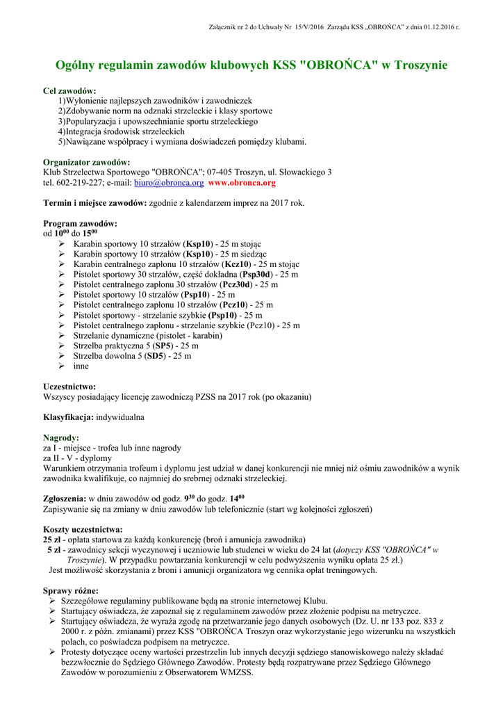 Załącznik nr 2 do Uchwały Nr 15/V/2016 Zarządu KSS „OBROŃCA” z dnia 01.12.2016 r. Ogólny regulamin zawodów klubowych KSS "OBROŃCA" w Troszynie Cel zawodów: 1)Wyłonienie najlepszych zawodników i zawodniczek 2)Zdobywanie norm na odznaki strzeleckie i klasy sportowe 3)Popularyzacja i upowszechnianie sportu strzeleckiego 4)Integracja środowisk strzeleckich 5)Nawiązane współpracy i wymiana doświadczeń pomiędzy klubami. Organizator zawodów: Klub Strzelectwa Sportowego "OBROŃCA"; 07-405 Troszyn, ul. Słowackiego 3 tel. 602-219-227; e-mail: [email protected] www.obronca.org Termin i miejsce zawodów: zgodnie z kalendarzem imprez na 2017 rok. Program zawodów: od 1000 do 1500 Ø Karabin sportowy 10 strzałów (Ksp10) - 25 m stojąc Ø Karabin sportowy 10 strzałów (Ksp10) - 25 m siedząc Ø Karabin centralnego zapłonu 10 strzałów (Kcz10) - 25 m stojąc Ø Pistolet sportowy 30 strzałów, część dokładna (Psp30d) - 25 m Ø Pistolet centralnego zapłonu 30 strzałów (Pcz30d) - 25 m Ø Pistolet sportowy 10 strzałów (Psp10) - 25 m Ø Pistolet centralnego zapłonu 10 strzałów (Pcz10) - 25 m Ø Pistolet sportowy - strzelanie szybkie (Psp10) - 25 m Ø Pistolet centralnego zapłonu - strzelanie szybkie (Pcz10) - 25 m Ø Strzelanie dynamiczne (pistolet - karabin) Ø Strzelba praktyczna 5 (SP5) - 25 m Ø Strzelba dowolna 5 (SD5) - 25 m Ø inne Uczestnictwo: Wszyscy posiadający licencję zawodniczą PZSS na 2017 rok (po okazaniu) Klasyfikacja: indywidualna Nagrody: za I - miejsce - trofea lub inne nagrody za II - V - dyplomy Warunkiem otrzymania trofeum i dyplomu jest udział w danej konkurencji nie mniej niż ośmiu zawodników a wynik zawodnika kwalifikuje, co najmniej do srebrnej odznaki strzeleckiej. Zgłoszenia: w dniu zawodów od godz. 930 do godz. 1400 Zapisywanie się na zmiany w dniu zawodów lub telefonicznie (start wg kolejności zgłoszeń) Koszty uczestnictwa: 25 zł - opłata startowa za każdą konkurencję (broń i amunicja zawodnika) 5 zł - zawodnicy sekcji wyczynowej i uczniowie lub studenci w wieku do 24 lat (dotyczy KSS "OBROŃCA" w Troszynie). W przypadku powtarzania konkurencji w celu podwyższenia wyniku opłata 25 zł.) Jest możliwość skorzystania z broni i amunicji organizatora wg cennika opłat treningowych. Sprawy różne: Ø Szczegółowe regulaminy publikowane będą na stronie internetowej Klubu. Ø Startujący oświadcza, że zapoznał się z regulaminem zawodów przez złożenie podpisu na metryczce. Ø Startujący oświadcza, że wyraża zgodę na przetwarzanie jego danych osobowych (Dz. U. nr 133 poz. 833 z 2000 r. z późn. zmianami) przez KSS "OBROŃCA Troszyn oraz wykorzystanie jego wizerunku na wszystkich polach, co poświadcza podpisem na metryczce. Ø Protesty dotyczące oceny wartości przestrzelin lub innych decyzji sędziego stanowiskowego należy składać bezzwłocznie do Sędziego Głównego Zawodów. Protesty będą rozpatrywane przez Sędziego Głównego Zawodów w porozumieniu z Obserwatorem WMZSS. Załącznik nr 2 do Uchwały Nr 15/V/2016 Zarządu KSS „OBROŃCA” z dnia 01.12.2016 r. Ø Reklamacje dotyczące błędów pisarskich uczestnik zawodów może składać w ciągu 7 dni od zamieszczenia komunikatu z zawodów na stronie internetowej Klubu. Ø W zawodach obowiązują aktualne przepisy bezpieczeństwa, przepisy strzeleckie i powyższy regulamin. Ø Zakończenie zawodów nastąpi 30 minut po ostatniej zmianie strzelań. Ø Zawody z udziałem Obserwatora WZSS (oznaczono "X" w kalendarzu imprez). Przebieg Finału - "Puchar Prezesa" Ø Seria finałowa traktowana jest, jako osobna konkurencja Ø Do finału w każdej konkurencji kwalifikują się zawodnicy (tylko członkowie KSS "OBROŃCA"), którzy uczestniczyli, w dwóch osobo startach tej samej konkurencji na zawodach klubowych zaliczanych do "Pucharu Prezesa". Ø Finał przeprowadzany jest zgodnie z regulaminami PZSS w konkurencjach rozgrywanych na strzelnicy w Troszynie. Ø Przeprowadza się jedną klasyfikację dla kobiet i mężczyzn razem. Ø Ostateczny wynik jest sumą dwóch najlepszych wyników w danej konkurencji i serii finałowej. Puchar Prezesa 30/30 - Finał - zgodnie z przepisami ISSF. Do finału kwalifikuje się pięciu zawodników z najwyższymi wynikami Edycji 1, 2 i 3 Wyróżnienia: • Za zajęcie I - III miejsca - puchary lub inne trofea • Za zajęcie I - V miejsca - dyplomy • Przewiduje się nagrody specjalne (szczegóły w regulaminach danych zawodów)