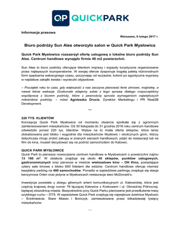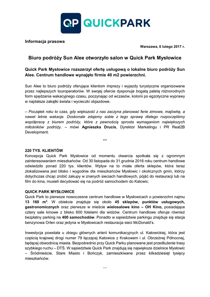 Informacja prasowa Warszawa, 6 lutego 2017 r. Biuro podróży Sun Alee otworzyło salon w Quick Park Mysłowice Quick Park Mysłowice rozszerzył ofertę usługową o lokalne biuro podróży Sun Alee. Centrum handlowe wynajęło firmie 40 m2 powierzchni. Sun Alee to biuro podróży oferujące klientom imprezy i wyjazdy turystyczne organizowane przez najlepszych touroperatorów. W swojej ofercie dysponuje bogatą paletą różnorodnych form spędzania wakacyjnego czasu, poczynając od wczasów, kolonii po egzotyczne wyprawy w najdalsze zakątki świata i wycieczki objazdowe. – Początek roku to czas, gdy większość z nas zaczyna planować ferie zimowe, majówkę, a nawet letnie wakacje. Doskonale zdajemy sobie z tego sprawę dlatego rozpoczęliśmy współpracę z biurem podróży, które z pewnością sprosta wymaganiom największych miłośników podróży. – mówi Agnieszka Drucis, Dyrektor Marketingu i PR Real2B Development. *** 220 TYS. KLIENTÓW Koncepcja Quick Park Mysłowice od momentu otwarcia spotkała się z ogromnym zainteresowaniem mieszkańców. Od 30 listopada do 31 grudnia 2016 roku centrum handlowe odwiedziło ponad 220 tys. klientów. Wpływ na to miała oferta sklepów, która teraz zlokalizowana jest blisko i wygodnie dla mieszkańców Mysłowic i okolicznych gmin, którzy dotychczas chcąc zrobić zakupy w znanych sieciach handlowych, pójść do restauracji lub na film do kina, musieli decydować się na podróż samochodem do Katowic. QUICK PARK MYSŁOWICE Quick Park to pierwsze nowoczesne centrum handlowe w Mysłowicach o powierzchni najmu 13 160 m2. W obiekcie znajduje się około 45 sklepów, punktów usługowych, gastronomicznych oraz pierwsze w mieście wielosalowe kino – OH Kino, posiadające cztery sale kinowe z blisko 600 fotelami dla widzów. Centrum handlowe oferuje również bezpłatny parking na 400 samochodów. Ponadto w sąsiedztwie parkingu znajduje się stacja benzynowa Orlen oraz jedyna w Mysłowicach restauracja sieci McDonald’s. Inwestycja powstała u zbiegu głównych arterii komunikacyjnych ul. Katowickiej, która jest częścią krajowej drogi numer 79 łączącej Katowice z Krakowem i ul. Obrzeżnej Północnej, będącej obwodnicą miasta. Bezpośrednio przy Quick Parku planowane jest przedłużenie trasy szybkiego ruchu – DTŚ. W sąsiedztwie Quick Park znajdują się największe dzielnice Mysłowic – Śródmieście, Stare Miasto i Bończyk, zamieszkiwane przez kilkadziesiąt tysięcy mieszkańców. *** Deweloperem obiektu jest Real2B Development Sp. z o. o., która wspólnie z inwestorami: Retail Parks Fund FIZ AN oraz renomowanymi bankami, realizuje sieć kilkudziesięciu regionalnych hybrydowych centrów handlowych pod nazwą Quick Park na terenie całego kraju. Cechą charakterystyczną Quick Parków jest ich usytuowanie bezpośrednio przy głównych arteriach komunikacyjnych oraz przy największych osiedlach mieszkaniowych. Quick Parki dedykowane są mieszkańcom mniejszych miejscowości – do 100 tys. ludności, którzy wzorem wielkich miast, będą mogli na co dzień korzystać z możliwości i atrakcji, jakie oferują centra handlowe. Wszystko to w jednym miejscu z kwadransem na dojazd. W listopadzie 2016 r. zostały otwarte pierwsze w Polsce tego typu obiekty: Quick Park Strzegom i Quick Park Mysłowice. W przygotowaniach i realizacji są także obiekty w Sulechowie, Olkuszu, Oławie, Pułtusku, Kępnie, Turku oraz Konstancinie-Jeziorna. *** Zarządcą obiektu jest Property2B Sp. z o.o., firma powołana do kompleksowego zarządzania obiektami komercyjnymi. Świadczy ona pełny zakres obsługi nieruchomości, w tym m. in. audyty techniczne, rekomercjalizacje, HR, prowadzenie ksiąg rachunkowych, budżetowanie, rozliczanie opłat wspólnych i kontrolę należności. Property2B zatrudnia najlepszych ludzi w branży, którzy trwale umacniają relacje z najemcami. *** Grupa Real2B powstała w 2013 roku. Tworzą ją Real2B Development – firma deweloperskoinwestycyjna, która wspólnie z inwestorem Retail Parks Fund FIZ AN tworzy ogólnopolską sieć Quick Parków. Property2B, które zarządza Funduszem RPF FIZ AN oraz nadzoruje jego spółki portfelowe. Capital2B świadczący kompleksowe usługi z zakresu finansowania inwestycji. *** Kontakt dla mediów: Arkadiusz Cegiełka Agnieszka Drucis multiAN PR Real 2B Development tel. 504 354 106 tel. 609 112 484 e-mail: [email protected] e-mail: [email protected]