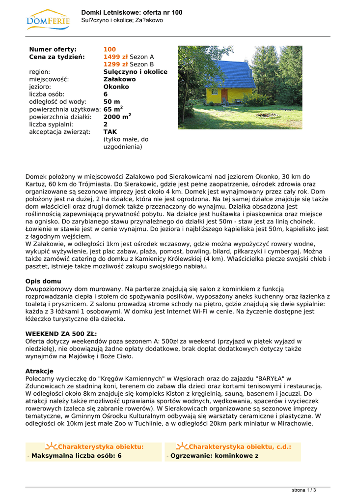 Domki Letniskowe: oferta nr 100 Sul?czyno i okolice; Za?akowo Numer oferty: Cena za tydzień: 100 1499 zł Sezon A 1299 zł Sezon B region: Sulęczyno i okolice miejscowość: Załakowo jezioro: Okonko liczba osób: 6 odległość od wody: 50 m powierzchnia użytkowa: 65 m2 powierzchnia działki: 2000 m2 liczba sypialni: 2 akceptacja zwierząt: TAK (tylko małe, do uzgodnienia) Domek położony w miejscowości Załakowo pod Sierakowicami nad jeziorem Okonko, 30 km do Kartuz, 60 km do Trójmiasta. Do Sierakowic, gdzie jest pełne zaopatrzenie, ośrodek zdrowia oraz organizowane są sezonowe imprezy jest około 4 km. Domek jest wynajmowany przez cały rok. Dom położony jest na dużej, 2 ha działce, która nie jest ogrodzona. Na tej samej działce znajduje się także dom właścicieli oraz drugi domek także przeznaczony do wynajmu. Działka obsadzona jest roślinnością zapewniającą prywatność pobytu. Na działce jest huśtawka i piaskownica oraz miejsce na ognisko. Do zarybianego stawu przynależnego do działki jest 50m - staw jest za linią choinek. Łowienie w stawie jest w cenie wynajmu. Do jeziora i najbliższego kąpieliska jest 50m, kąpielisko jest z łagodnym wejściem. W Załakowie, w odległości 1km jest ośrodek wczasowy, gdzie można wypożyczyć rowery wodne, wykupić wyżywienie, jest plac zabaw, plaża, pomost, bowling, bilard, piłkarzyki i cymbergaj. Można także zamówić catering do domku z Kamienicy Królewskiej (4 km). Właścicielka piecze swojski chleb i pasztet, istnieje także możliwość zakupu swojskiego nabiału. Opis domu Dwupoziomowy dom murowany. Na parterze znajdują się salon z kominkiem z funkcją rozprowadzania ciepła i stołem do spożywania posiłków, wyposażony aneks kuchenny oraz łazienka z toaletą i prysznicem. Z salonu prowadzą strome schody na piętro, gdzie znajdują się dwie sypialnie: każda z 3 łóżkami 1 osobowymi. W domku jest Internet Wi-Fi w cenie. Na życzenie dostępne jest łóżeczko turystyczne dla dziecka. WEEKEND ZA 500 ZŁ: Oferta dotyczy weekendów poza sezonem A: 500zł za weekend (przyjazd w piątek wyjazd w niedzielę), nie obowiązują żadne opłaty dodatkowe, brak dopłat dodatkowych dotyczy także wynajmów na Majówkę i Boże Ciało. Atrakcje Polecamy wycieczkę do "Kręgów Kamiennych" w Węsiorach oraz do zajazdu "BARYŁA" w Zdunowicach ze stadniną koni, terenem do zabaw dla dzieci oraz kortami tenisowymi i restauracją. W odległości około 8km znajduje się kompleks Kiston z kręgielnią, sauną, basenem i jacuzzi. Do atrakcji należy także możliwość uprawiania sportów wodnych, wędkowania, spacerów i wycieczek rowerowych (zaleca się zabranie rowerów). W Sierakowicach organizowane są sezonowe imprezy tematyczne, w Gminnym Ośrodku Kulturalnym odbywają się warsztaty ceramiczne i plastyczne. W odległości ok 10km jest małe Zoo w Tuchlinie, a w odległości 20km park miniatur w Mirachowie. Charakterystyka obiektu: - Maksymalna liczba osób: 6 Charakterystyka obiektu, c.d.: - Ogrzewanie: kominkowe z strona 1 / 3 Domki Letniskowe: oferta nr 100 Sul?czyno i okolice; Za?akowo - 1 Sypialnia: 3 łóżka 1os.: piętro - 2 Sypialnia: 3 łóżka 1os.: piętro - Bielizna pościelowa: 10zł/os/pobyt - Łazienka z prysznicem i toaletą: parter - Salon z kominkiem: parter - Aneks kuchenny: parter - Kuchenka: 4 palniki, gazowa - Czajnik: na kuchenkę - Ciepła woda: bojler - Lodówka: tak - TV: nC+ rozprowadzeniem - Zwierzęta domowe: tylko małe, do uzgodnienia* - Meble ogrodowe: komplet - Grill przenośny: tak - Kąpiel w jeziorze: 50 m - Wypożyczalnia sprzętu wodnego: 1 km - Wędkowanie: w cenie w stawie lub wykup zezwolenia u właścicieli - Bar: 1 km Lekarz: 4 km Sklep spożywczy: 2 km Stadnina koni: 7/12 km * działka nie jest ogrodzona CENNIK: Podana poniżej i wyróżniona na pomarańczowo cena jest całkowitą ceną wynajmu domu na 1 tydzień - od soboty do soboty (zawiera w sobie kwotę rezerwacji i zaliczki). Dodatkowo dolicza się podane niżej opłady obowiązkowe i/lub nieobowiązkowe. Sezon A Sezon B TYLKO Weekendy: 25.06. - 20.08.2011. Poza sezonem A 29.04 - 03.05 (4 doby) wynajem za 1 tydzień w tym: 1499 zł/tydz 1299 zł/tydz 250 zł/doba (minimum 2 doby) - rezerwacja 299 zł/tydz 199 zł/tydz 50 zł/doba - zaliczka 200 zł/tydz 200 zł/tydz 100 zł/2 doby OPŁATY DODATKOWE: 1. Zryczałtowana opłata za zużycie energii elektrycznej - 80zł/tydzień 2. Sprzątanie domu po zakończeniu turnusu 100 zł jeżeli najemca nie chce sam wykonać tej pracy 3. Bielizna pościelowa 10 zł/osoba/pobyt 4. Pierwszy wsad gratis, kolejna wiązka umowna 30zł 5. Każde zwierzę 50 zł/tydzień 6. Klimatyczne: 2 zł/dzień/osoba KAUCJA 300 zł Kaucja, pobierana przez właściciela w momencie przekazania kluczy, jest zwracana najemcy po potrąceniu kwoty opłat dodatkowych oraz ewentualnych uzasadnionych kosztów szkód powstałych z jego winy. strona 2 / 3 Domki Letniskowe: oferta nr 100 Sul?czyno i okolice; Za?akowo strona 3 / 3 Powered by TCPDF (www.tcpdf.org)